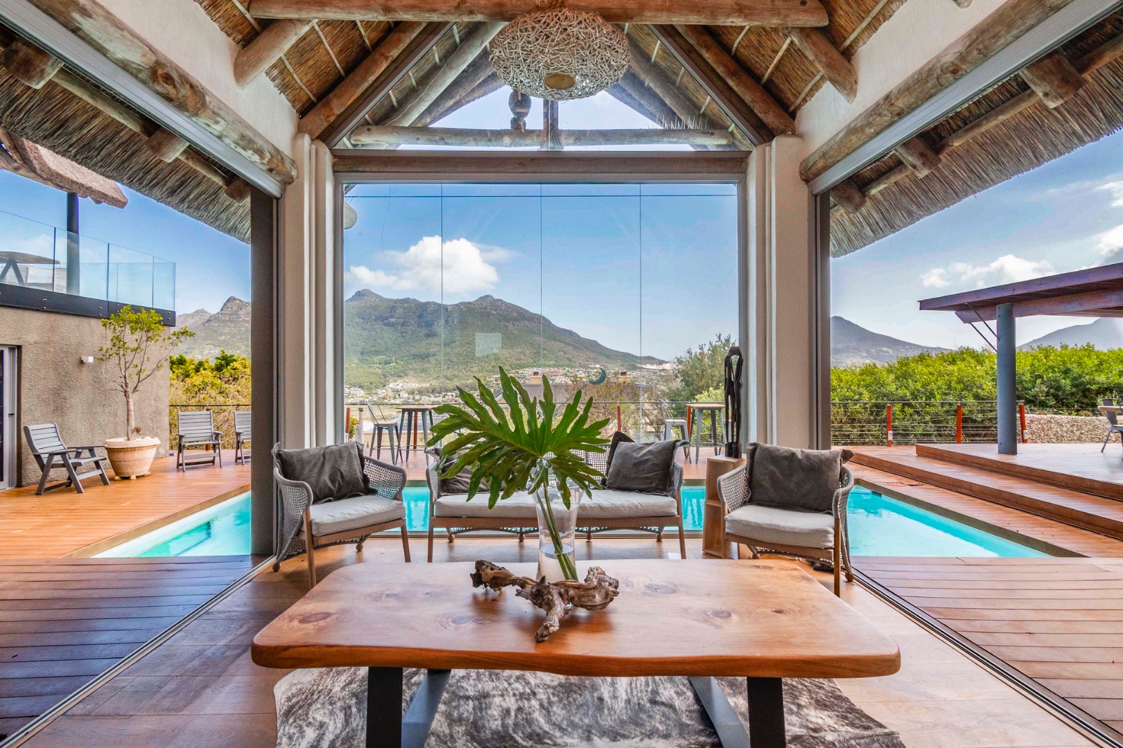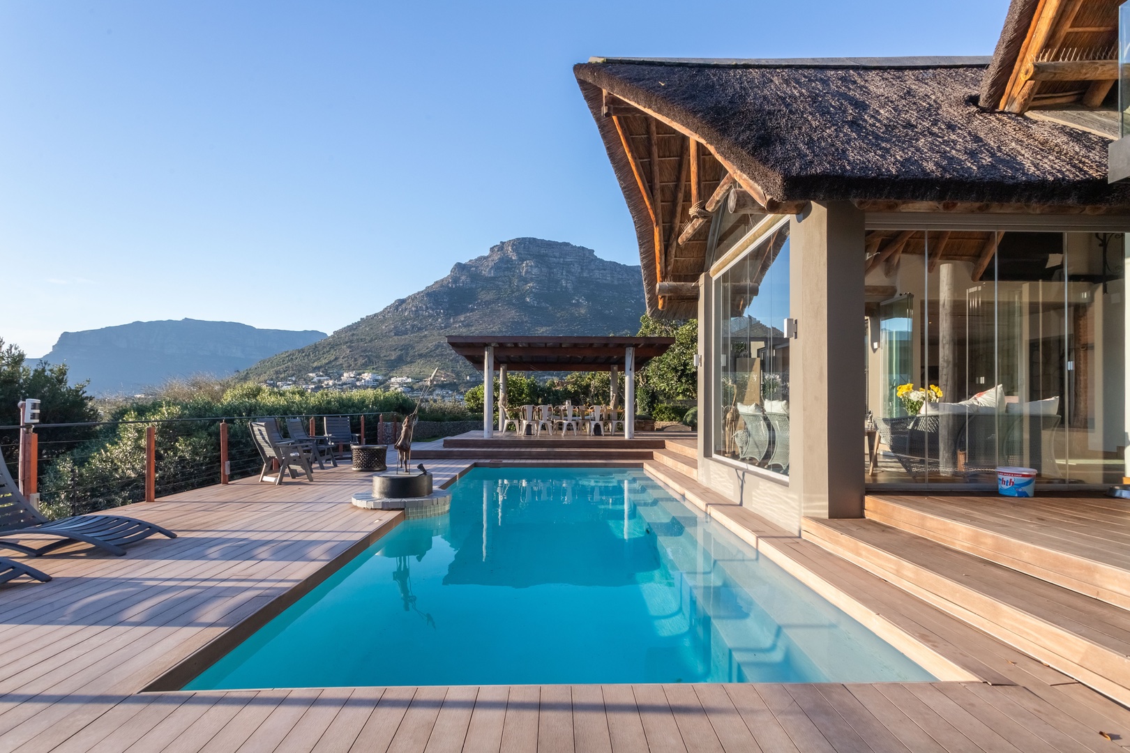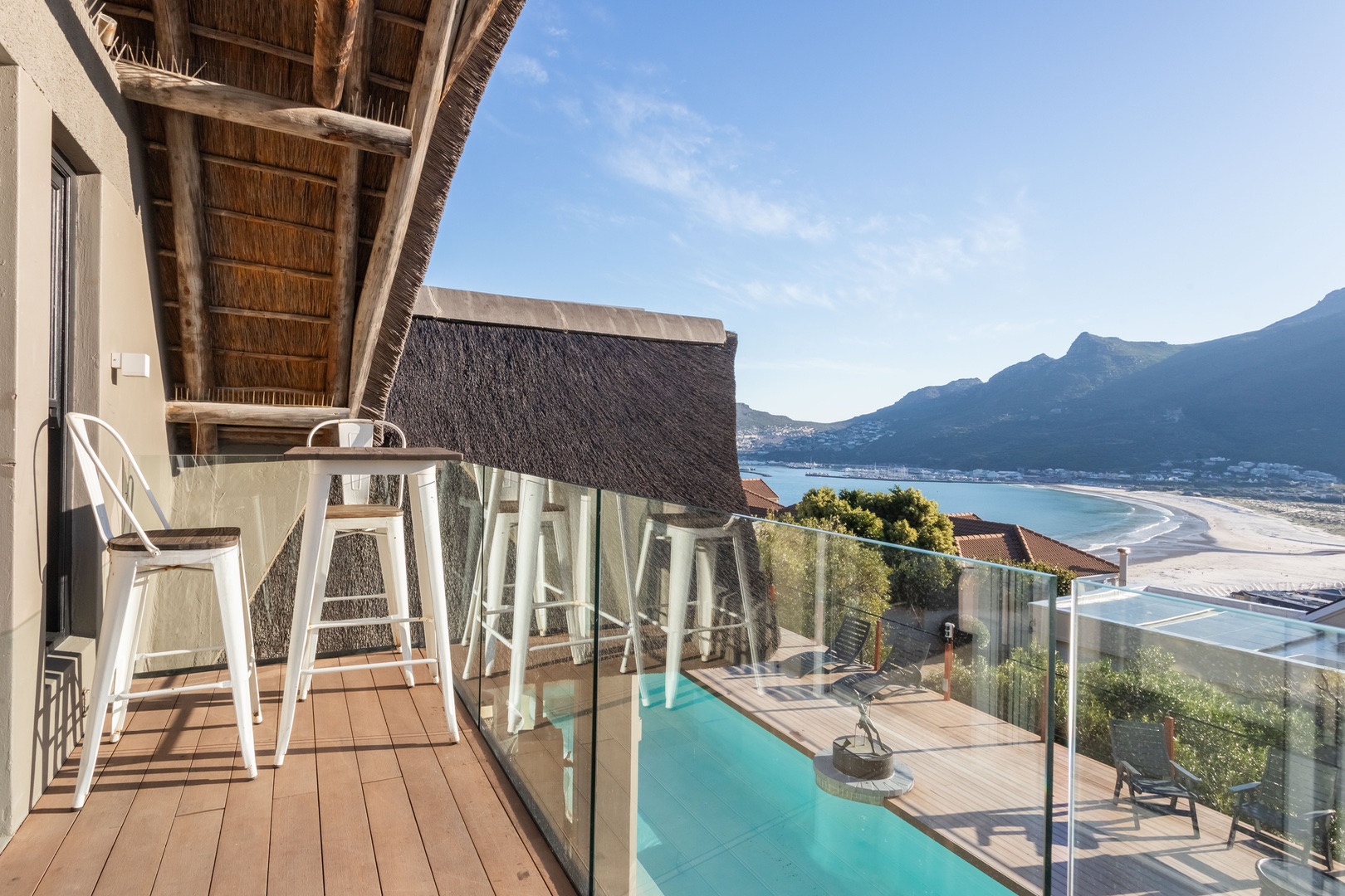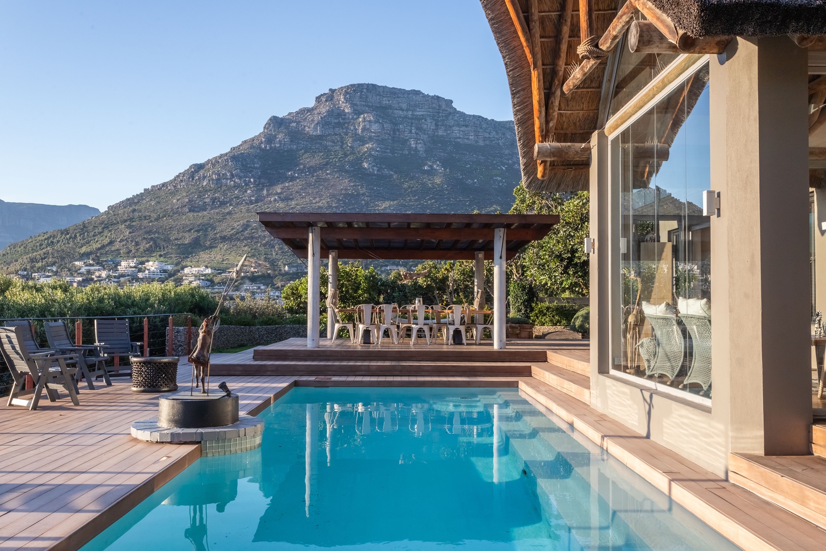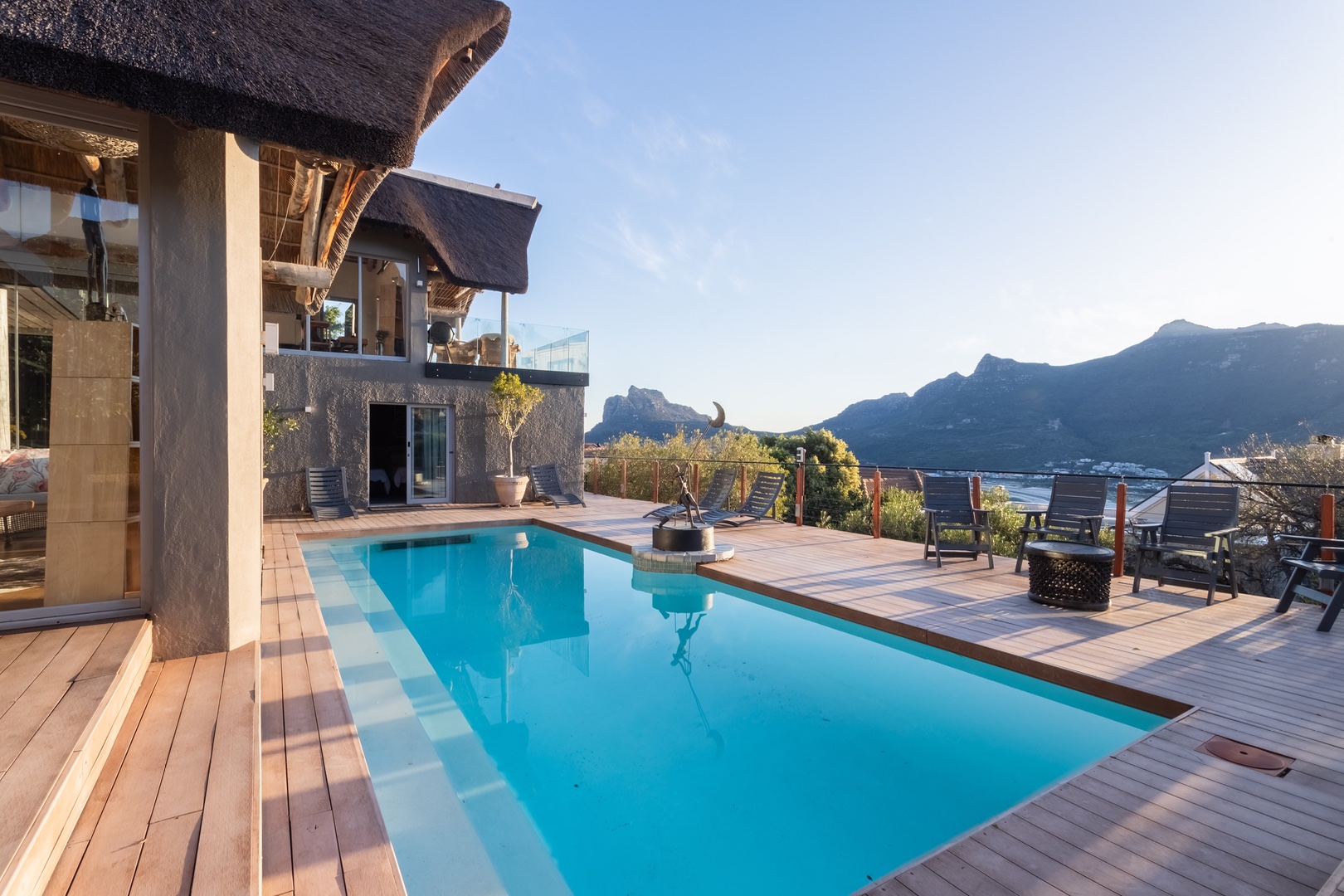 Perfectly positioned in a quiet cul du sac at the top of Hillcrest lies this beautiful home overlooking the azure ocean and white sandy bay backed onto the flourishing fynbos mountain reserve. On entrance you are drawn toward the magnificent views and sparkling pool, on this level there are floor to ceiling glass stacking doors all sides that gives you a sense of being at one with Mother Nature and maximises on the beauty that surrounds this unique home that has been carefully designed by the artistic owner and his architect
