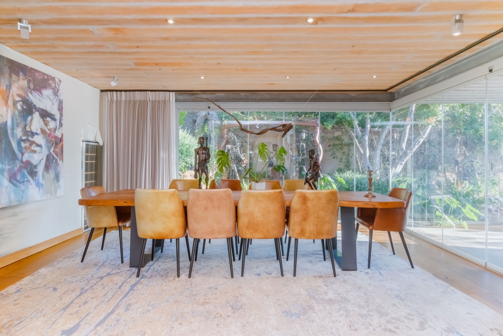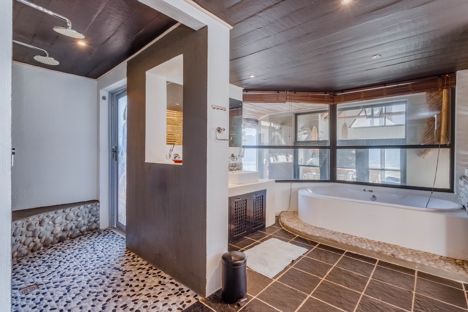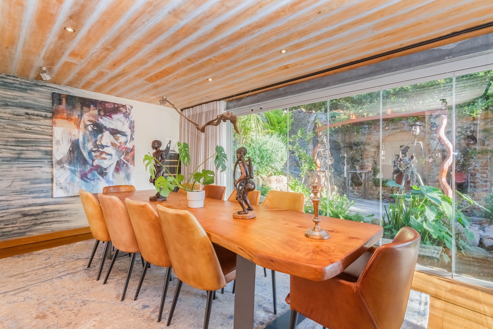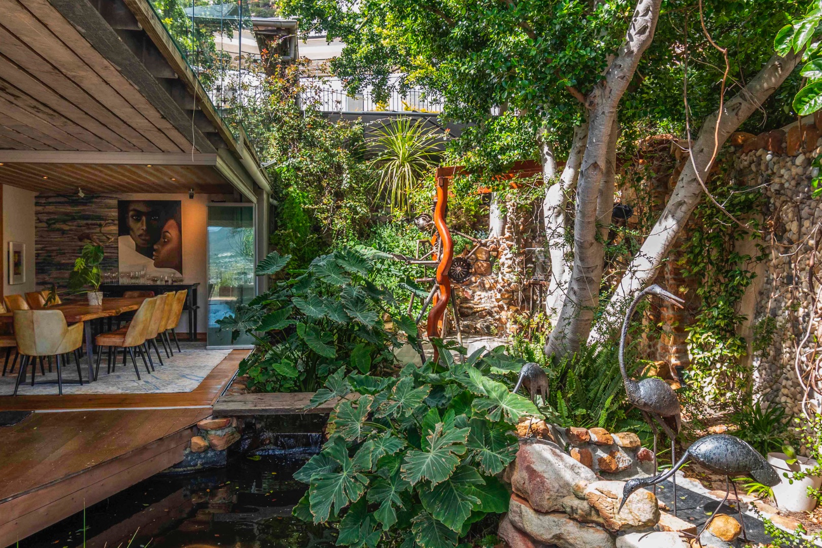 On the floor level you have an open kitchen kitted out with quality appliances like a Lafra oven/stove etc overlooking the pool with the dining and living room on either side. Dine next to the zen garden complete with a koi pond jungle vibes and have the cool ocean breeze sweep through your hair in summer with the glass stacking doors open or relax in front of the cosy wood burning fireplace in winter in the living room. Further on this level is a water closet and a wine cellar and the kitchen has direct access to a generous double automated garage. Outside you have a large deck surrounding the pool with a garden to your right and a lovely bedroom en-suite to your left.