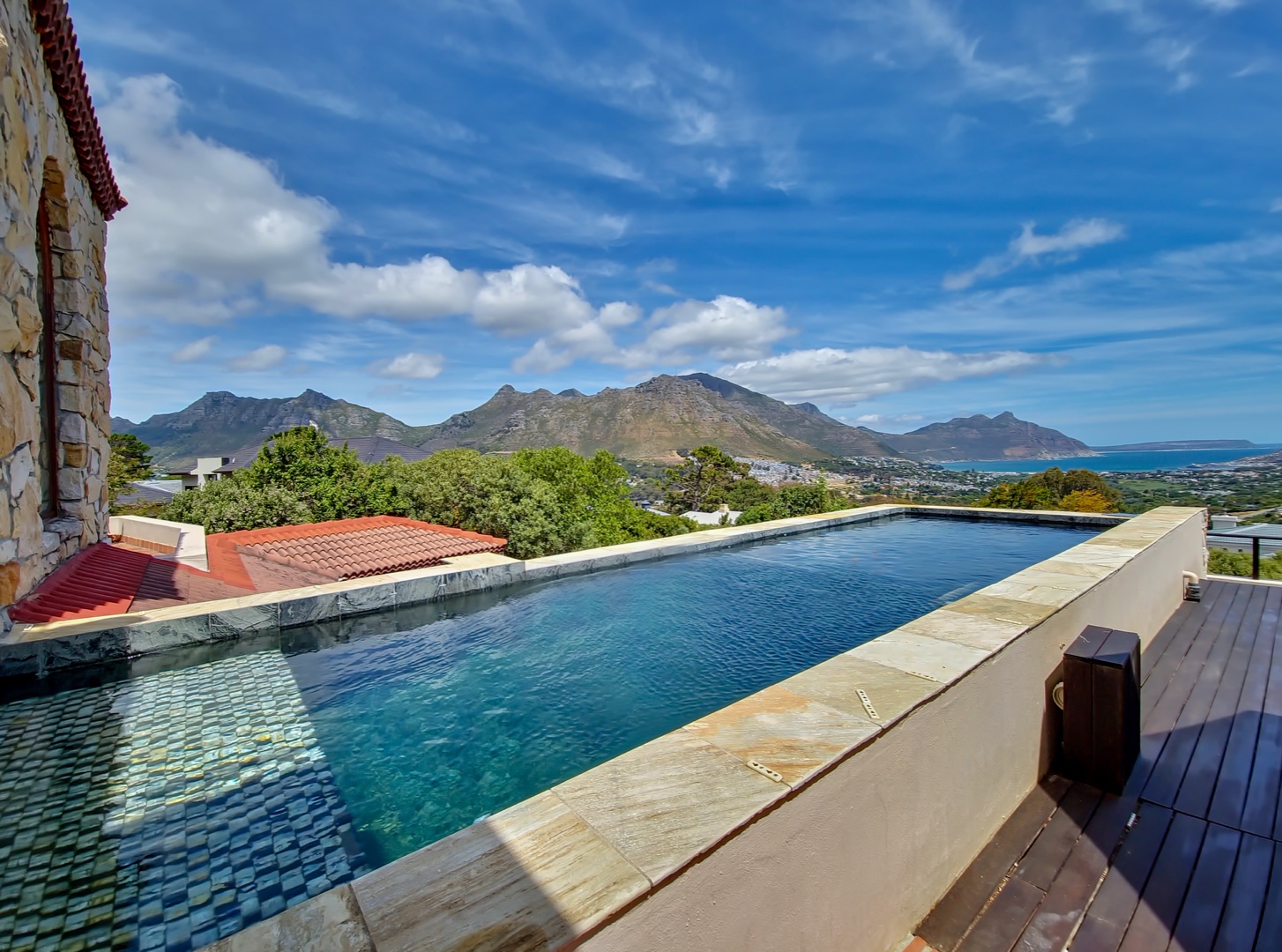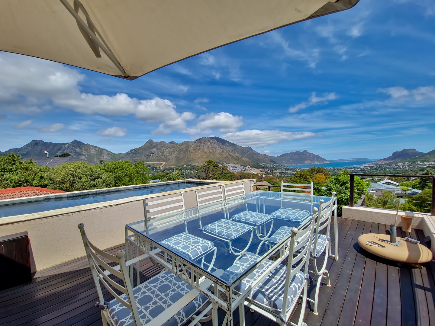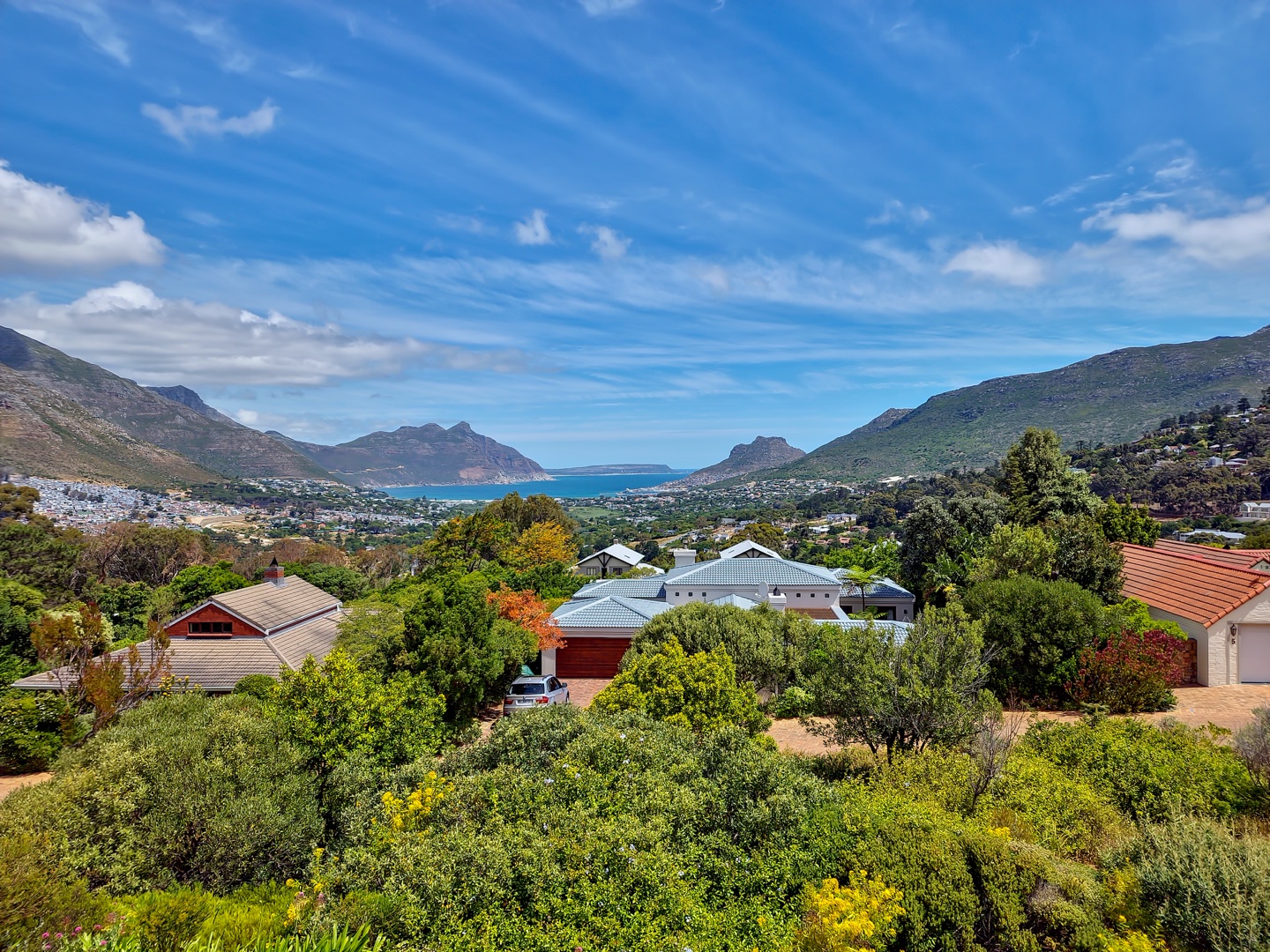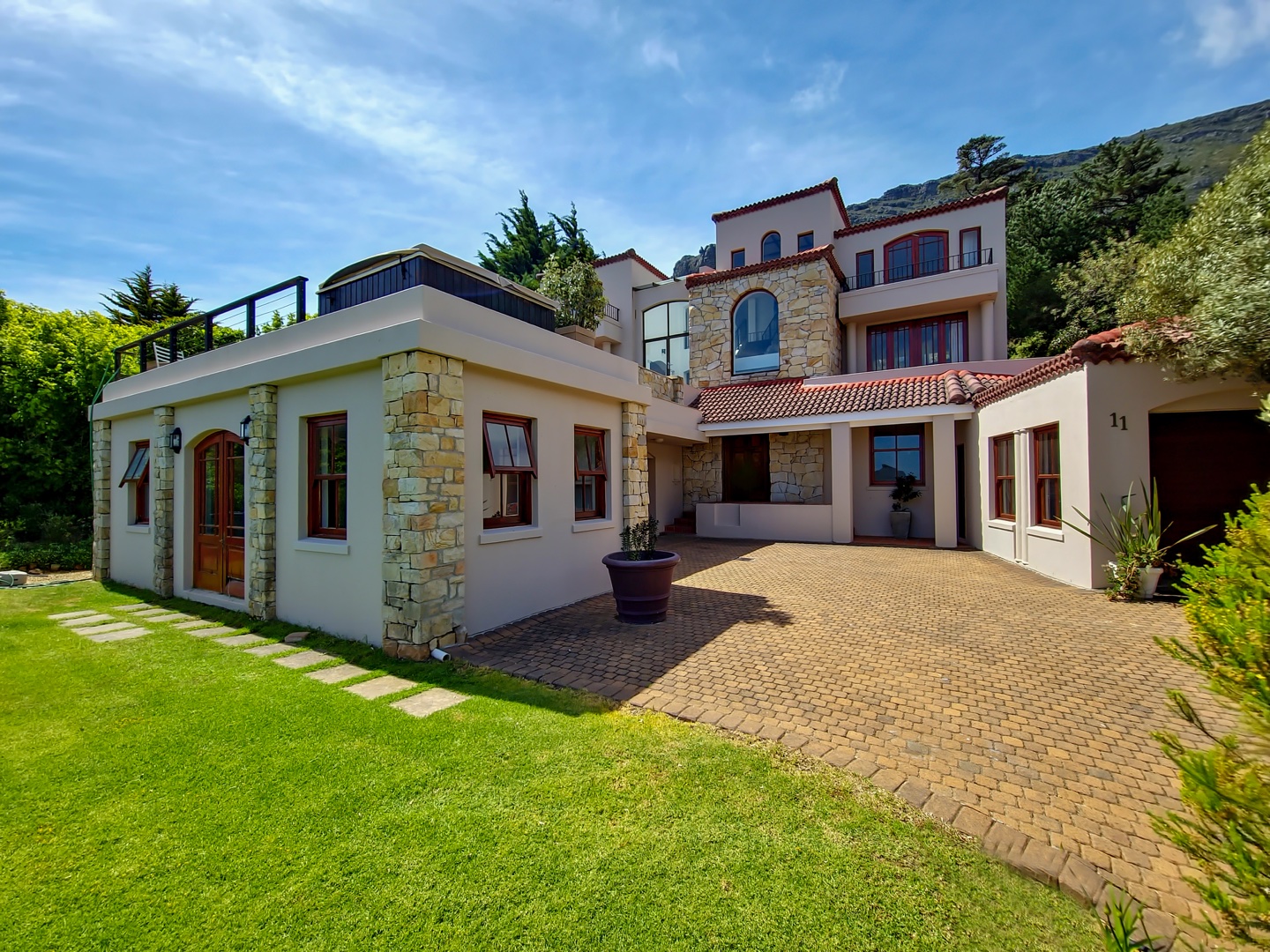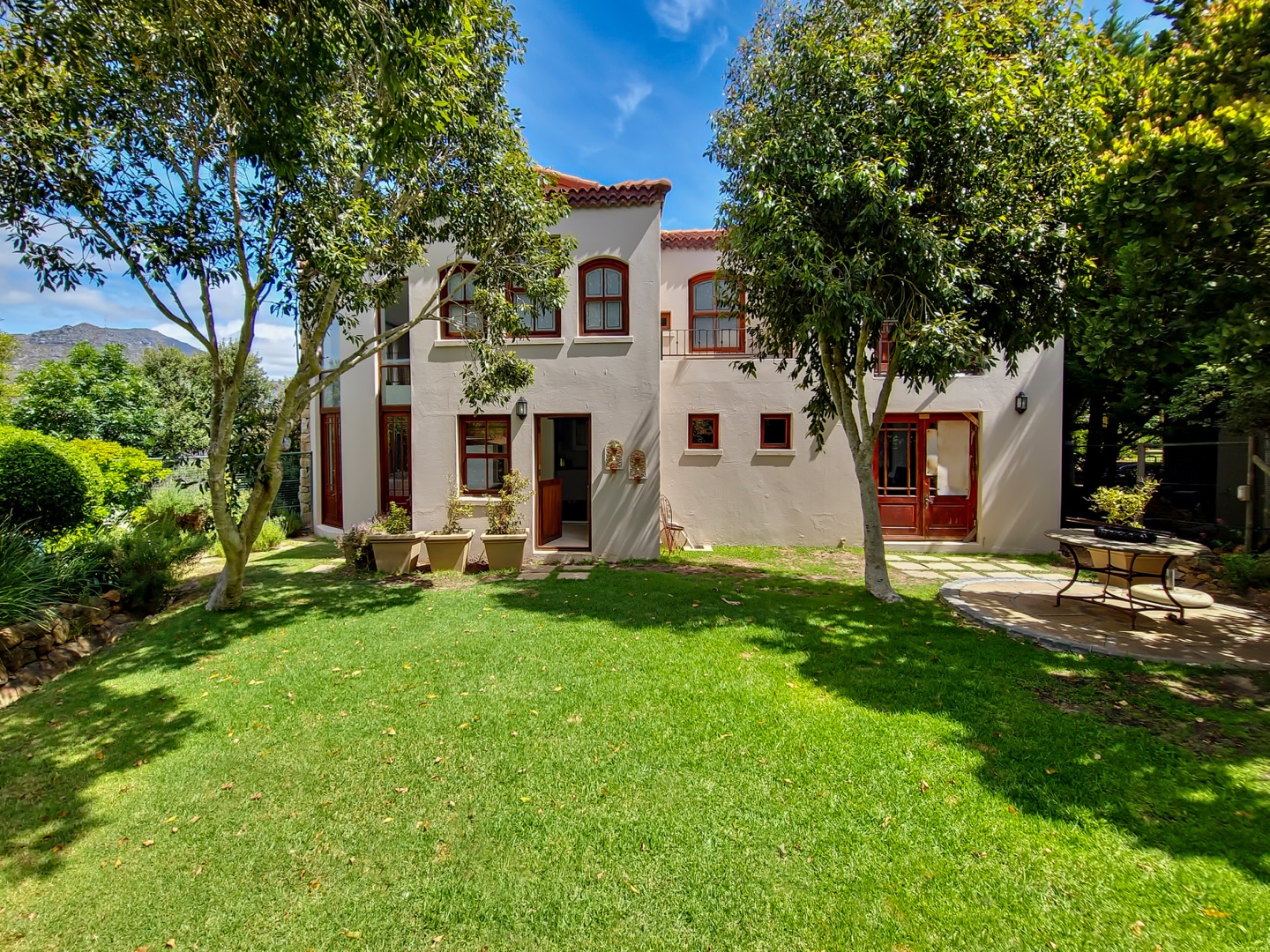 Perched on the highest point of Ruyteplaats, backed on the private mountain reserve and overlooking the blue ocean is this Tuscan inspired versatile home. One of the best positions in this sought after security estate, access the mountain from your back garden and enjoy spectacular all surround views.