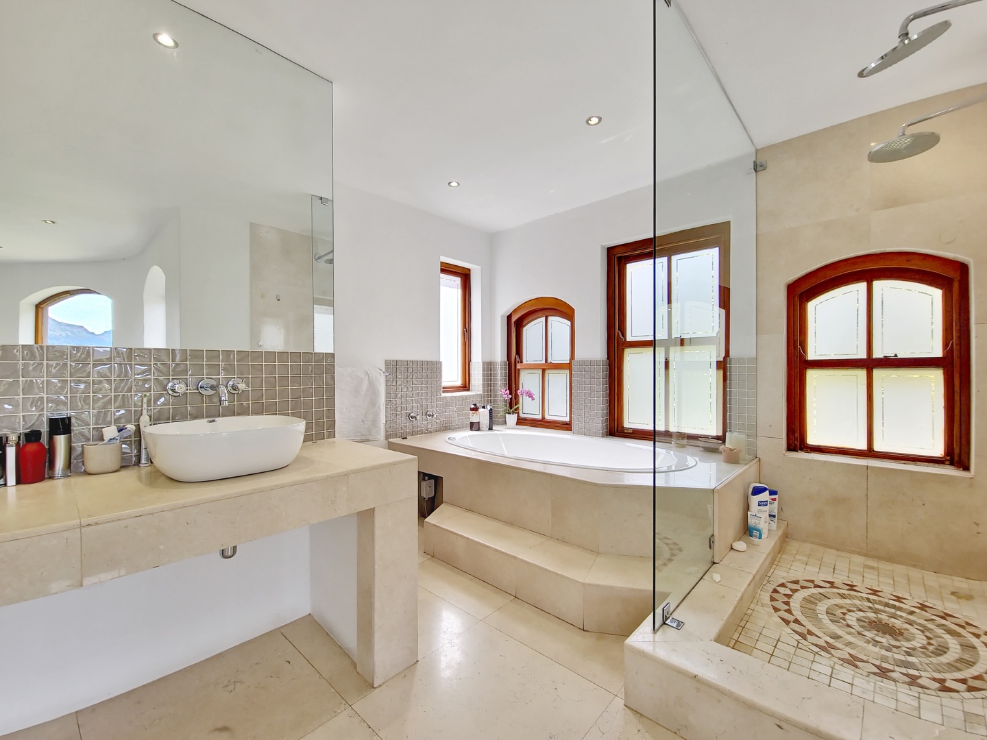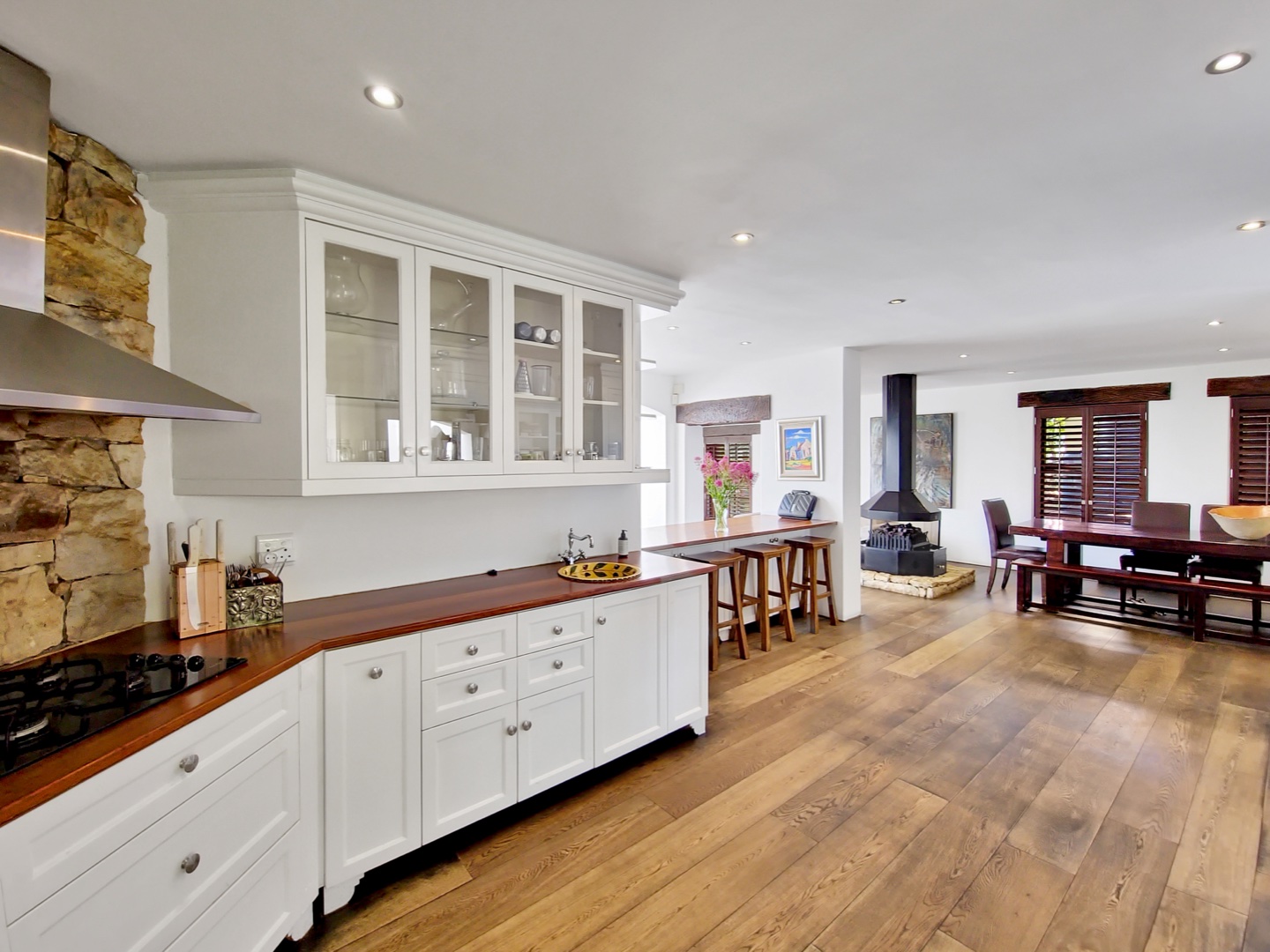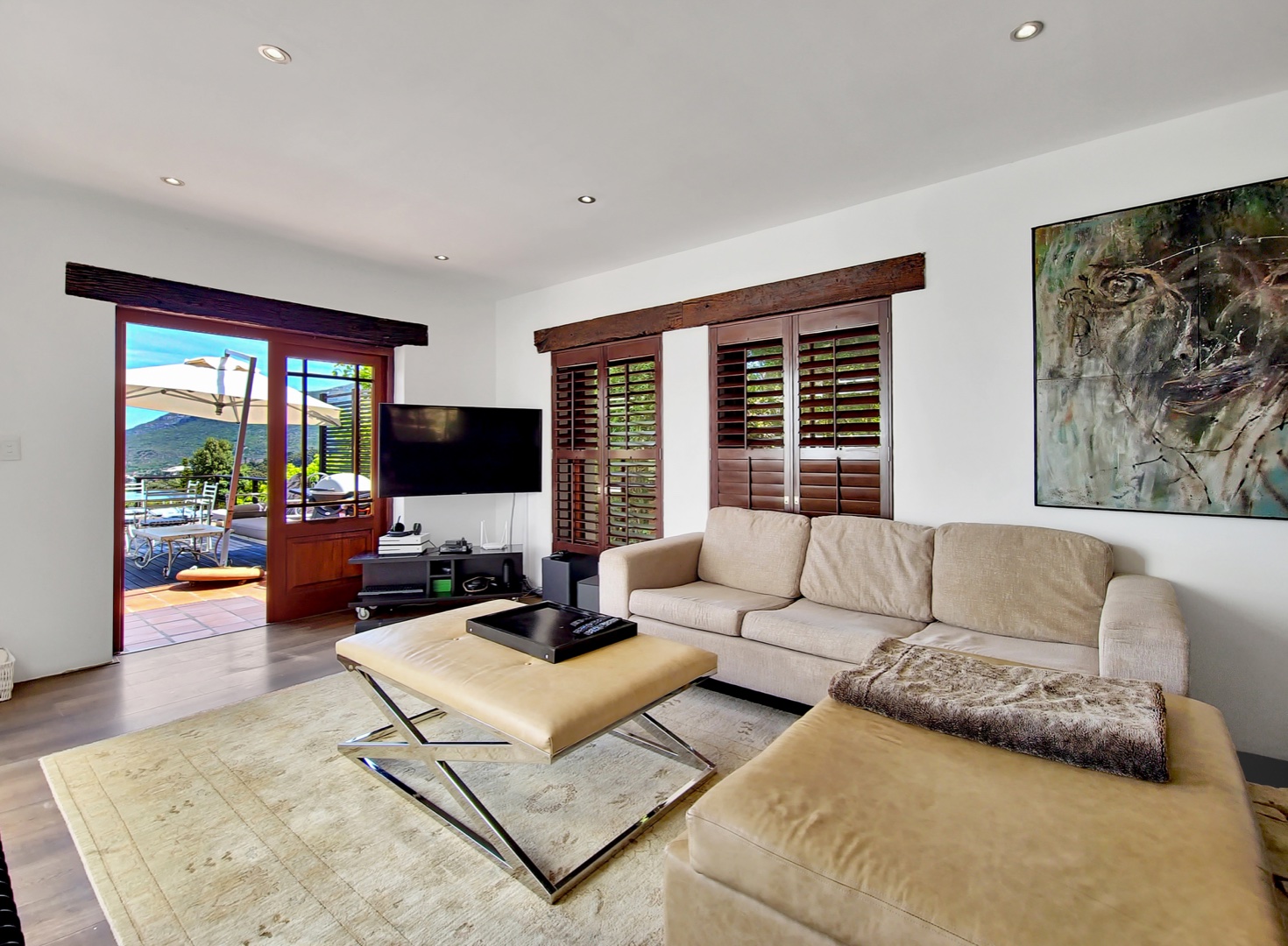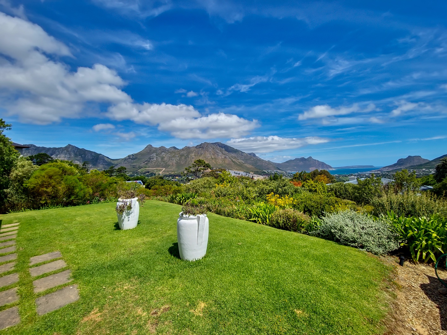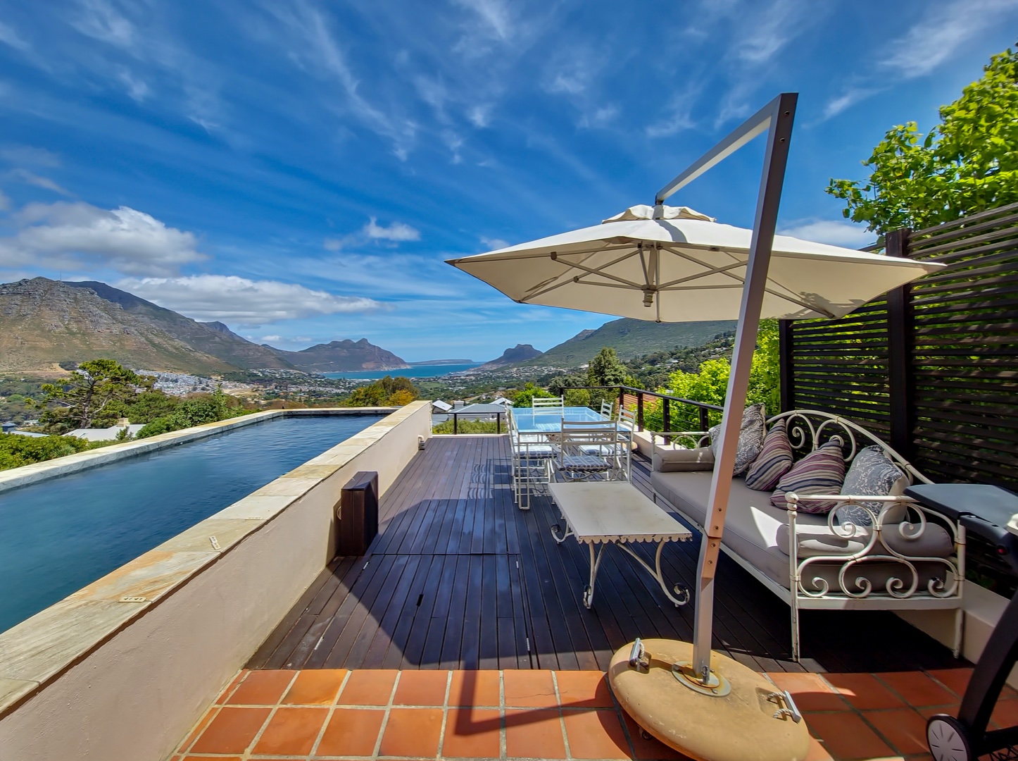 Perched on the highest point of Ruyteplaats, backed on the private mountain reserve and overlooking the blue ocean is this Tuscan inspired versatile home. One of the best positions in this sought after security estate, access the mountain from your back garden and enjoy spectacular all surround views.