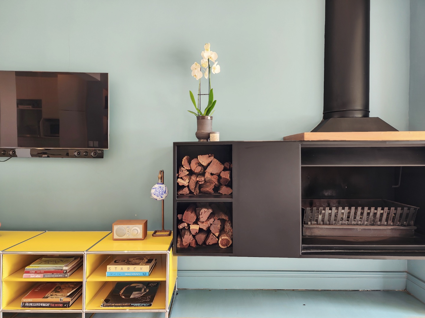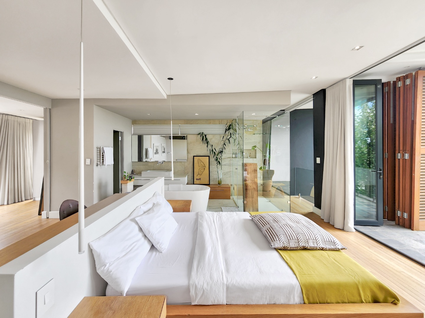 At the entrance, you are welcomed by an Indigenous garden, lap pool, and outdoor terrace area. Glass stacking doors lead into the cosy lounge, which features an integrated sofa, bookcase, and wood-burning feature fireplace.