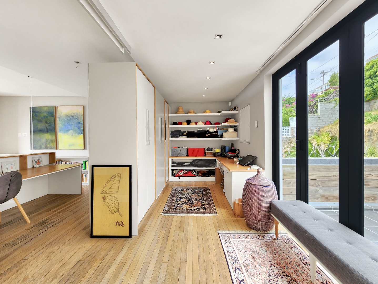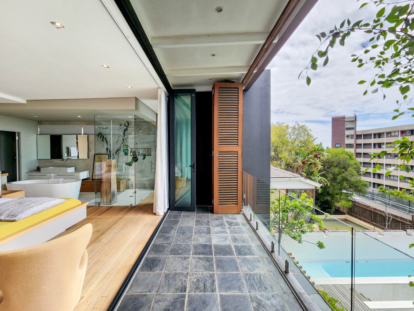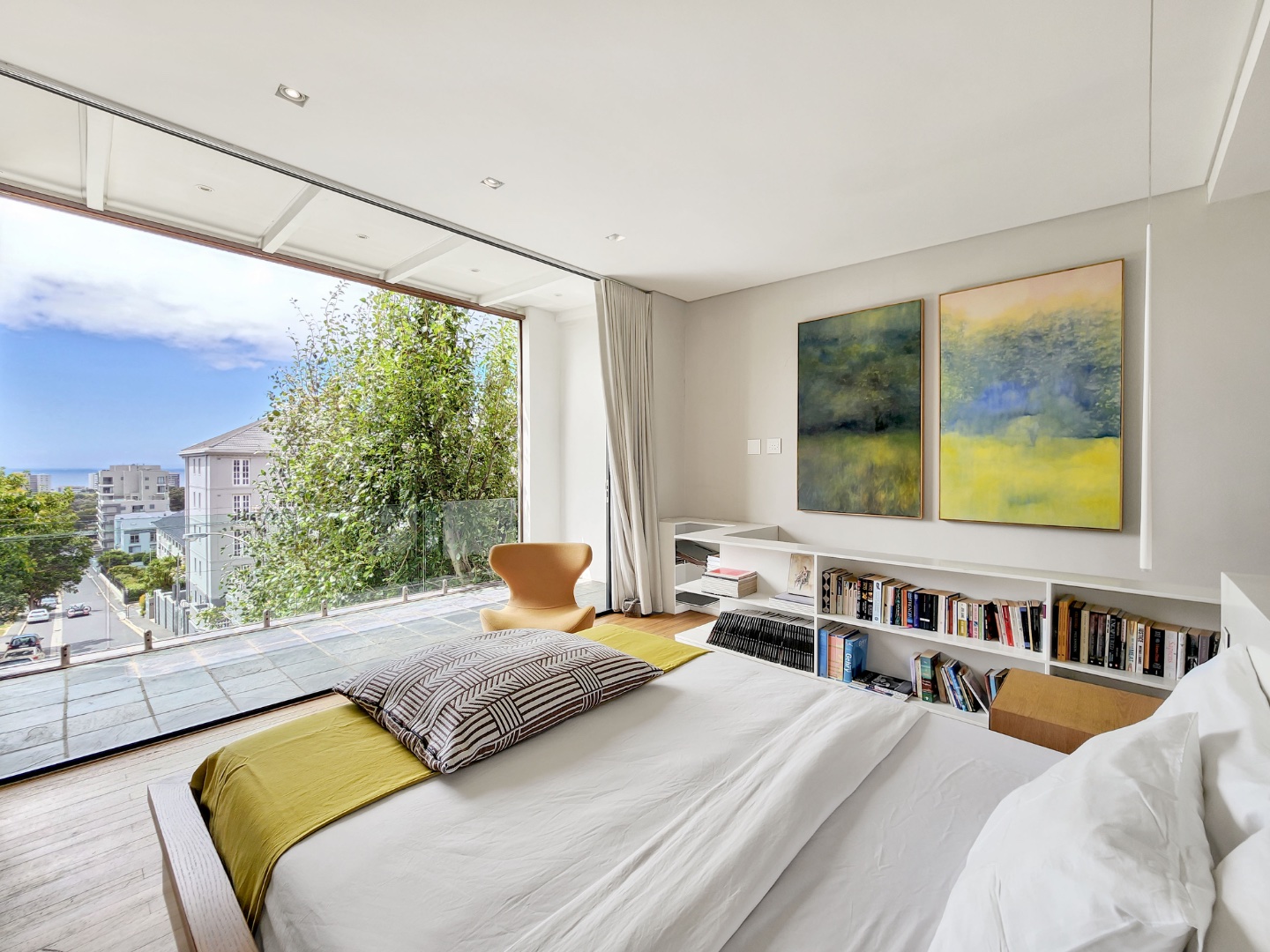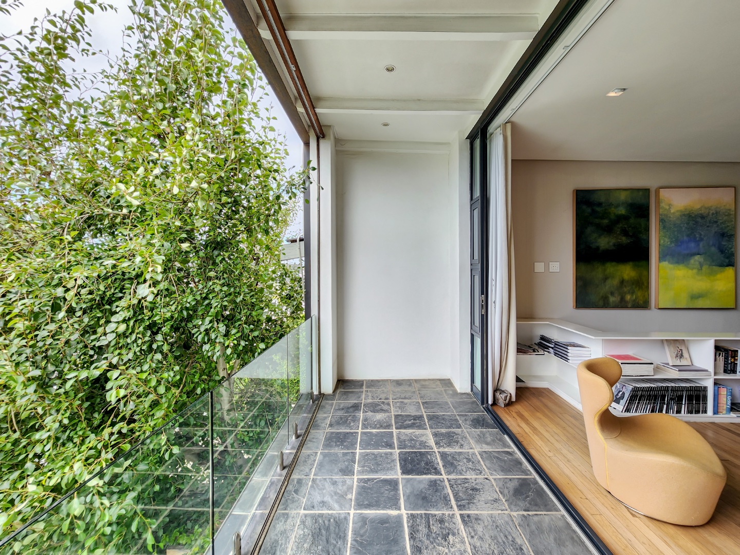 Upstairs is the primary bedroom en suite that leads out to a terrace overlooking city lights with glimpses of the Atlantic Ocean.