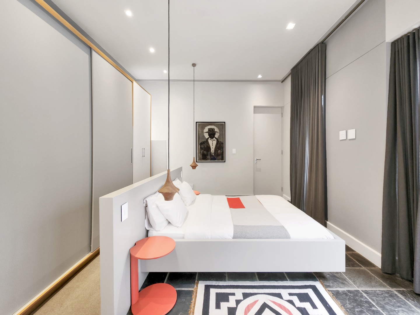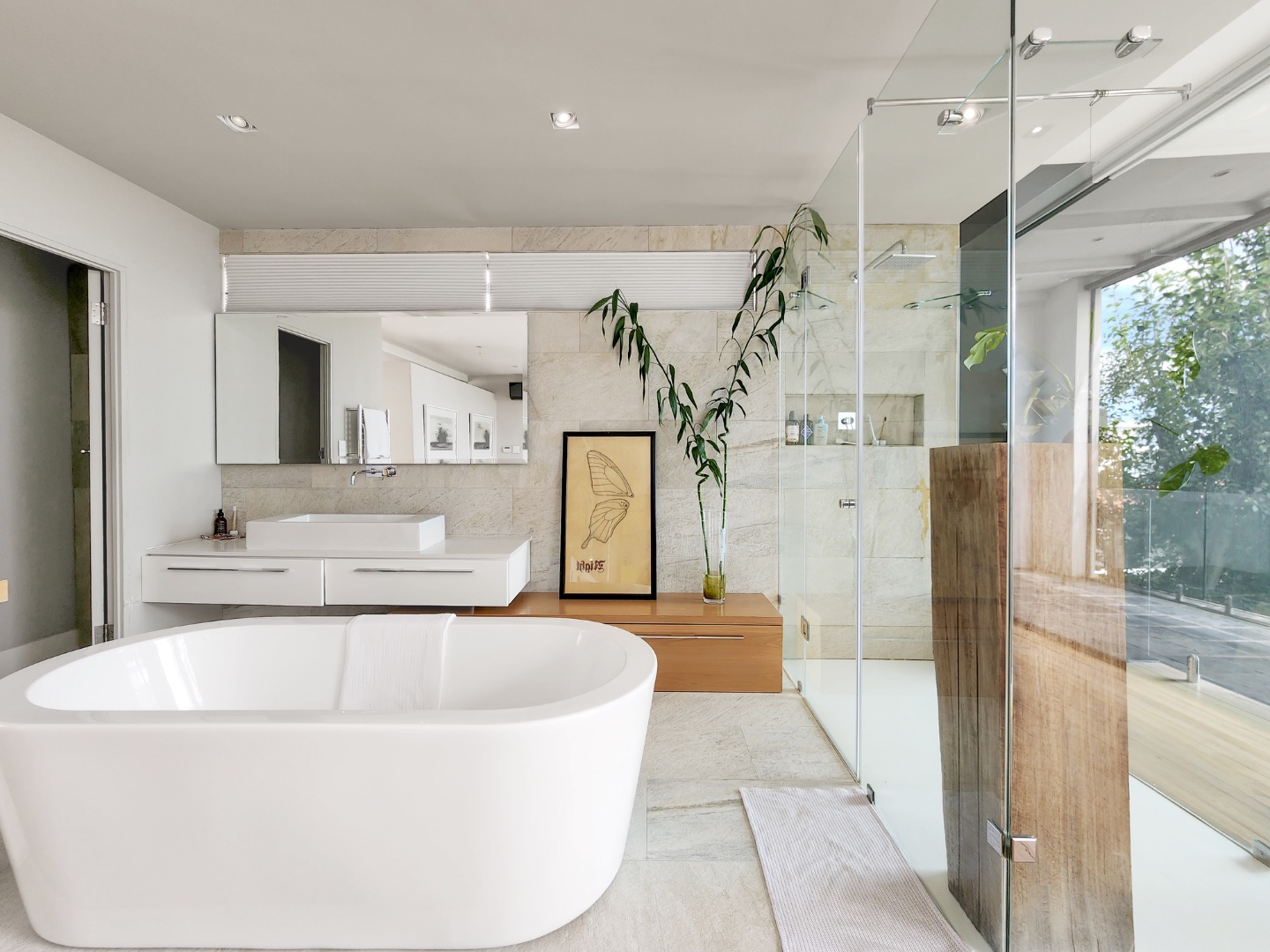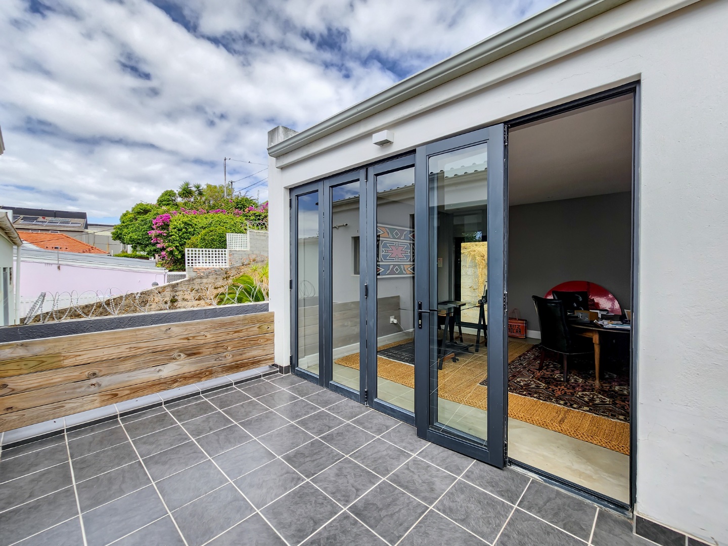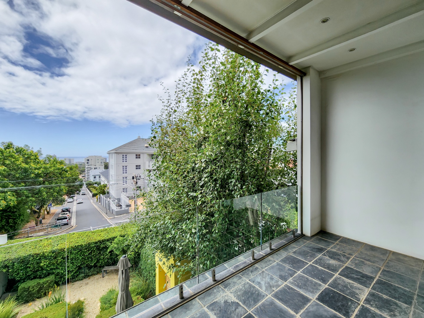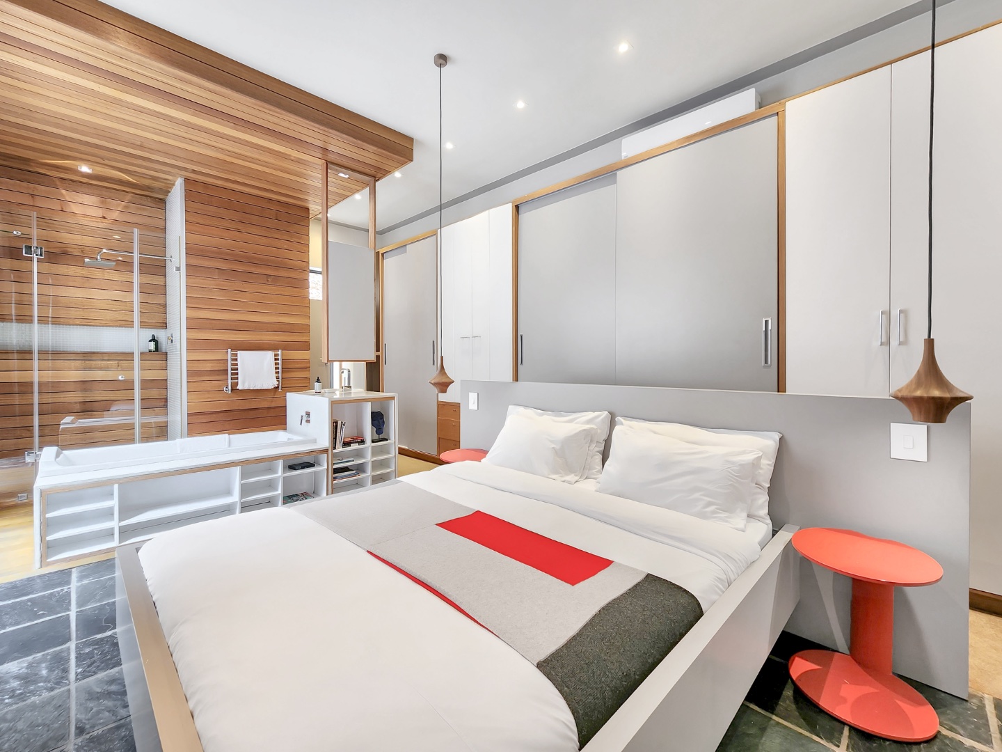Upstairs is the primary bedroom en suite that leads out to a terrace overlooking city lights with glimpses of the Atlantic Ocean.