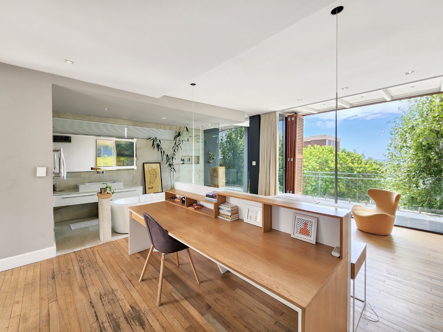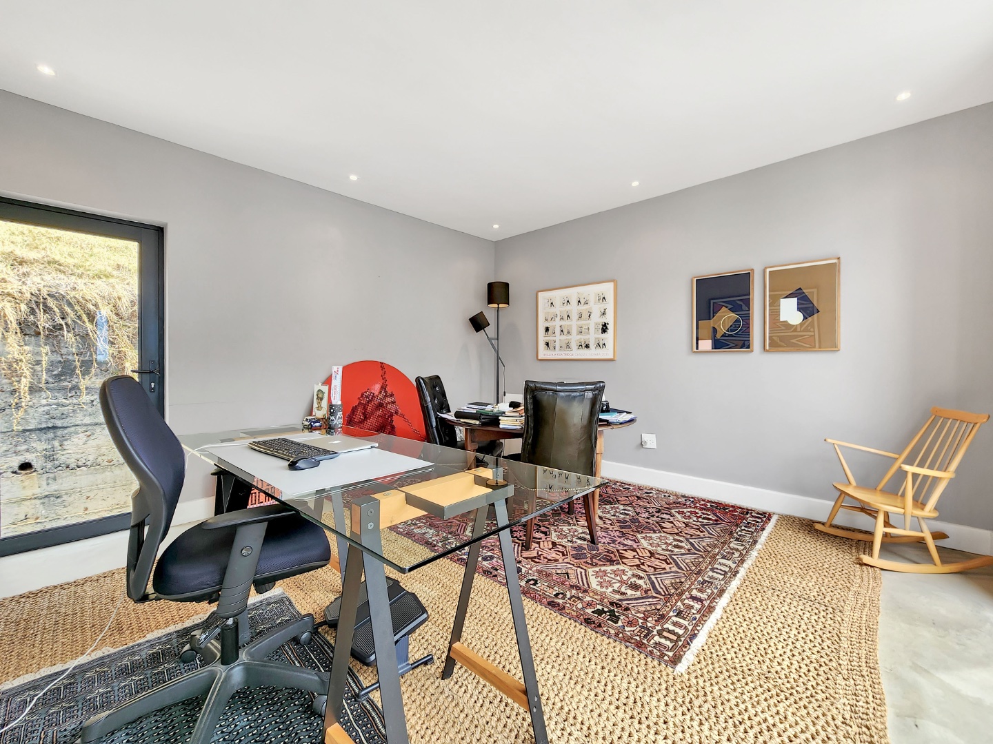 The large bedroom also has an office area and a walk-in closet. Additionally, a separate office lounge is on this level. This sought-after plot connects to the parallel street above, providing the opportunity to build a double garage and an extra level that will hugely increase the property’s value.