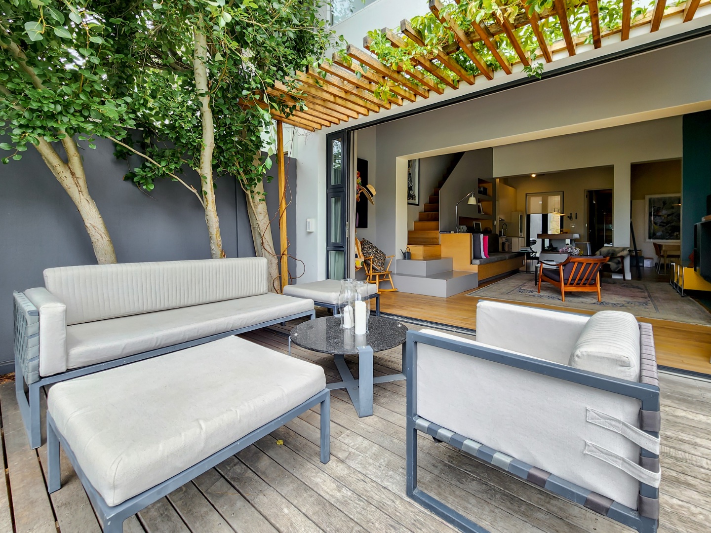 Further on this level is a guest water closet, an open kitchen, a dining area, a laundry room and a generous bedroom en suite that leads to a courtyard terrace.