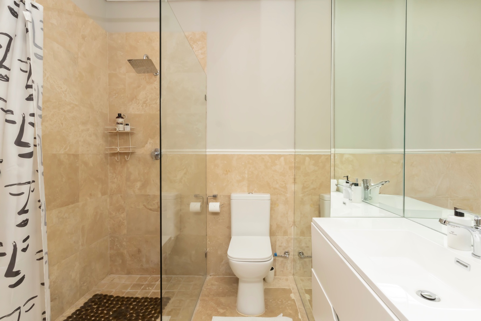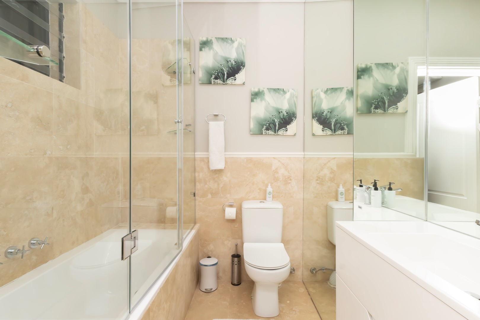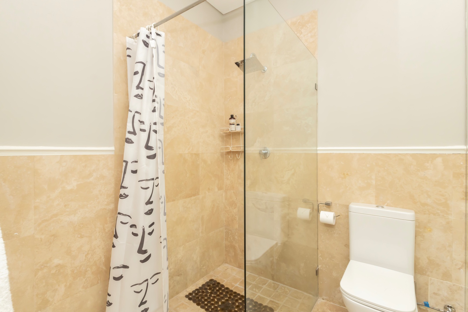 The apartment accommodates 4 guests and features two spacious king-bedrooms with premium linen and soft, neutral décor. A shared modern bathroom is fitted with both a bath and a walk-in shower.