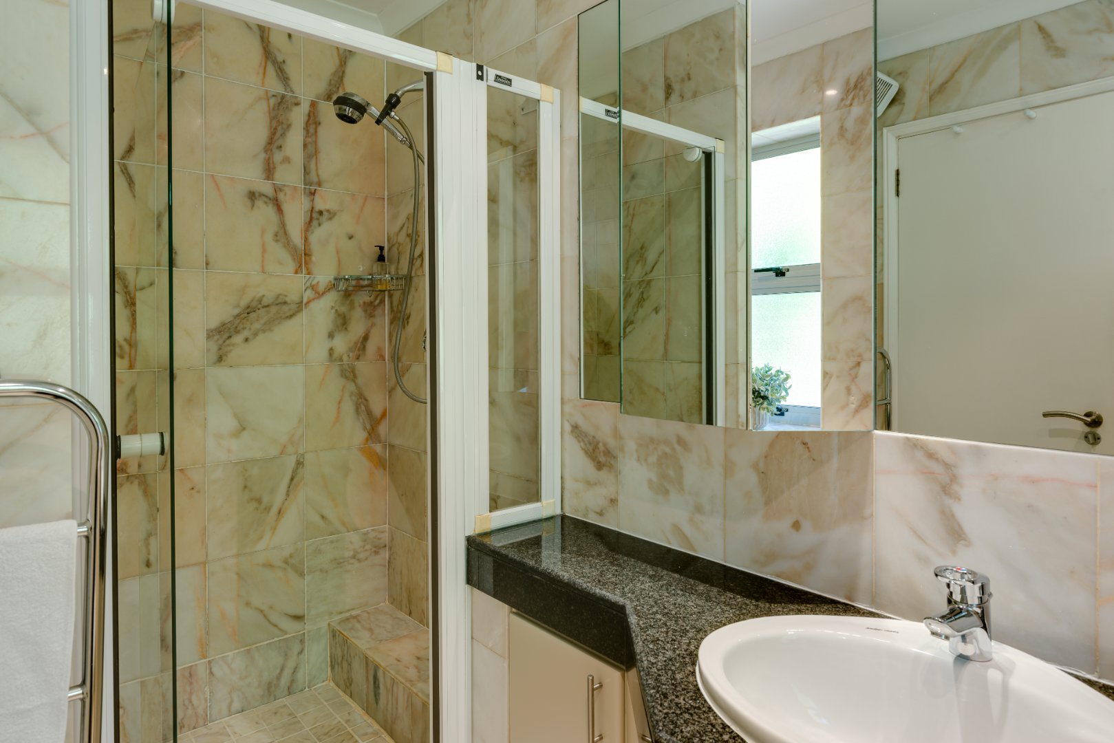 2 full bathrooms one with a shower and one with a bath, sliding doors opening up to private balcony with sea views and TV