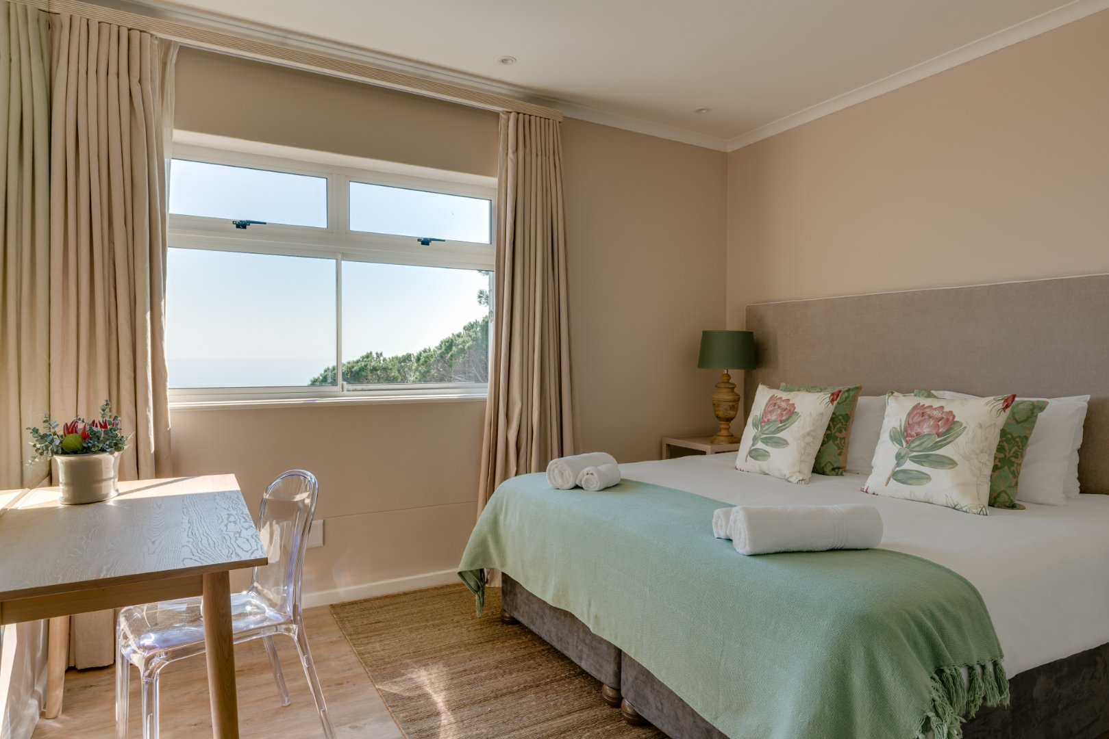 Queen size bed with sea and mountain views, en-suite bathroom with shower and TV
