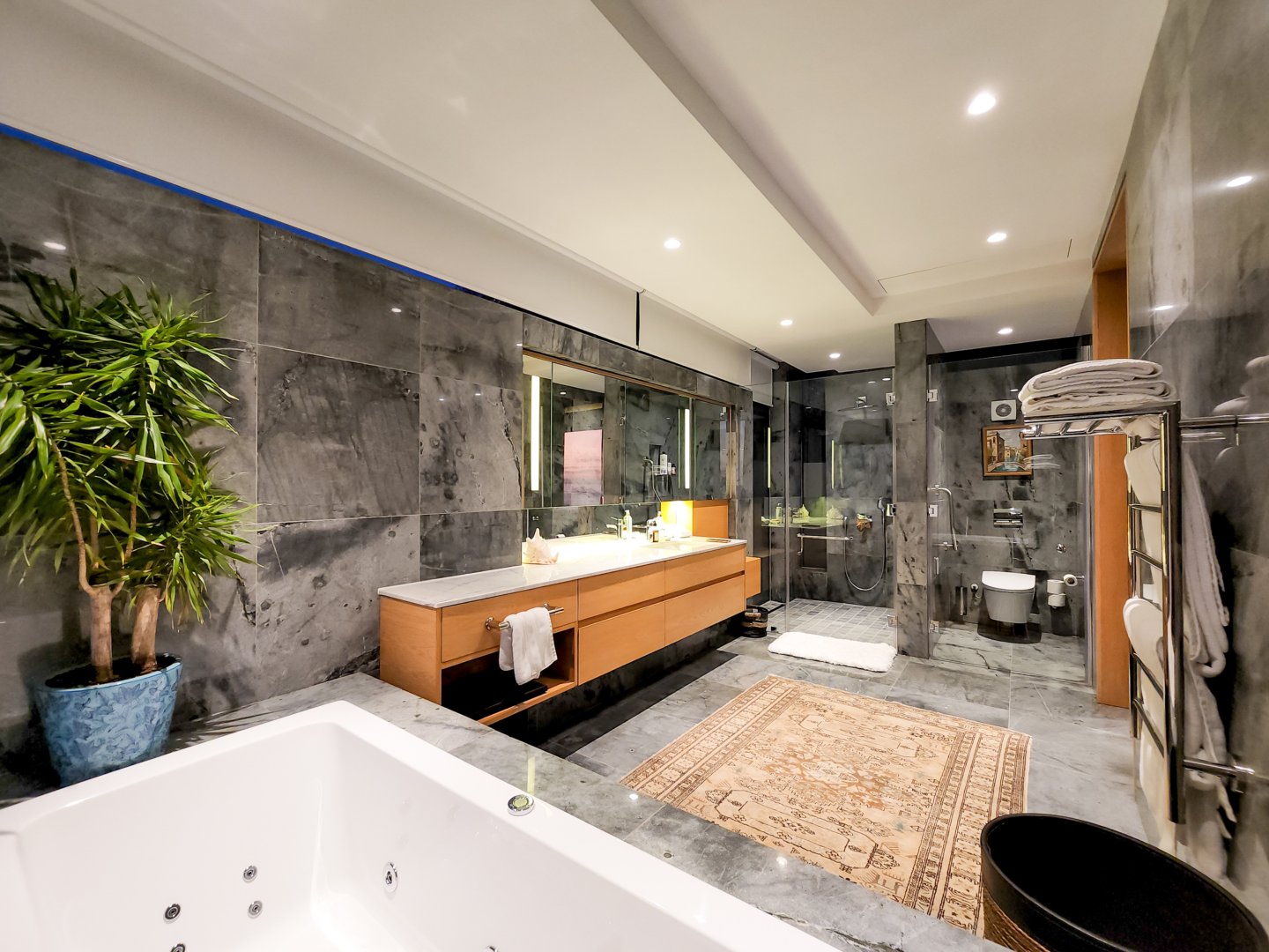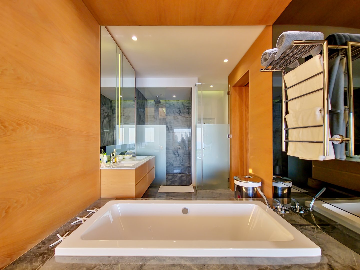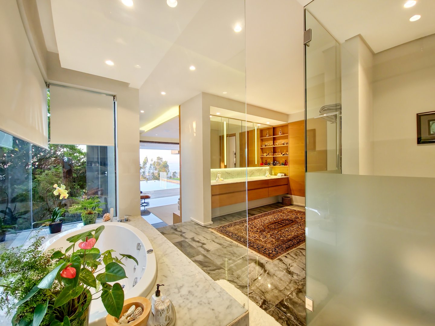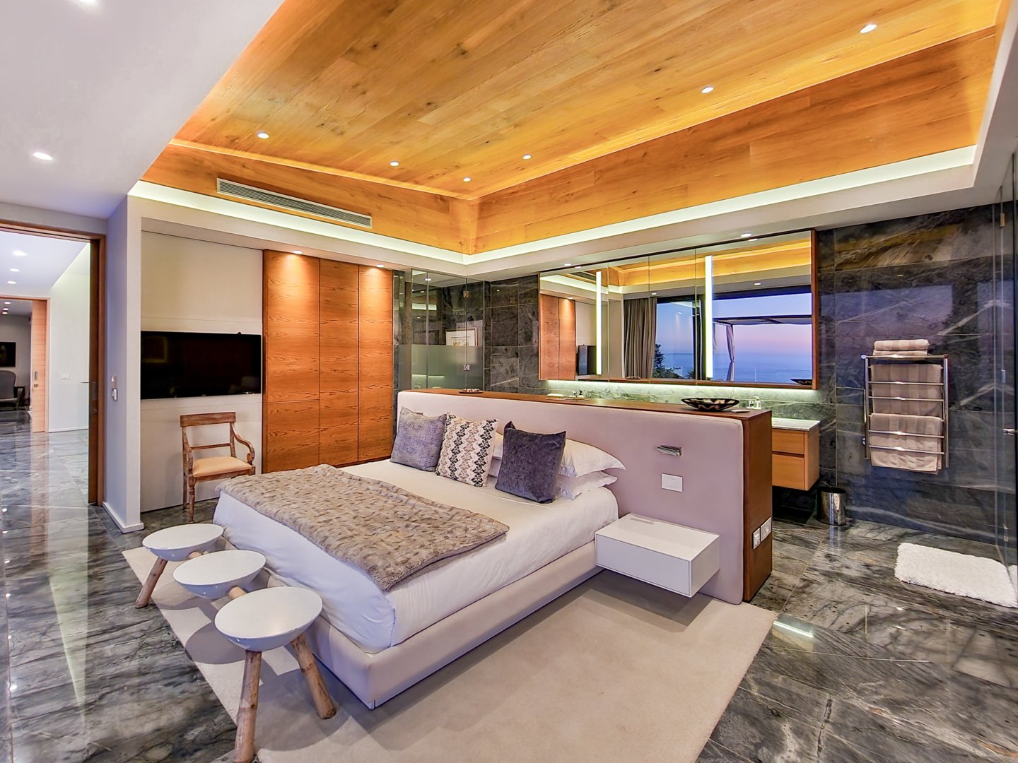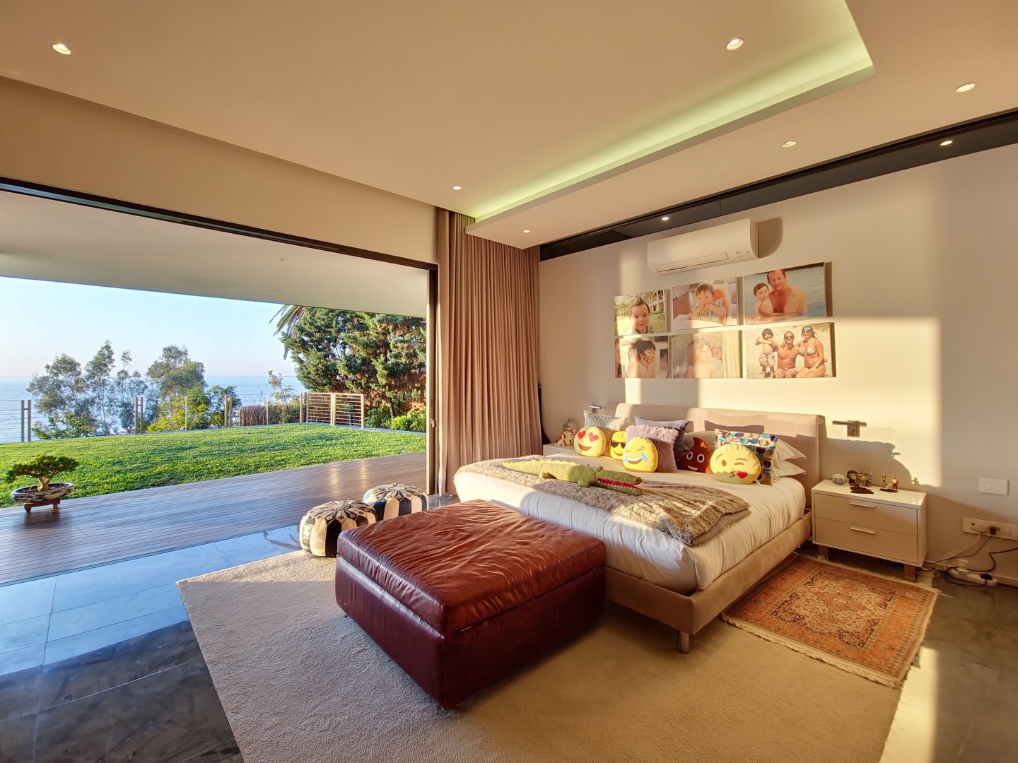 The villa has five bedrooms with en-suite bathrooms and stunning sea views. Three bedrooms on the ground floor lead to a serene lawn and heated pool, while two bedrooms are on the top floor. Bedroom 1 is lavish with a walk-in closet, jacuzzi, sauna, and pool overlooking the sea. Bedrooms 2 and 3 also have captivating sea views. Bedroom 4 offers a spacious balcony with a cozy daybed and ocean panorama. Bedroom 5, a larger suite, features a jacuzzi bath and charming small balcony.