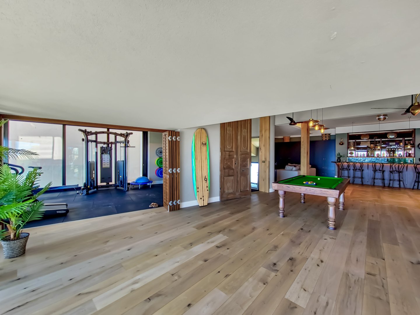 It’s spacious and modern, with everything you need for a comfortable stay, including an elevator. Each of the five bedrooms has its own balcony and ocean views. Plus, there’s a heated pool, outdoor dining area, and plenty of space to entertain.
