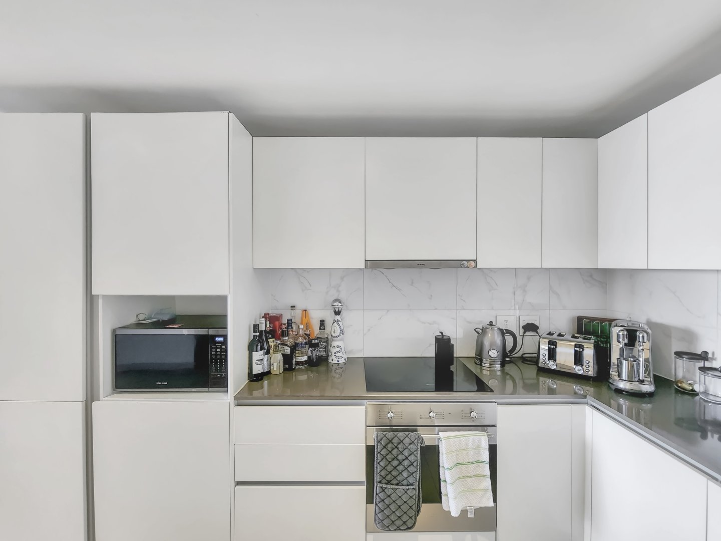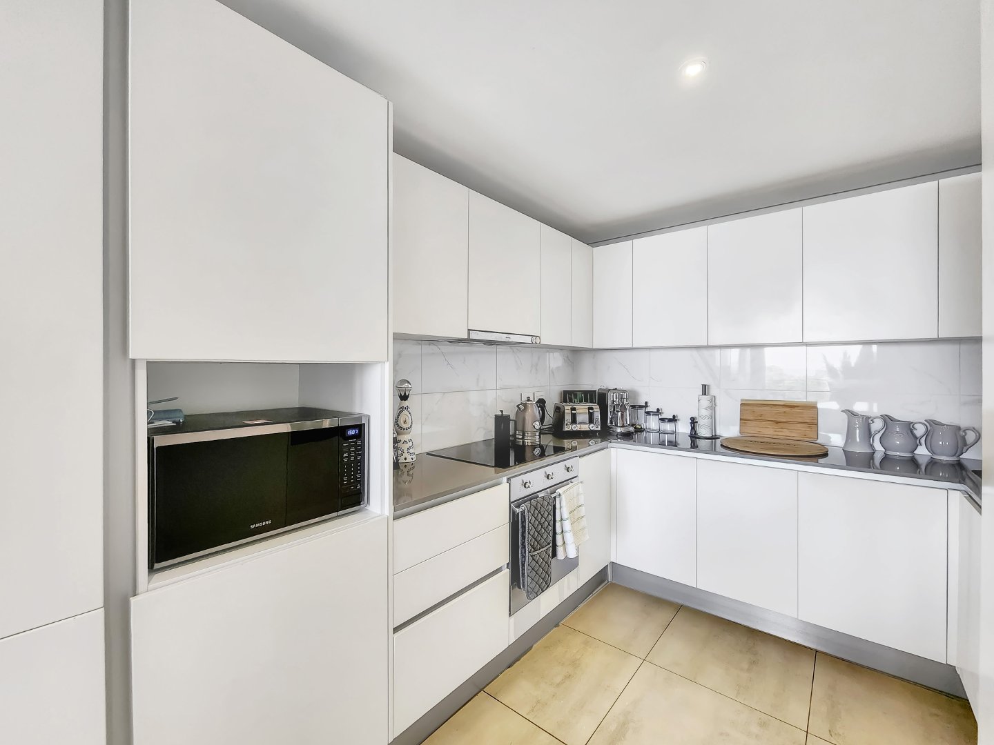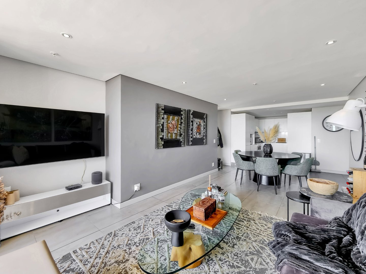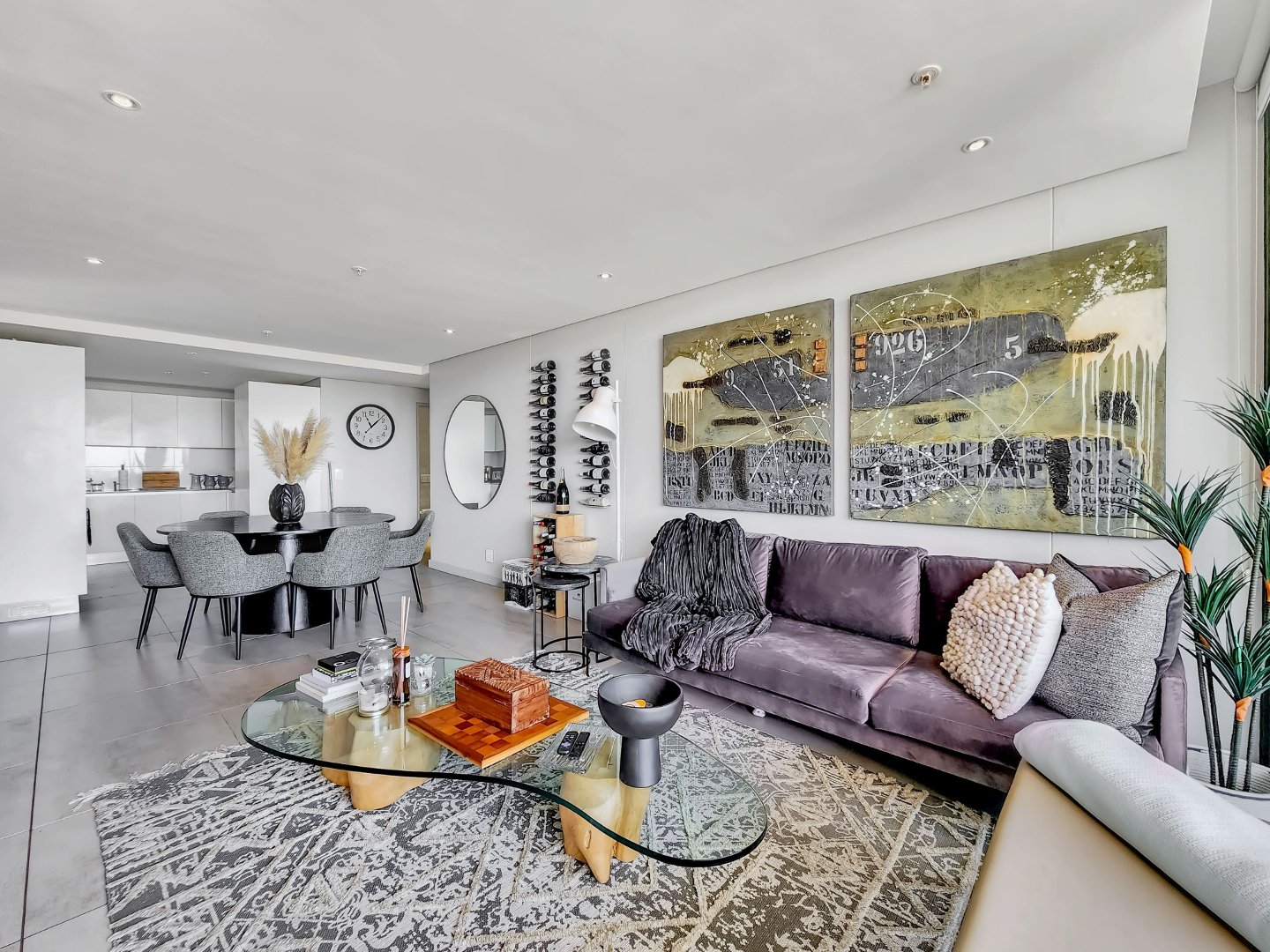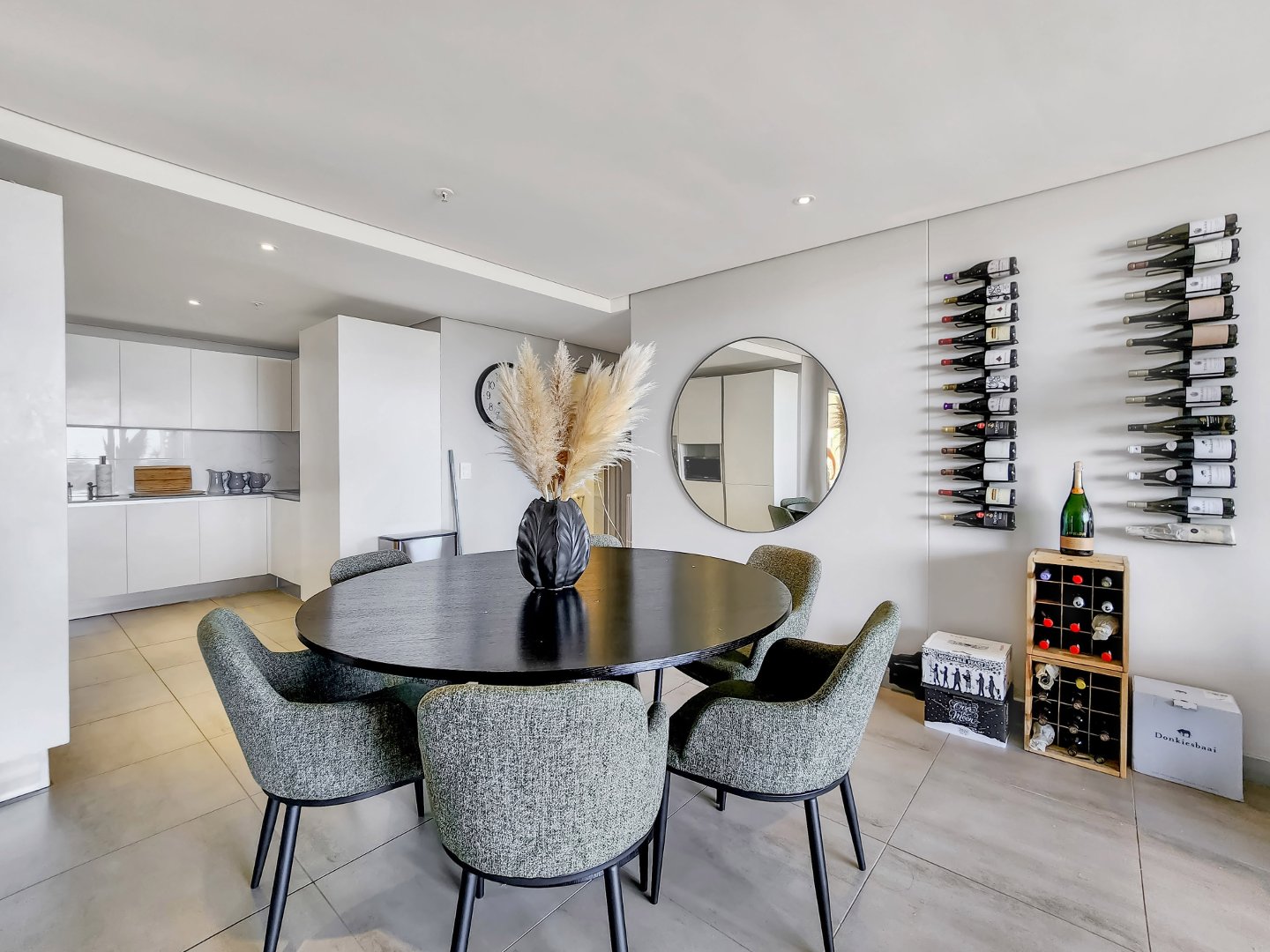 A well-appointed modern kitchen flows seamlessly into the dining room area with space for a six-seater table, perfect for those who like entertaining.