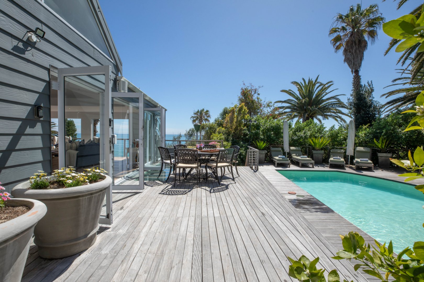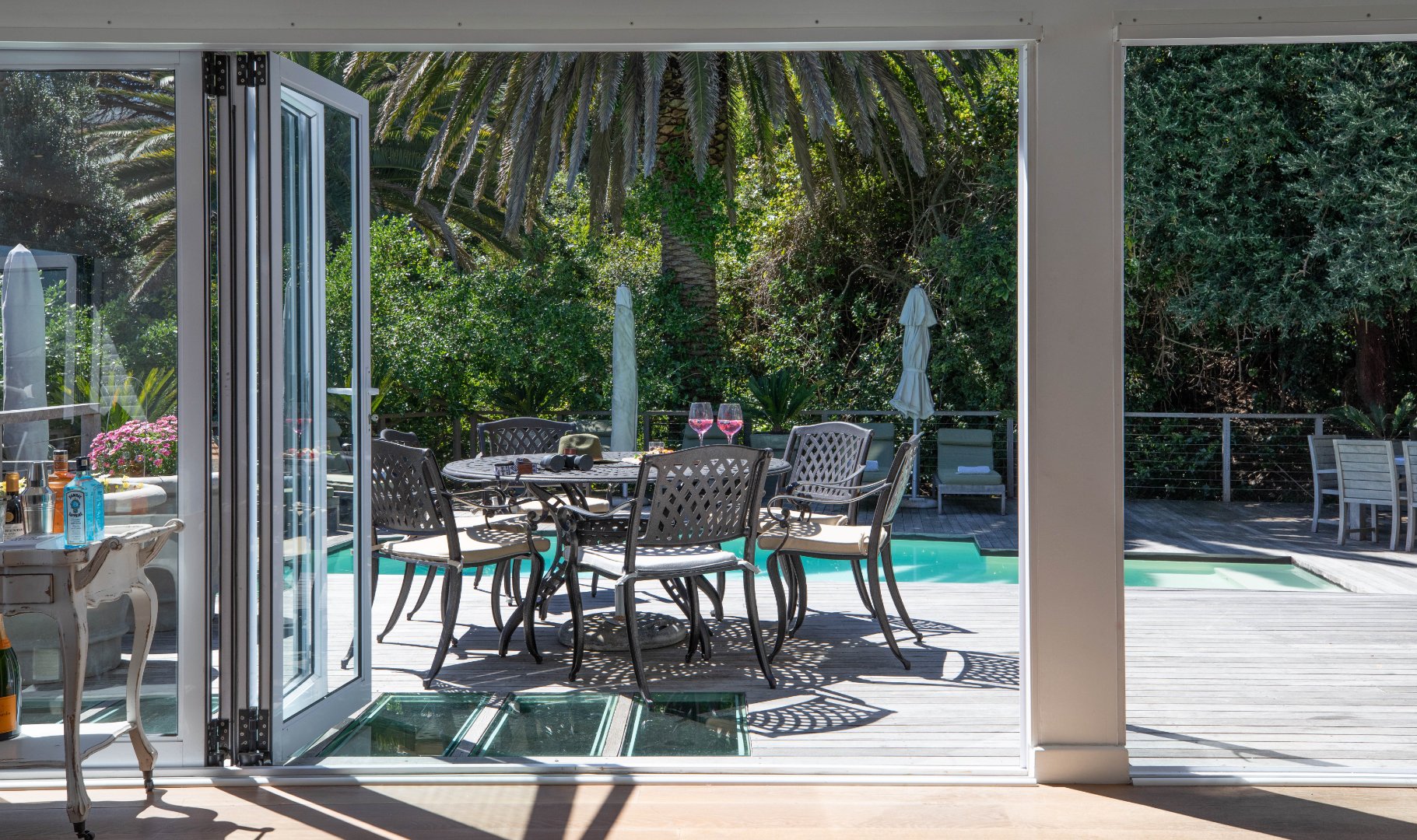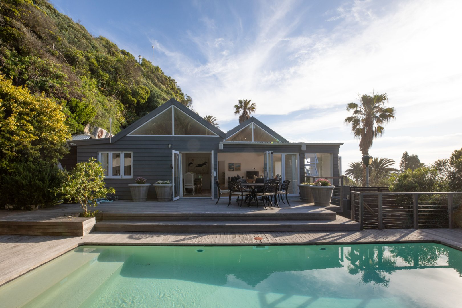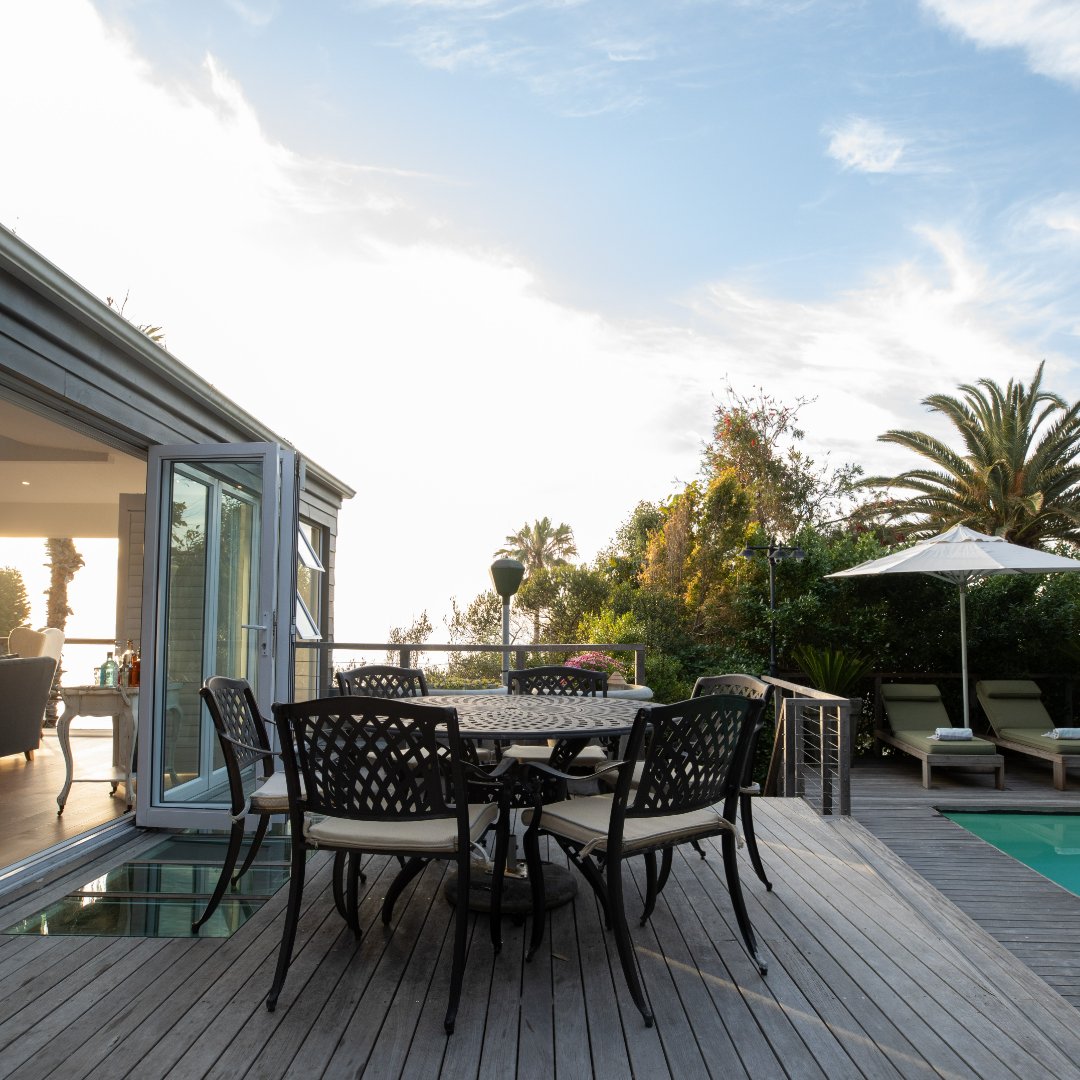A sunny, open plan kitchen, extends to a dining area and open plan living space, which is complimented by roof trusses through which a marvellous view of Lion’s Head can be seen. This living area is surrounded by floor to ceiling stacking doors, opening over panoramic views of Clifton 3rd Beach to the front, where you can watch the amazing Cape Town sunsets and hear the crashing of the waves. The stacking doors to the side, open onto an expansive wooden deck and pool. The privacy of this entertainment area is enhanced by the surrounding trees and flora. A sauna below the pool deck, completes this entertainer’s dream. The bungalow has a private door that opens onto the steps of 3rd Beach, which is just a stone’s throw away.