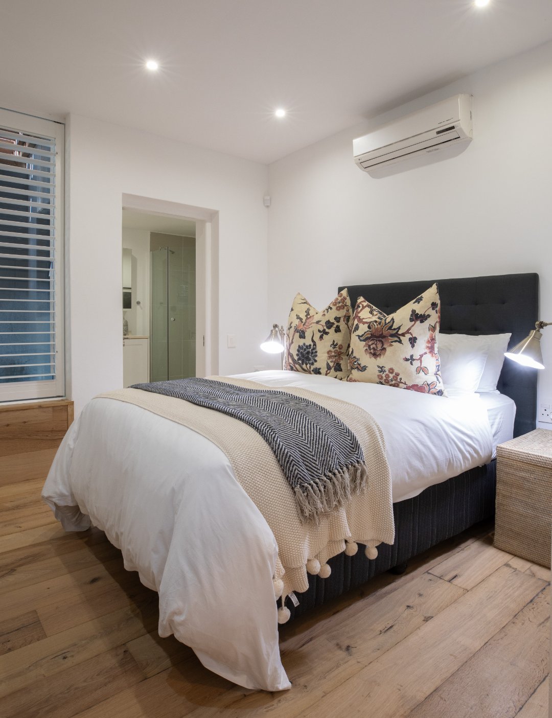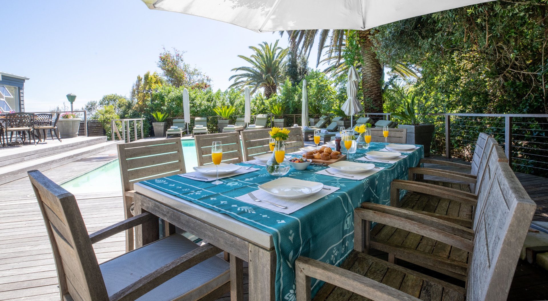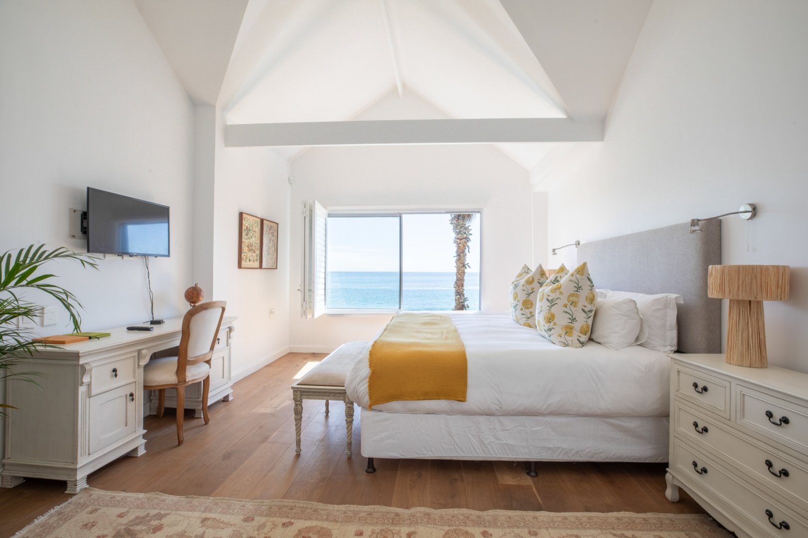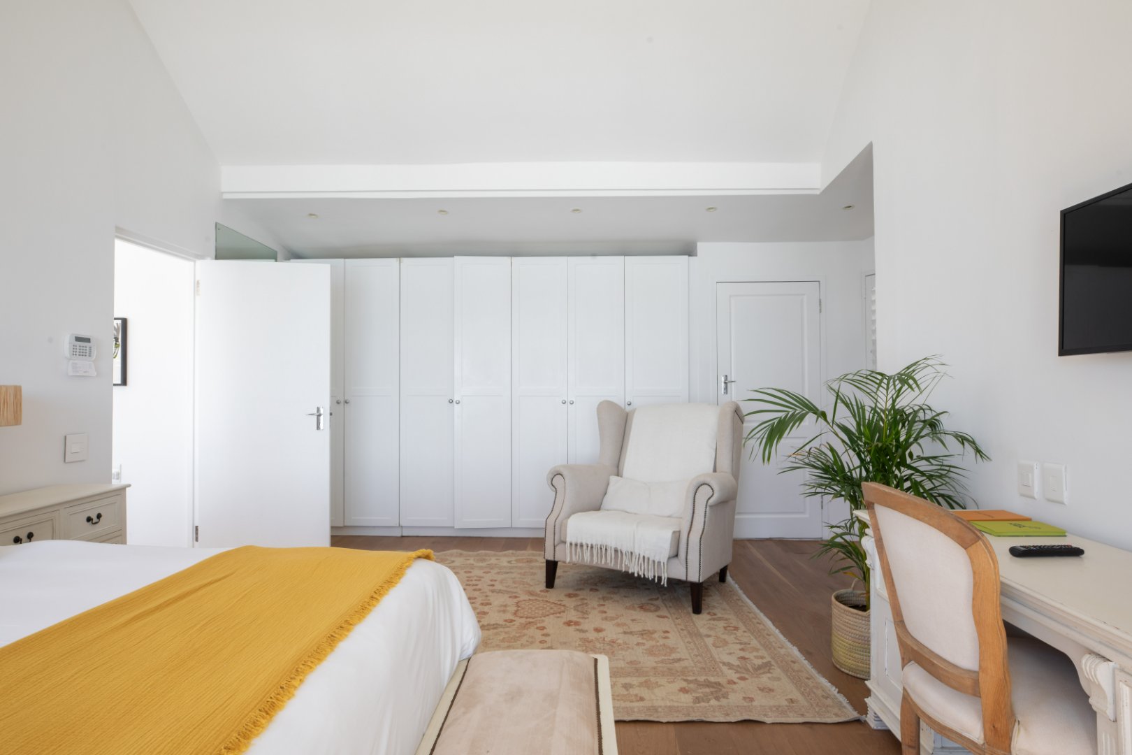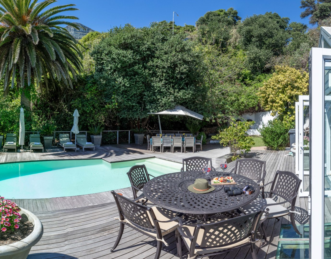A sunny, open plan kitchen, extends to a dining area and open plan living space, which is complimented by roof trusses through which a marvellous view of Lion’s Head can be seen. This living area is surrounded by floor to ceiling stacking doors, opening over panoramic views of Clifton 3rd Beach to the front, where you can watch the amazing Cape Town sunsets and hear the crashing of the waves. The stacking doors to the side, open onto an expansive wooden deck and pool. The privacy of this entertainment area is enhanced by the surrounding trees and flora. A sauna below the pool deck, completes this entertainer’s dream. The bungalow has a private door that opens onto the steps of 3rd Beach, which is just a stone’s throw away.