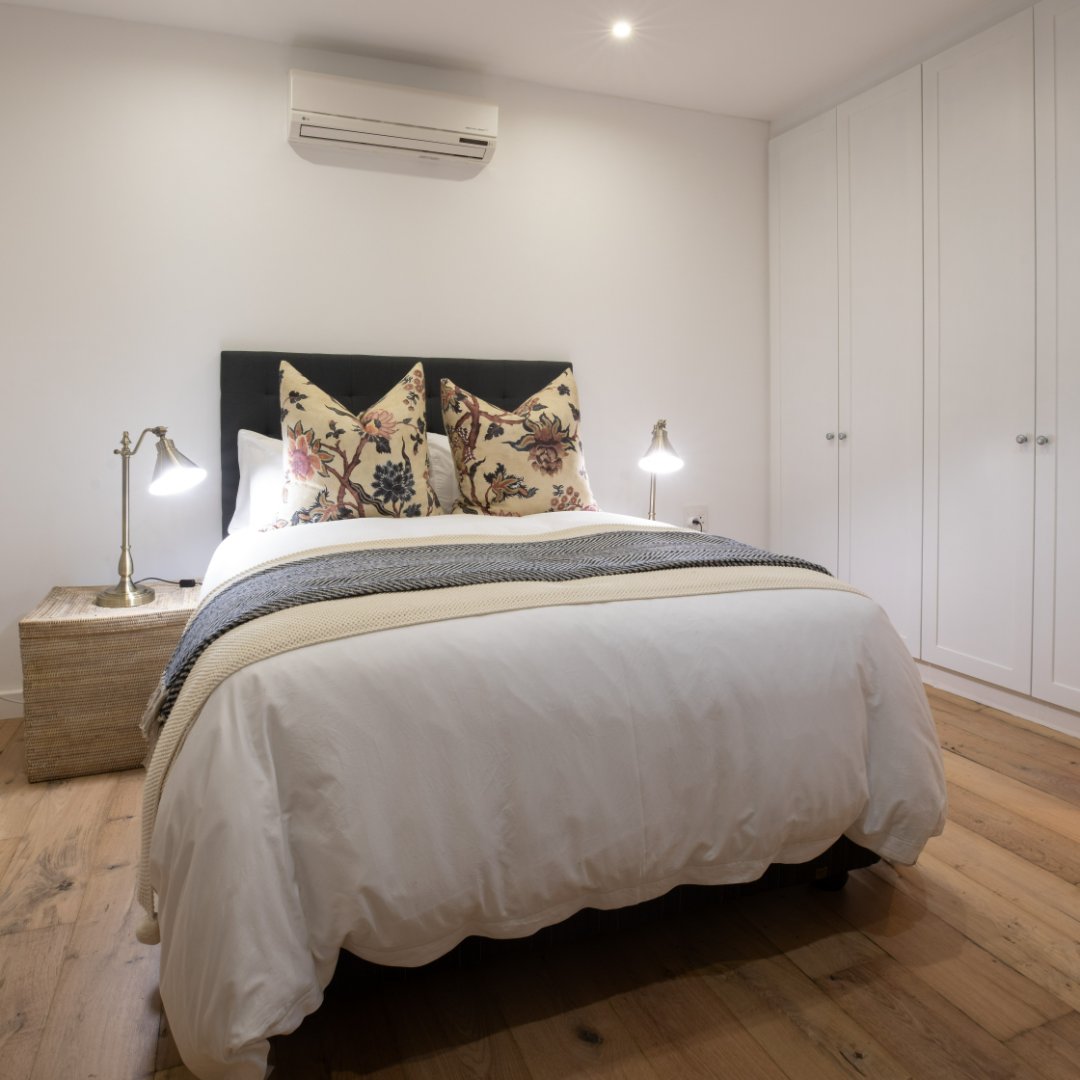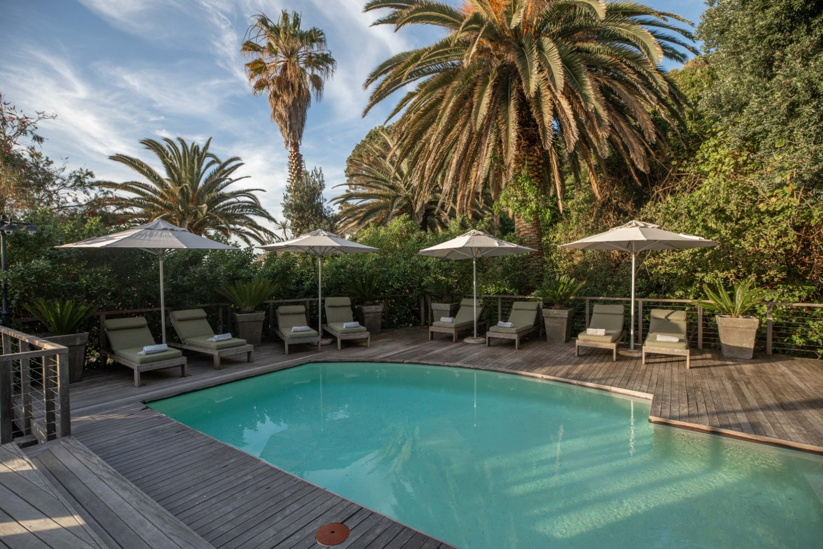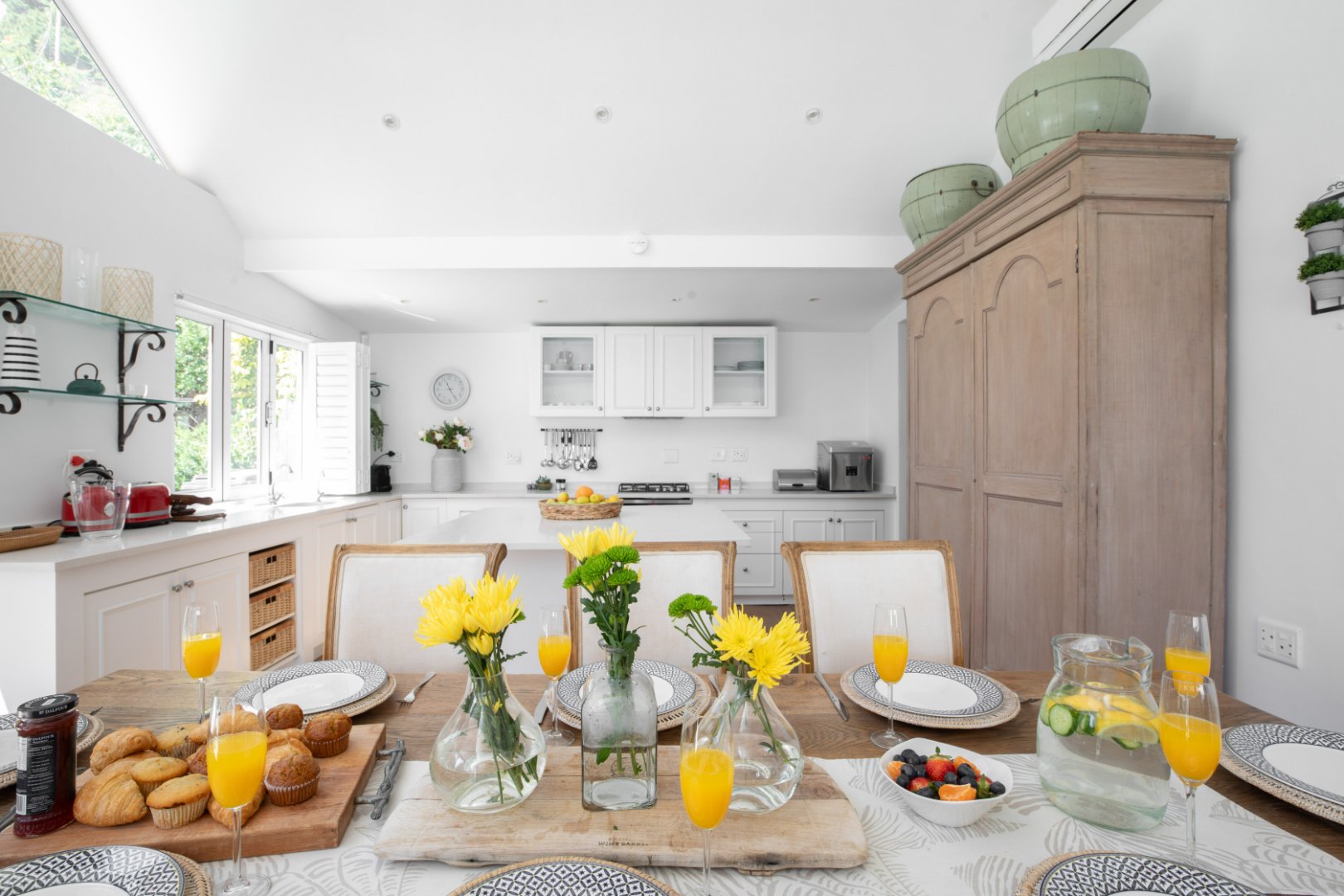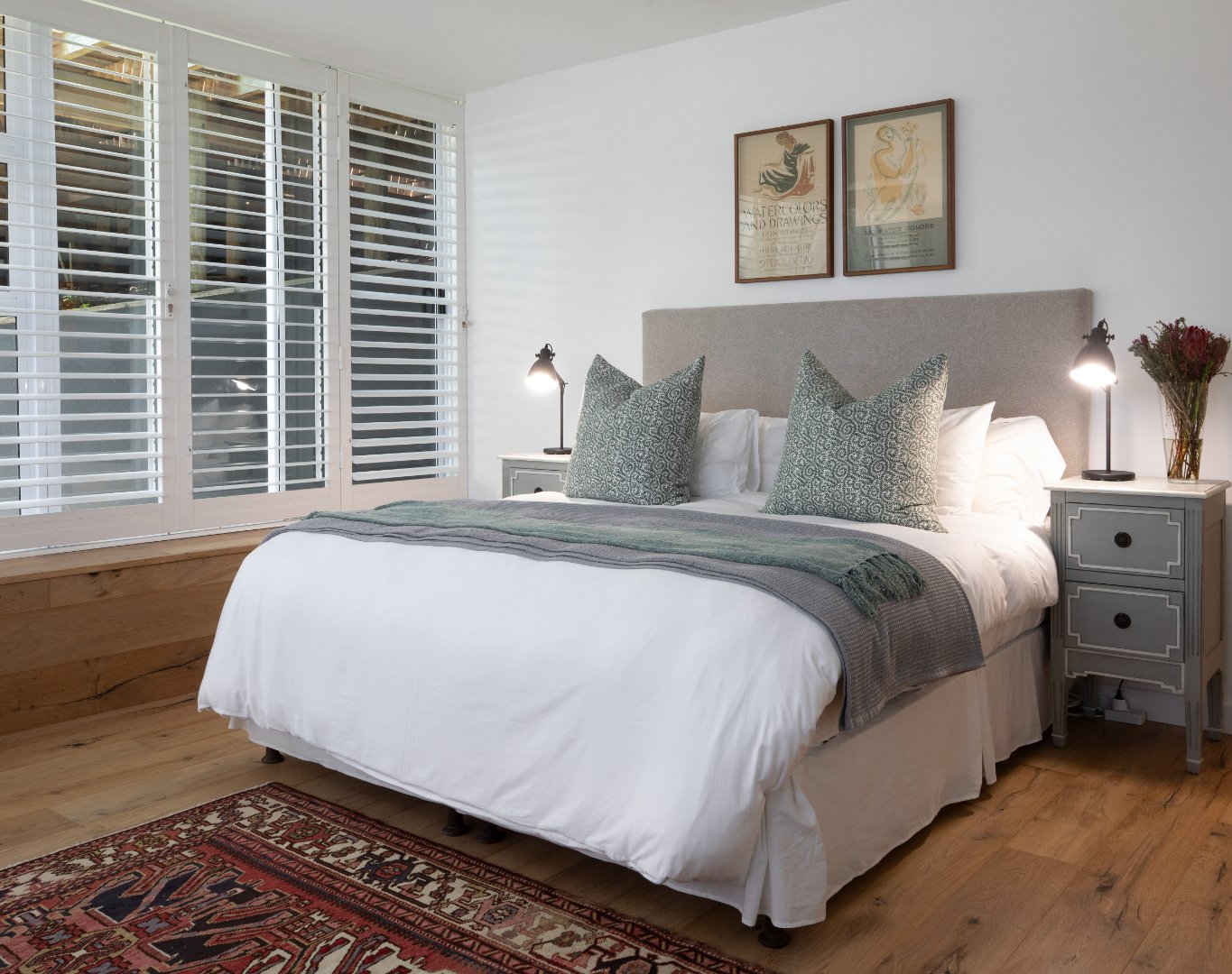 A sunny, open plan kitchen, extends to a dining area and open plan living space, which is complimented by roof trusses through which a marvellous view of Lion’s Head can be seen. This living area is surrounded by floor to ceiling stacking doors, opening over panoramic views of Clifton 3rd Beach to the front, where you can watch the amazing Cape Town sunsets and hear the crashing of the waves. The stacking doors to the side, open onto an expansive wooden deck and pool. The privacy of this entertainment area is enhanced by the surrounding trees and flora. A sauna below the pool deck, completes this entertainer’s dream. The bungalow has a private door that opens onto the steps of 3rd Beach, which is just a stone’s throw away.
