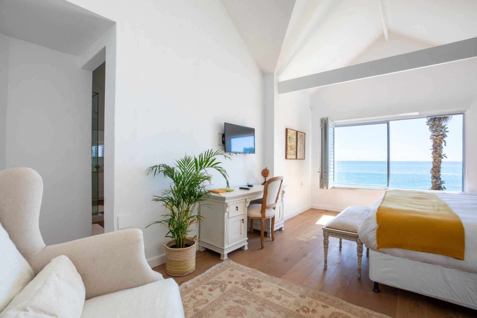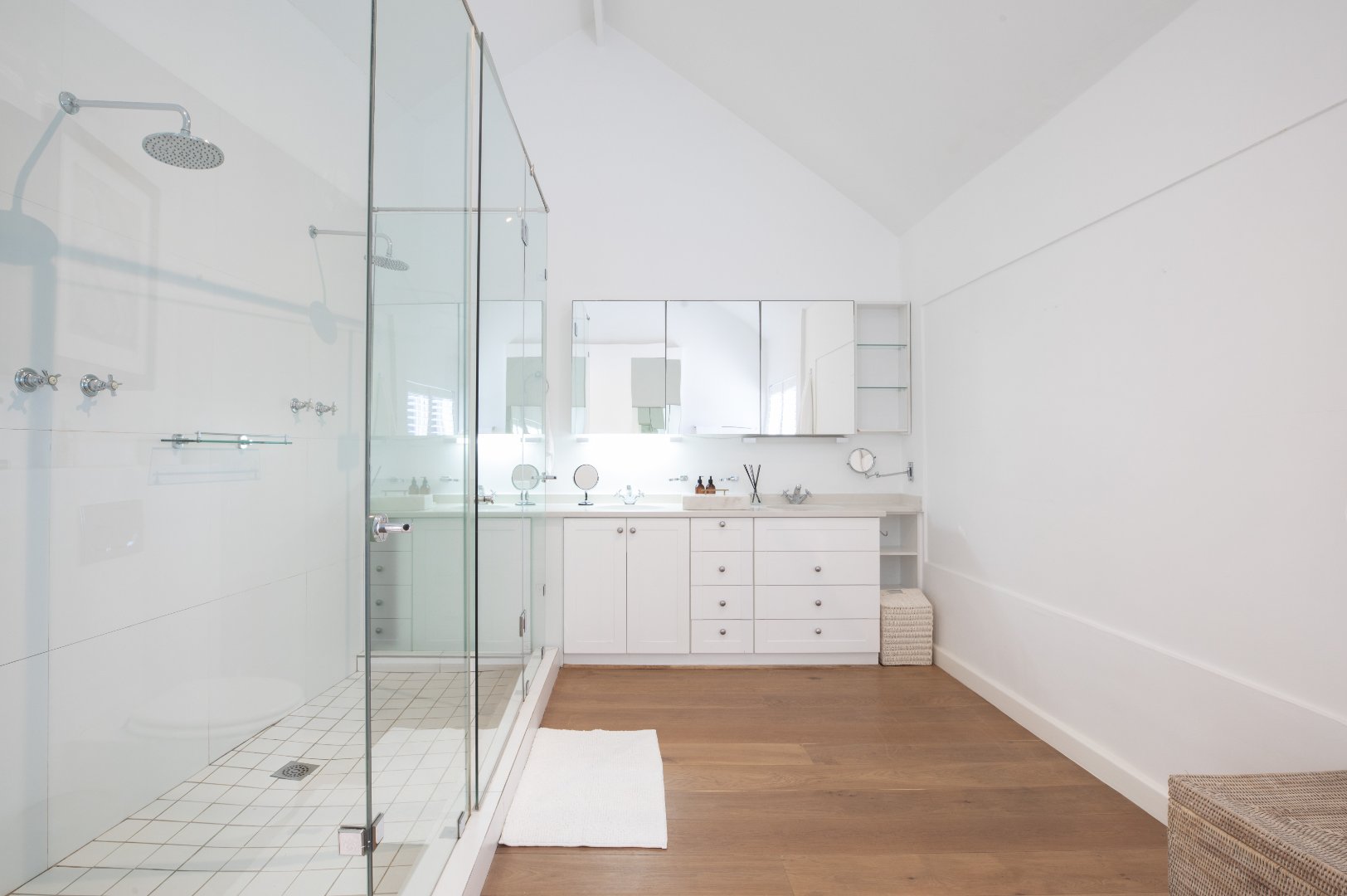 There are 3 bedrooms, all en suite, with the main bedroom on the ground floor. This bedroom is sizeable and overlooks third beach. The main bathroom has a large bath overlooking the ocean, a double shower and double basins.