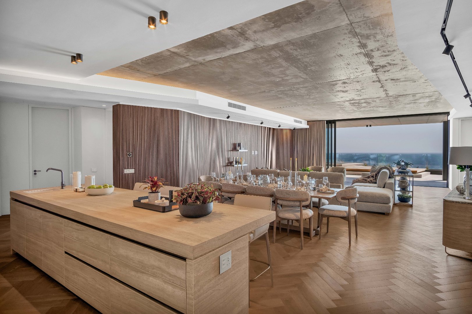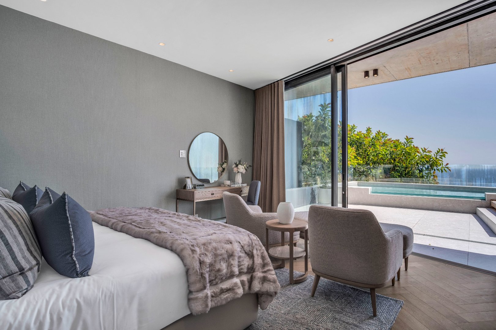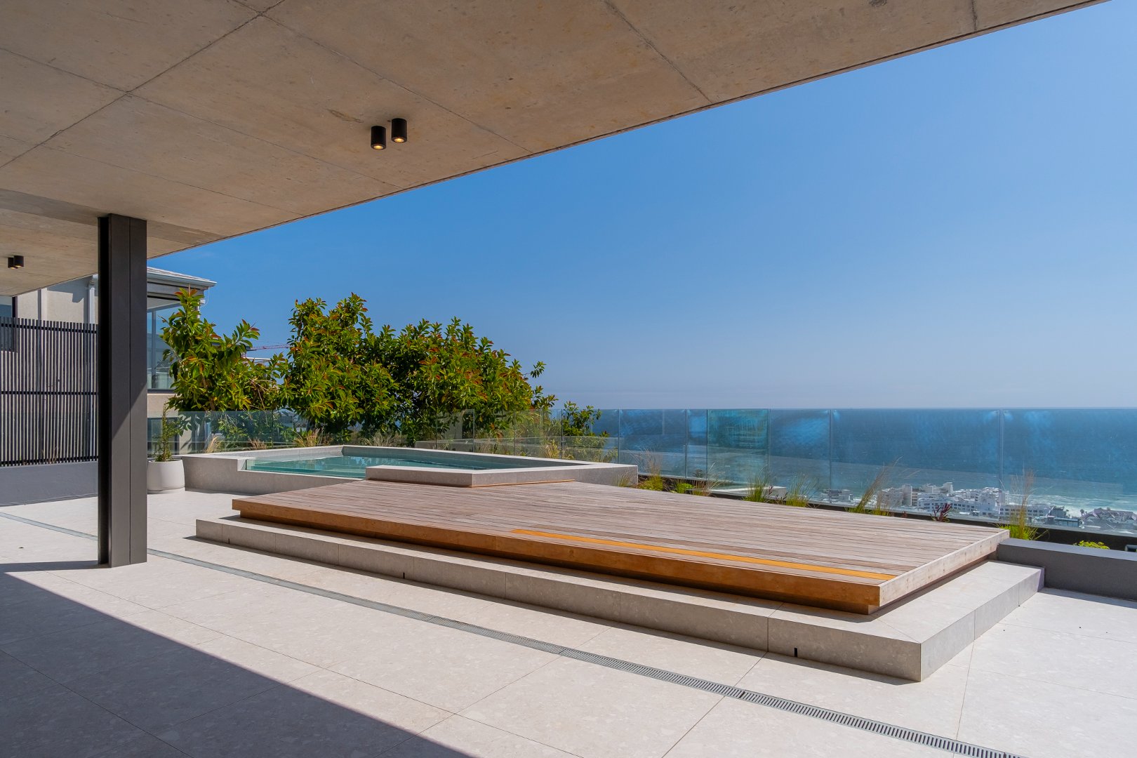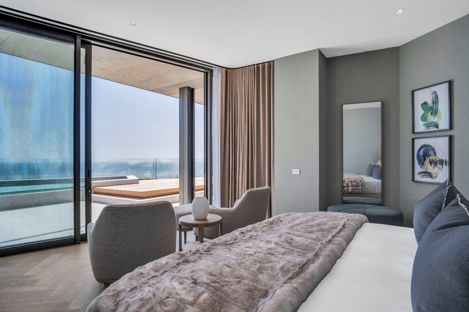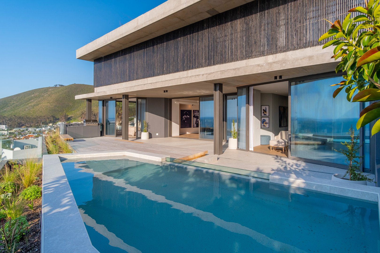 The expansive open-plan layout effortlessly blends the kitchen, lounge, and dining area, perfect for both entertaining and relaxation. Floor-to-ceiling glass doors lead you to an expansive pool terrace that offers breathtaking views of the iconic Atlantic Seaboard. Picture yourself soaking up the sun by the pool, surrounded by stunning vistas that change with the light of the day.