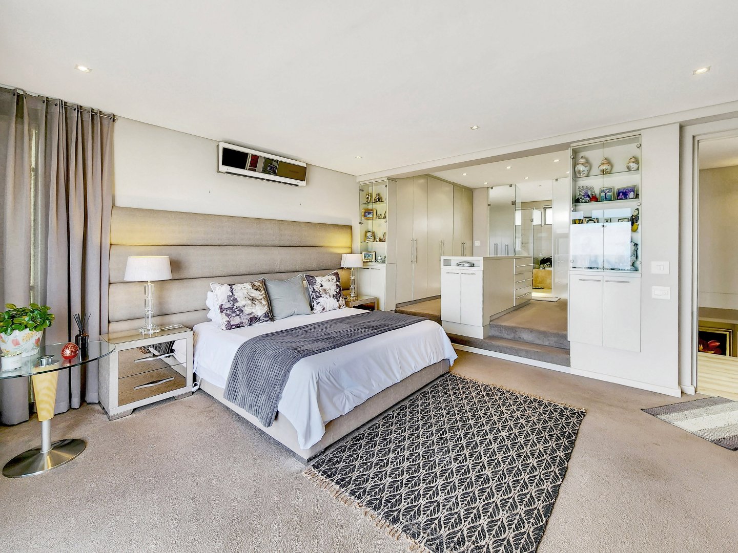 The upper level features three spacious ensuite bedrooms with underfloor heating and heated towel rails. The master bedroom with a separate dressing area and a lavish double-volume bathroom.