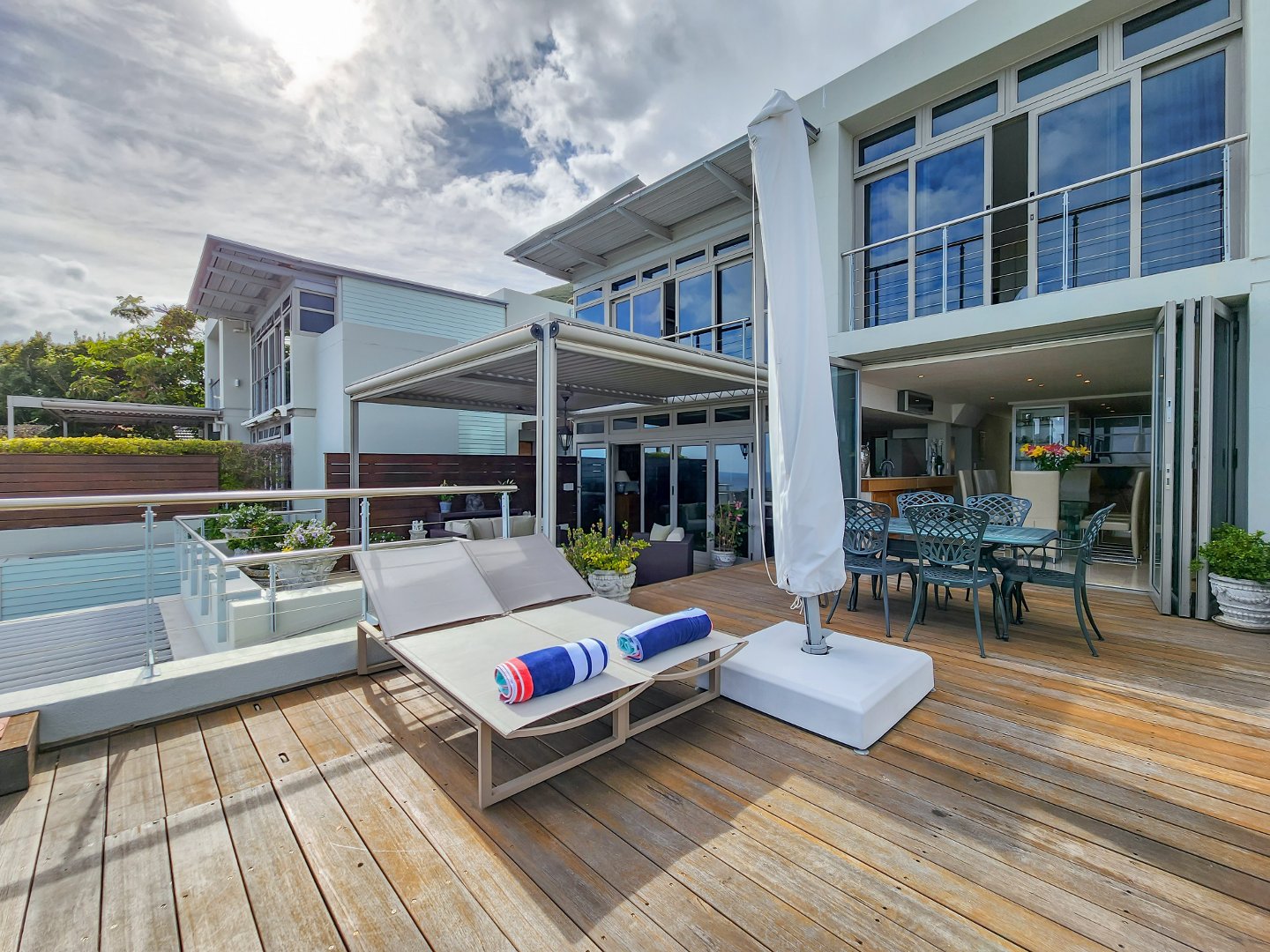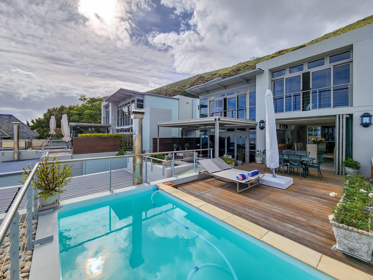Located in an exclusive complex with only four units, one enters to an impressively designed entrance hall leading to spacious living and dining areas, connecting seamlessly to a generously sized entertainment terrace with a plunge pool accessible through floor-to-ceiling double-glazed doors offering the ultimate in indoor-outdoor living. The outside space comes fitted with an aluminium pergola with automatic blinds. The TV room/bar features an open plan layout area and is connected to the lounge, with access to a charming private garden. The property features a modern open-plan kitchen with a separate scullery, offering the very best in entertainment. In addition, a guest WC is also located on the main entertainment level.