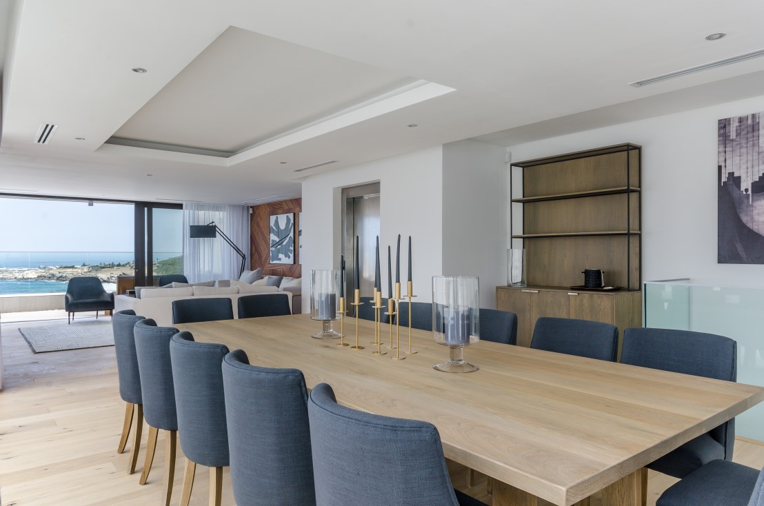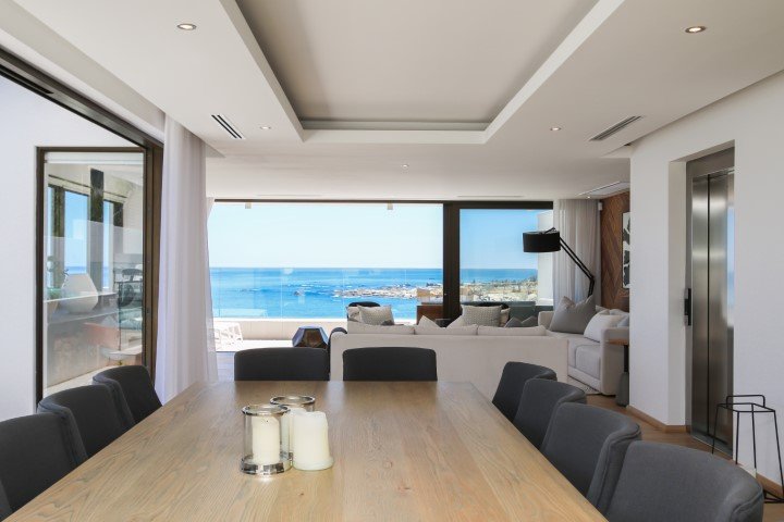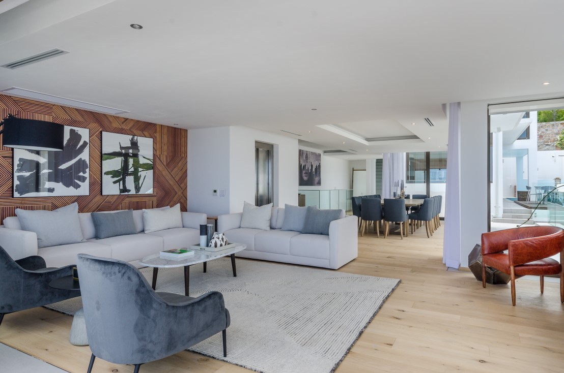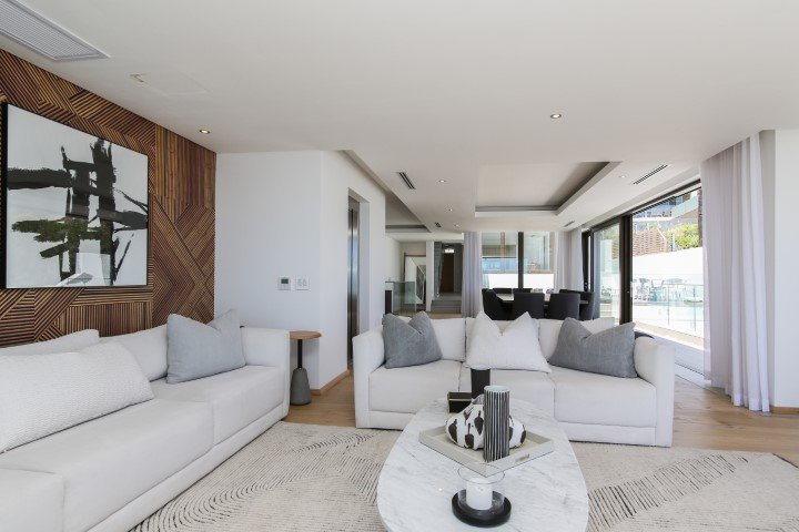 This spectacular, modern villa is both spacious and bright, with each of the 5 levels showcasing stunning ocean and mountain views from sunset to sundown. You are welcomed into an open plan lounge and dining room with floor to ceiling glass sliding doors opening onto patios, with magnificent sea and mountain views. An additional living room and kitchen flow seamlessly from the lounge and dining room, creating an ideal living area for entertaining and every day living. A patio and a sparkling pool, flow from the kitchen, making outdoor sunshine living so easy to enjoy. On the 4th and 5th floor, you have 5 bedrooms each with an ensuite bathroom. The master suite has an outdoor patio, boasting a jacuzzi. In addition to the 5 bedrooms there is a 1 bedroom duplex, with its own kitchen and bathroom above the double garage. This villa is ideal for a group or a large family who enjoy space.