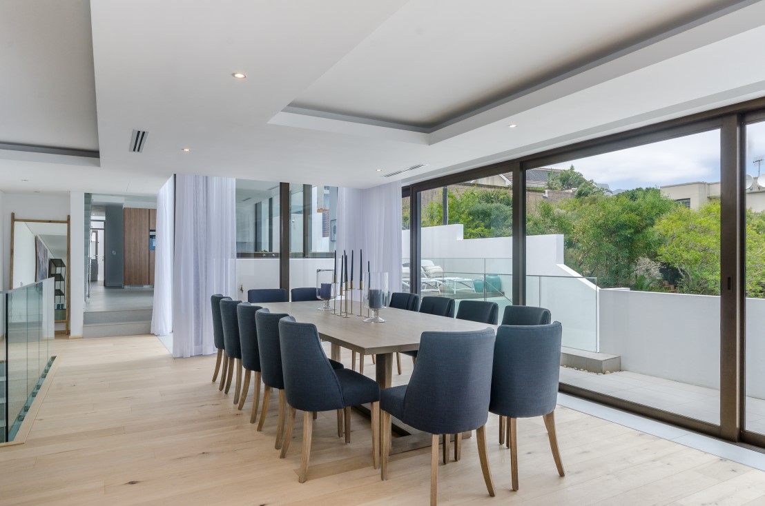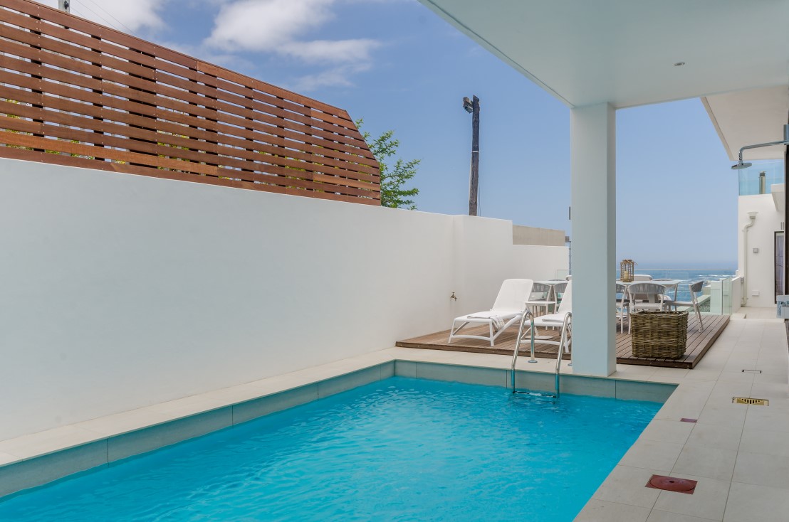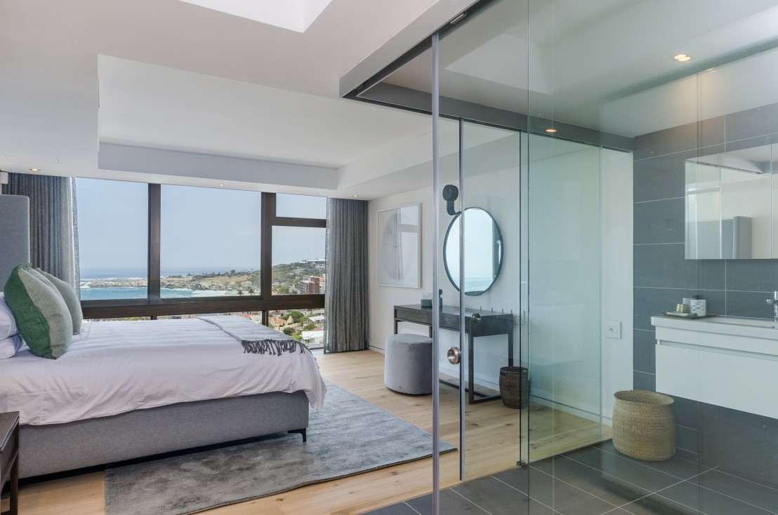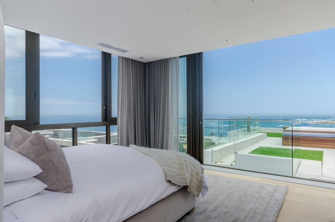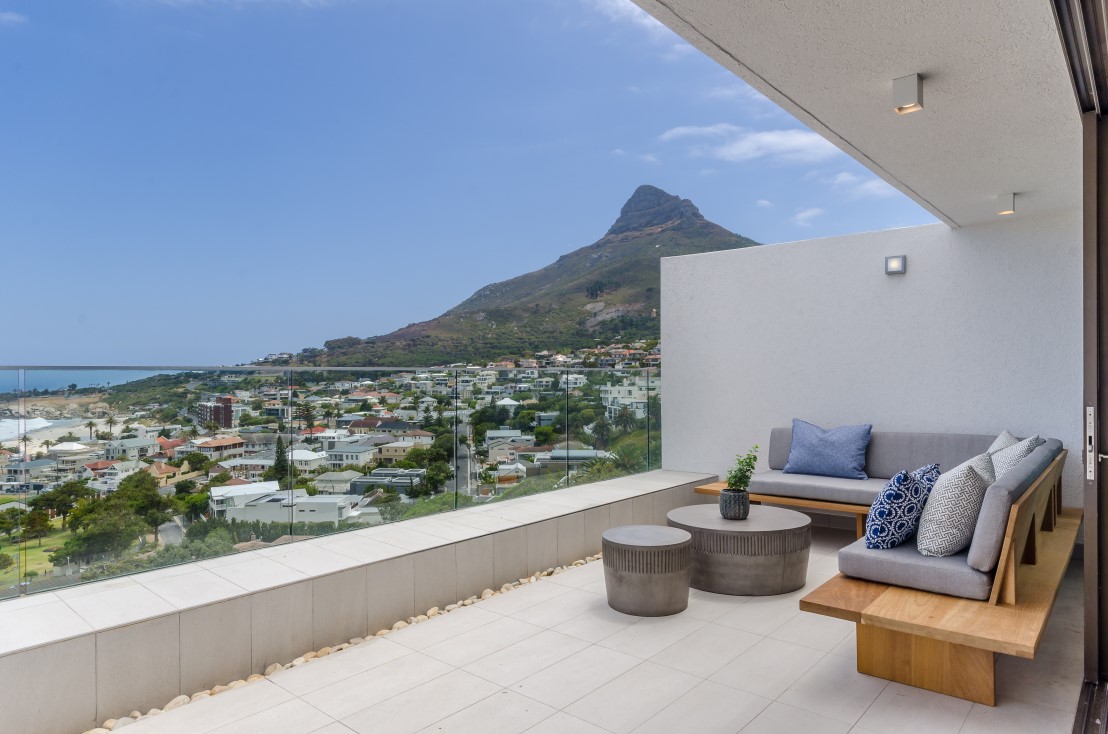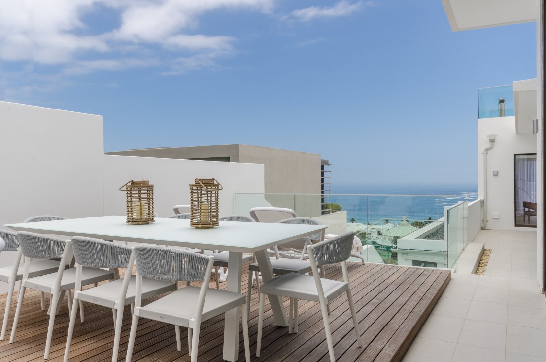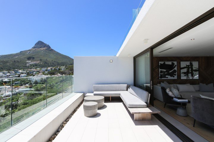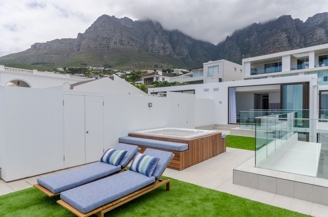 The villa has great entertainment features such as the cleverly designed wind secluded swimming pool, a terrace for outdoor dining, a BBQ and a roof top jacuzzi with its own separate deck for relaxing on. The villa has a secure integrated garage with room for 2 cars and the house is serviced by a lift from the ground to the 3rd floor, with two ways to enter; through the garage or through the front door. It is only a 5 min walk from the world famous Camps Bay beach and vibey promenade with shops and restaurants.