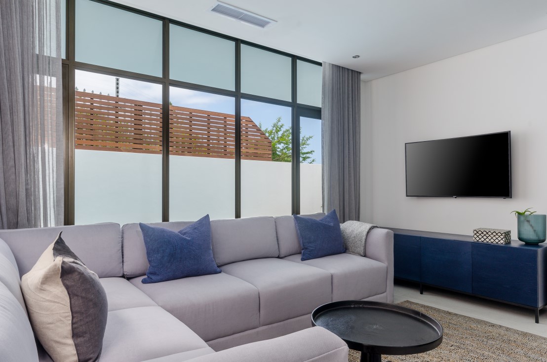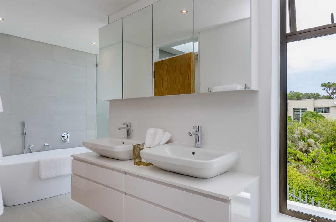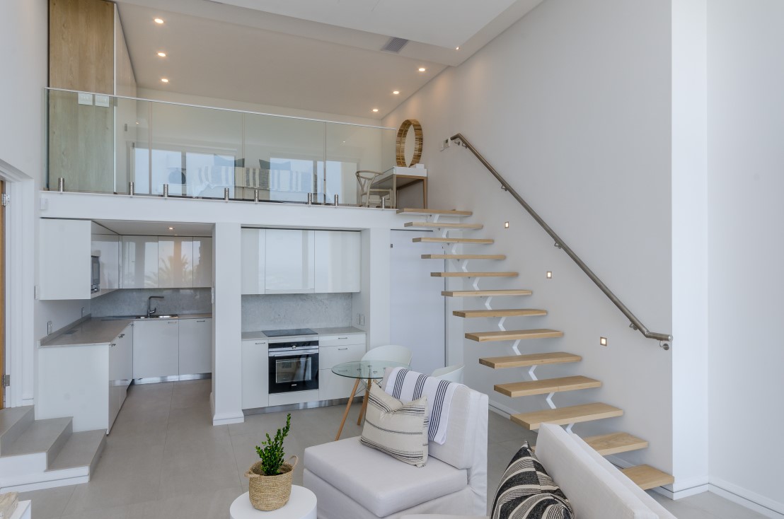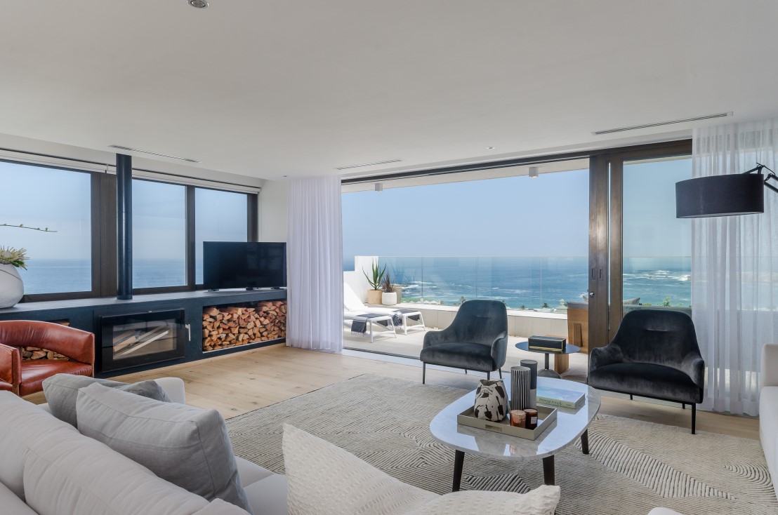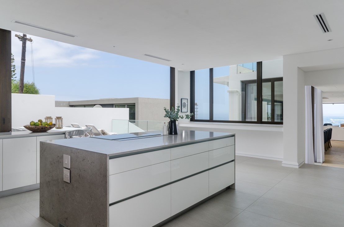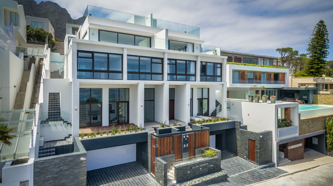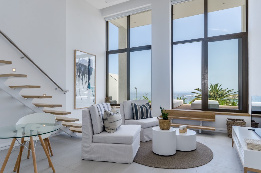 The villa has great entertainment features such as the cleverly designed wind secluded swimming pool, a terrace for outdoor dining, a BBQ and a roof top jacuzzi with its own separate deck for relaxing on. The villa has a secure integrated garage with room for 2 cars and the house is serviced by a lift from the ground to the 3rd floor, with two ways to enter; through the garage or through the front door. It is only a 5 min walk from the world famous Camps Bay beach and vibey promenade with shops and restaurants.