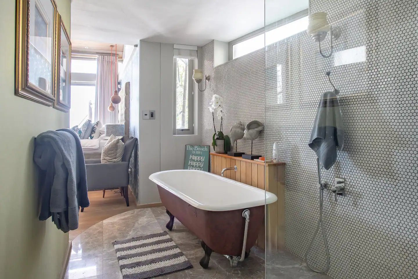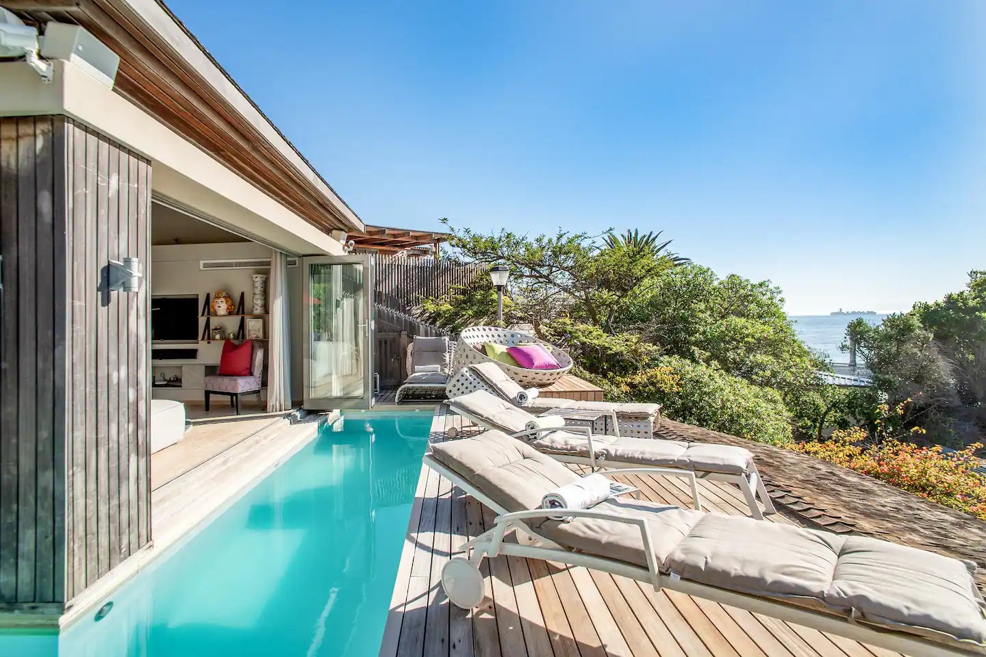 This bungalow is nestled in the prestigious Clifton area on the Atlantic Seaboard of the Western Cape. Clifton’s Third Beach is a protected nature reserve offering one of the most awe-inspiring settings on Earth. Known as Cape Town’s St. Tropez, Clifton boasts four stunning white sandy beaches separated by majestic granite boulders. These paradisiacal shores are just steps away from the bungalow, conveniently located only one kilometre from shops, nightlife, and restaurants.