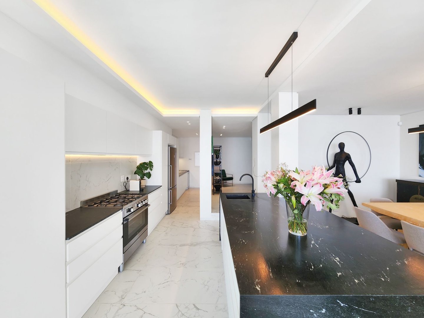 The property has been designed with entertaining in mind. Indoors, you’ll find a chic dining area and a state-of-the-art kitchen equipped with all the essentials for culinary creations. Step outside, and you’re greeted by an alfresco dining space, ideal for long summer lunches or starlit dinners.