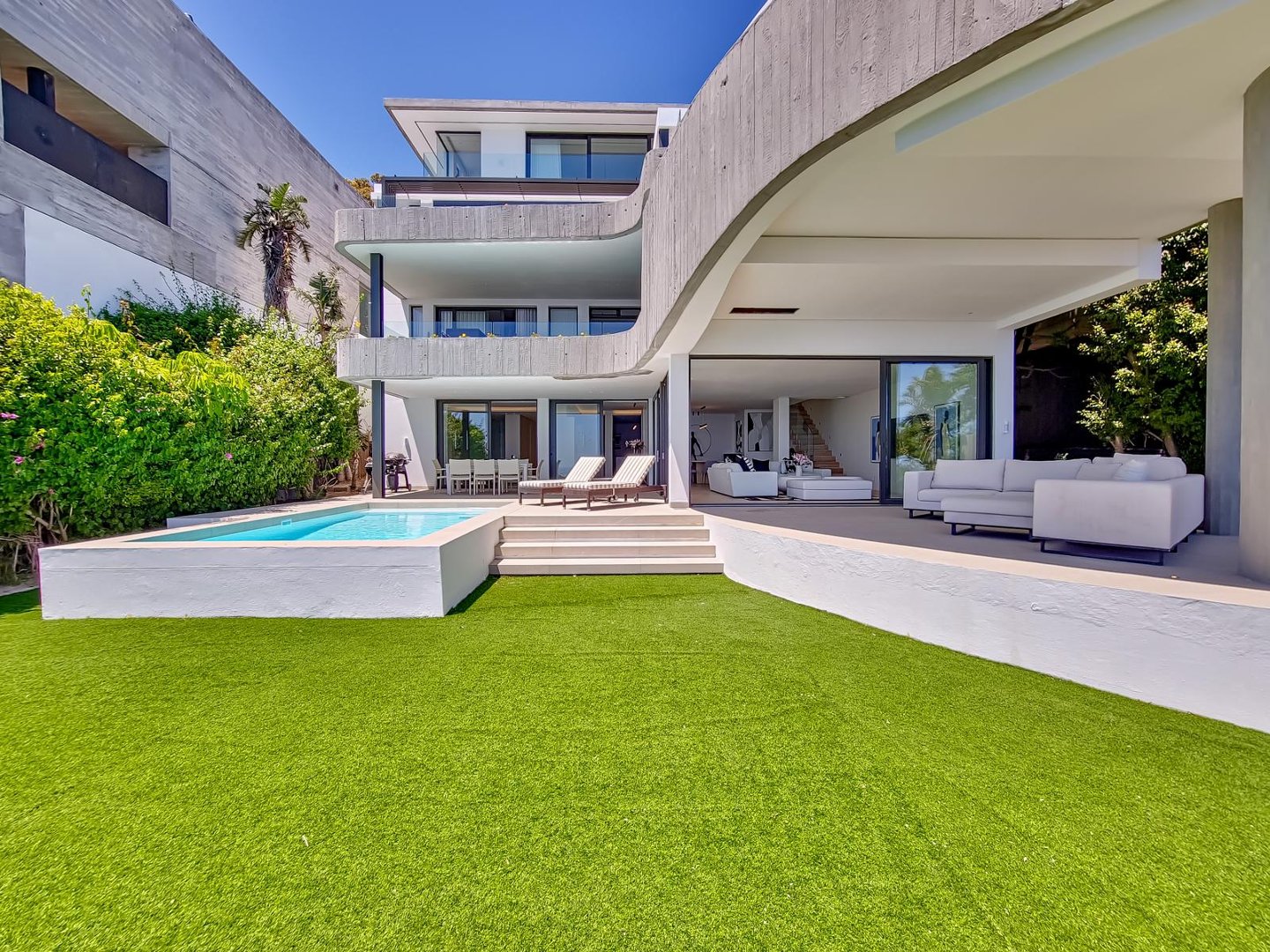 The entertainment spaces don’t stop there. The private pool is perfect for cooling off on warm days, while the lush lawn invites relaxation and play. Whether you’re lounging by the pool with a cocktail in hand or enjoying a family barbecue, every moment here feels special.