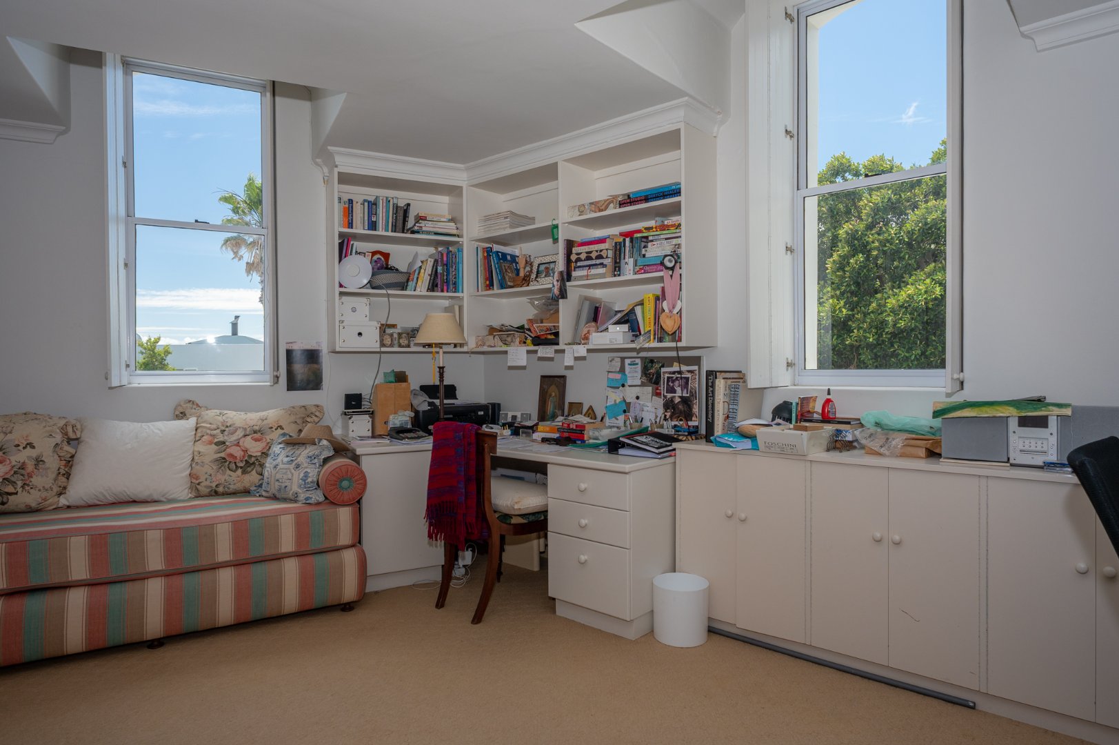 The upper level of the property hosts the main living suites, there are three bedrooms one of which is currently being utilised as a study. The master is ample in size and offers magnificent views and leads out onto a sun-drenched terrace as well as having french shutters for when the sunlight is unwanted, the master has an en-suite bathroom which is large in size, comprising of double sinks, a bath and a shower with ocean views. The second bedroom is also front-facing and has direct access to the terrace, the second bedroom and third bedroom share a bathroom, but is an ensuite from the second bedroom and an additional door for access from the third bedroom.