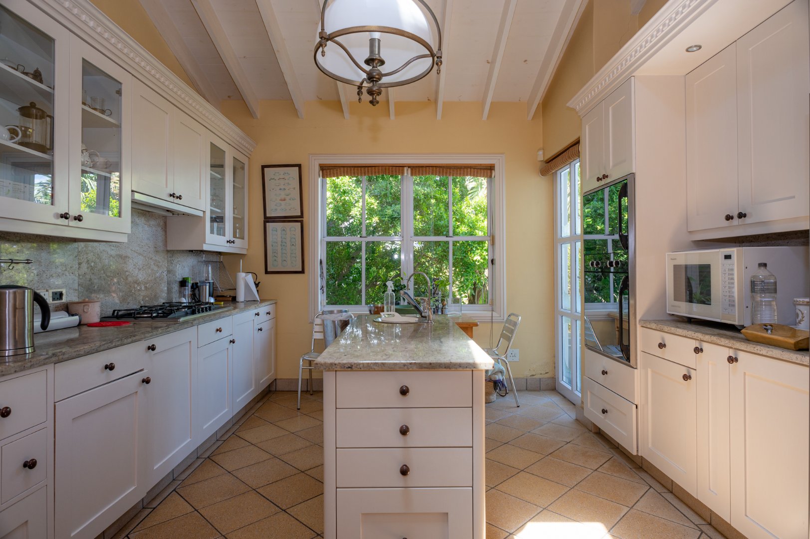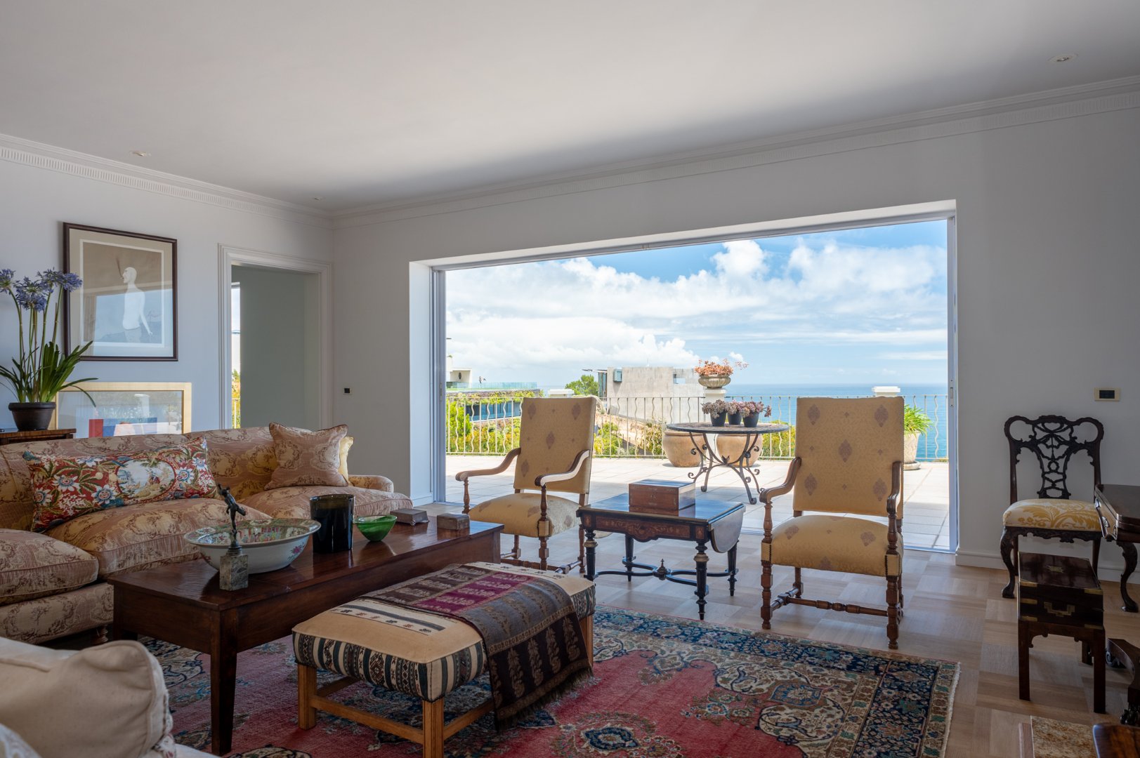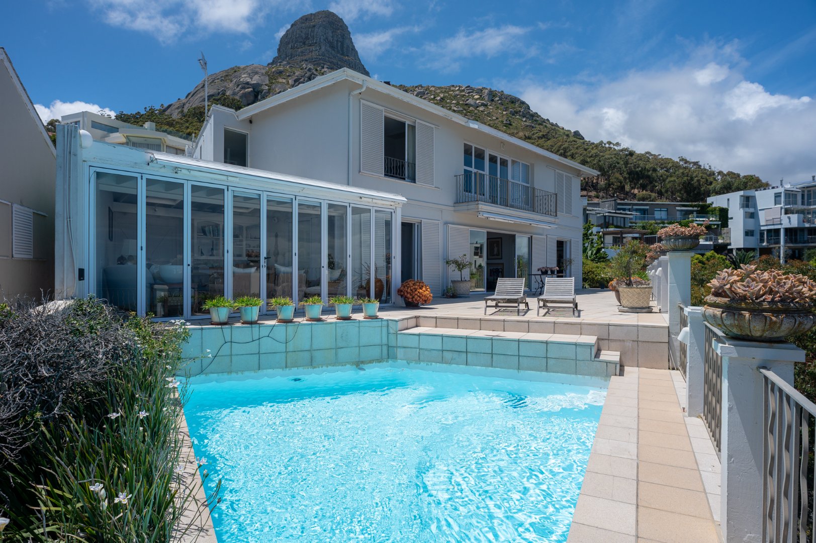 As one enters they are met with incredible views from the main reception room which boasts natural light and has a gas fireplace, this room leads into a formal dining room which has direct access to the terrace and kitchen which comes equipped with a scullery and a separate outside lane for washing needs. The main reception area also flows onto another less formal entertainment lounge and an additional tv lounge all of which have stackable doors that open onto a large entertainment terrace offering seamless indoor-outdoor living. The terrace is the ideal place to entertain or enjoy a meal as well as lounging by the pool during the summer months.