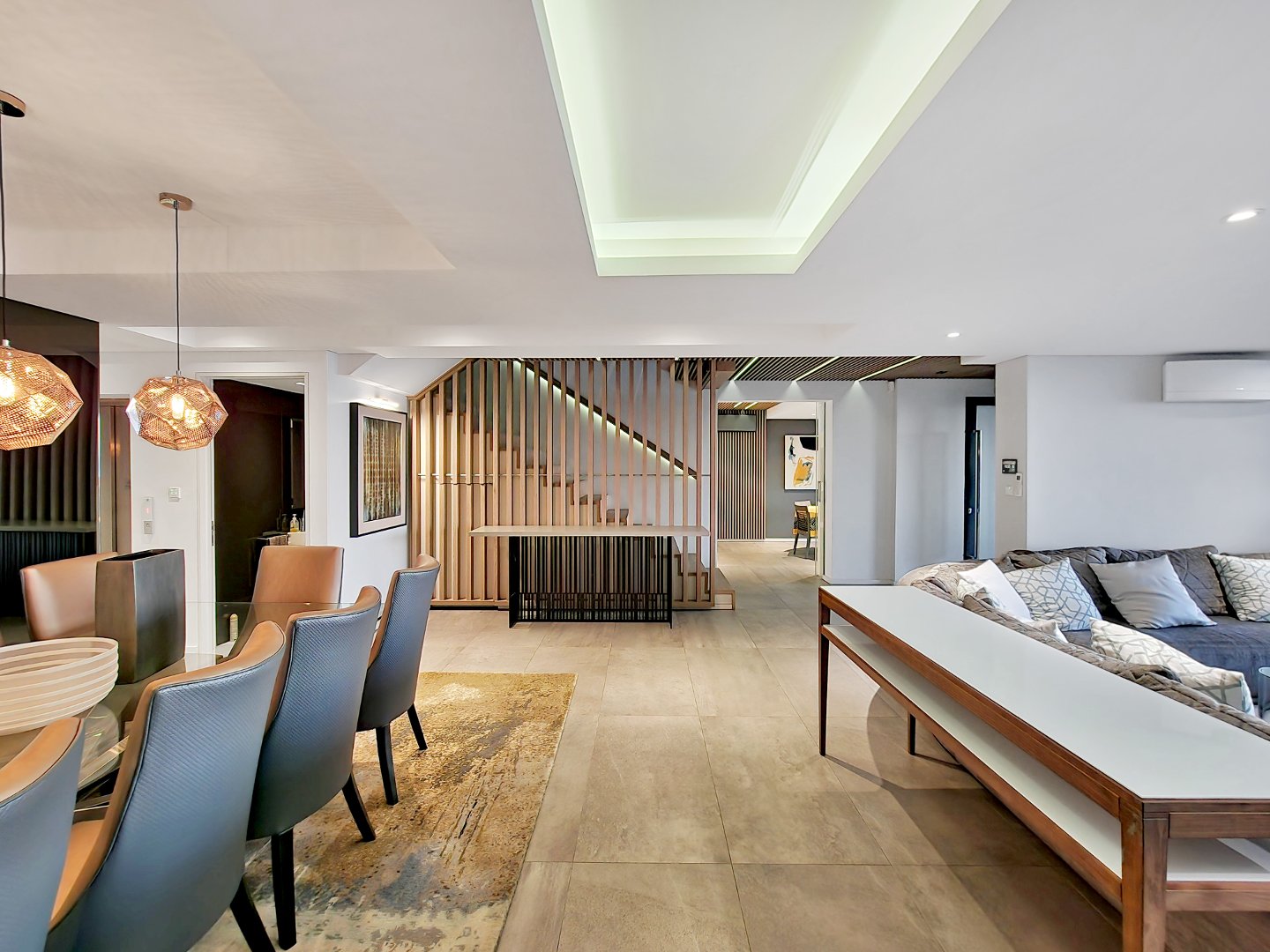 On the top floor, the master suite is complemented by two additional en-suite bedrooms and a cosy pyjama/TV lounge. The master bedroom offers breathtaking ocean views, a large balcony, a concealed TV with a hydraulic lift, a spacious dressing room, and an elegant en-suite bathroom.