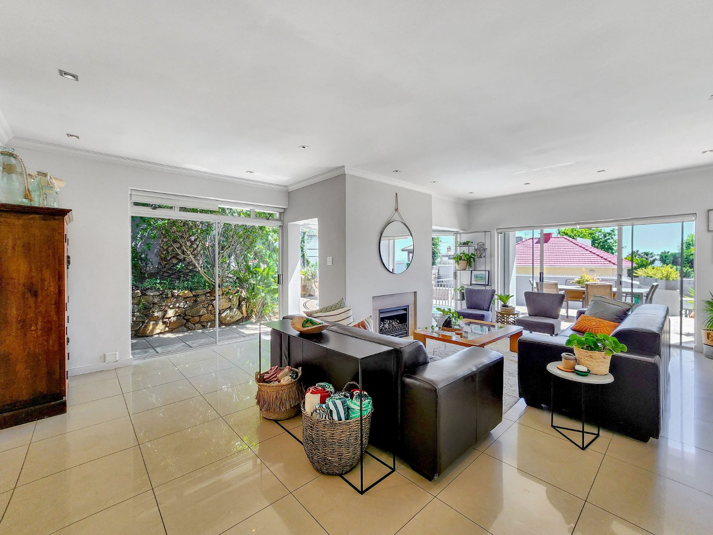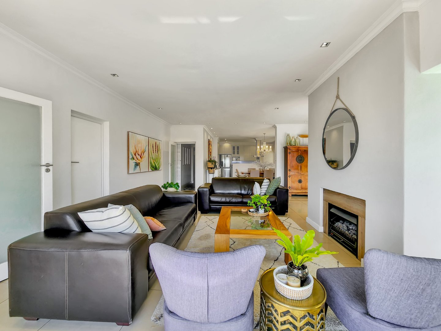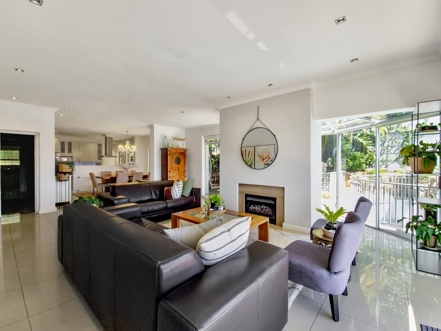 Designed with an open-plan concept, the property showcases a seamless connection between indoor and outdoor living, with sliding glass doors that facilitate a smooth transition. On the ground floor, you’ll find a formal lounge and dining area overlooking the pool. This lounge is equipped with a gas fireplace and leads to the fully equipped kitchen, which features a separate section for laundry.