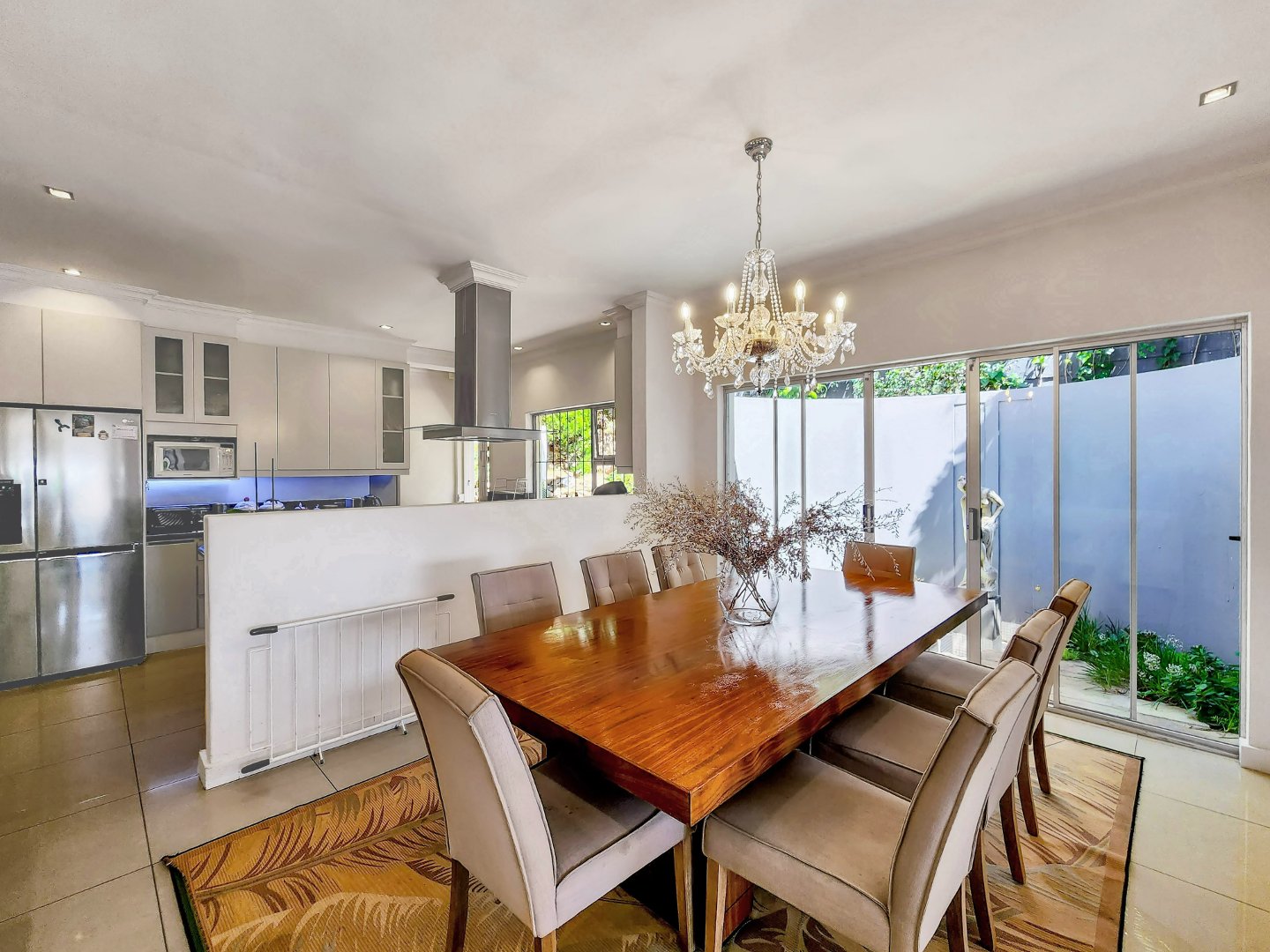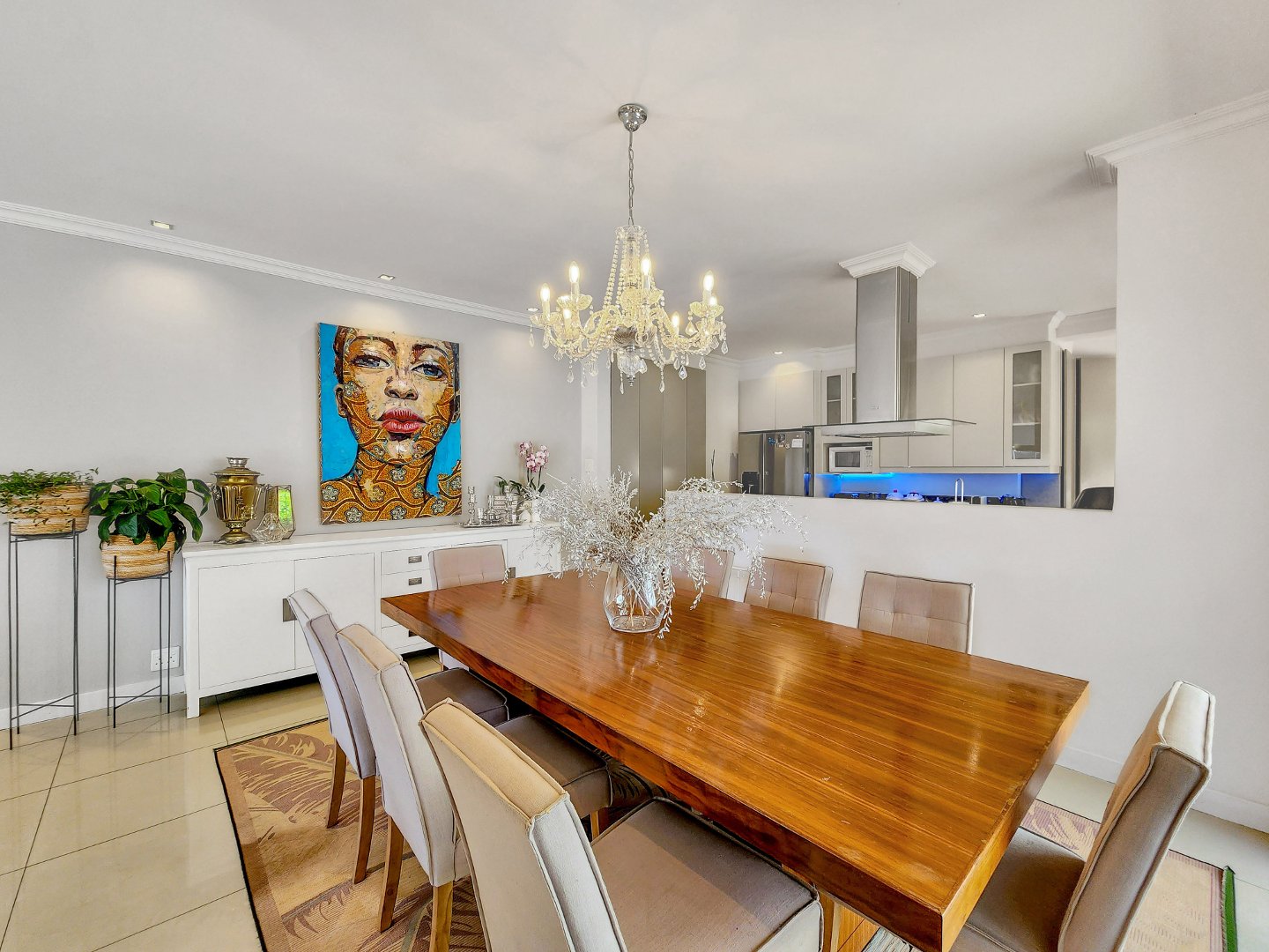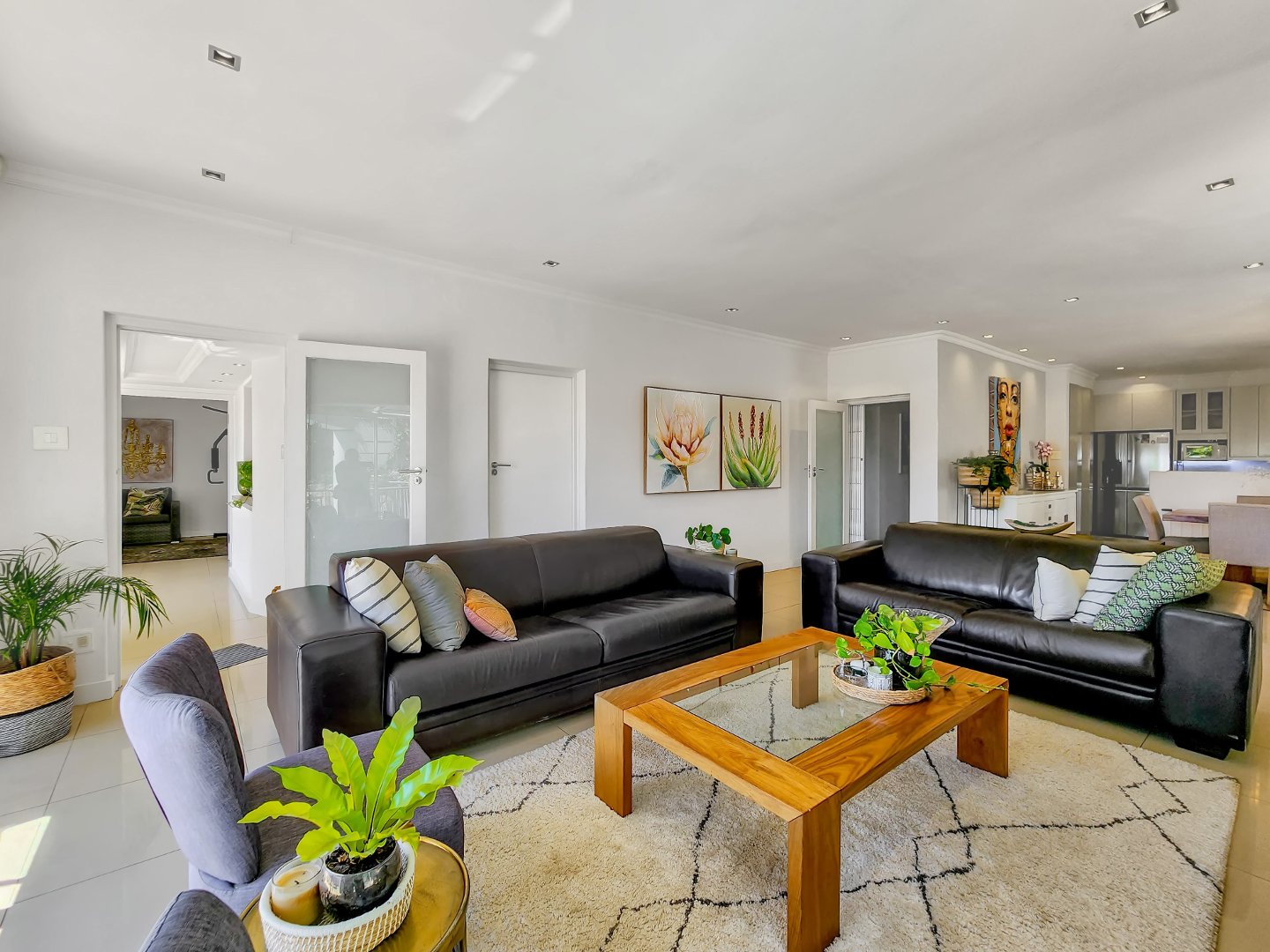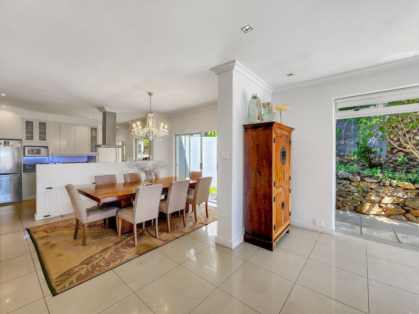 Designed with an open-plan concept, the property showcases a seamless connection between indoor and outdoor living, with sliding glass doors that facilitate a smooth transition. On the ground floor, you’ll find a formal lounge and dining area overlooking the pool. This lounge is equipped with a gas fireplace and leads to the fully equipped kitchen, which features a separate section for laundry.