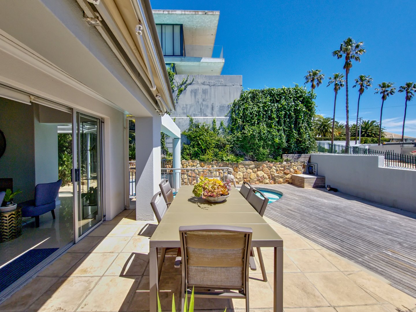Upon entering the premises, you are immediately greeted by a spacious outdoor entertainment deck that includes a swimming pool, generous lounging areas, and a dining space.