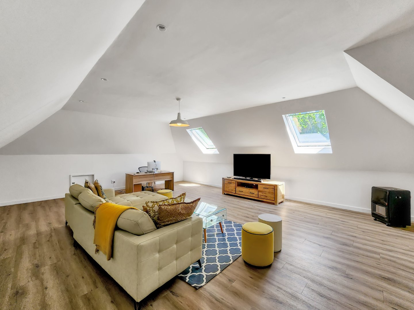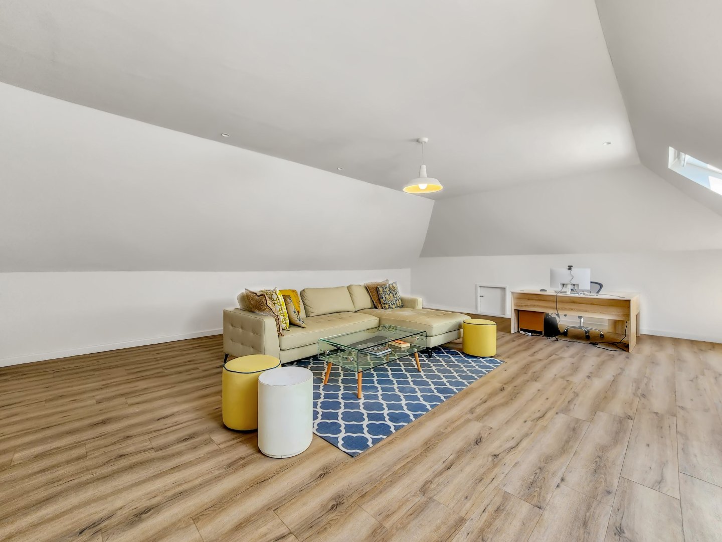 Additionally, the upper level accommodates a spacious room suitable for various purposes, such as a home office, playroom, family room, studio, or gym.