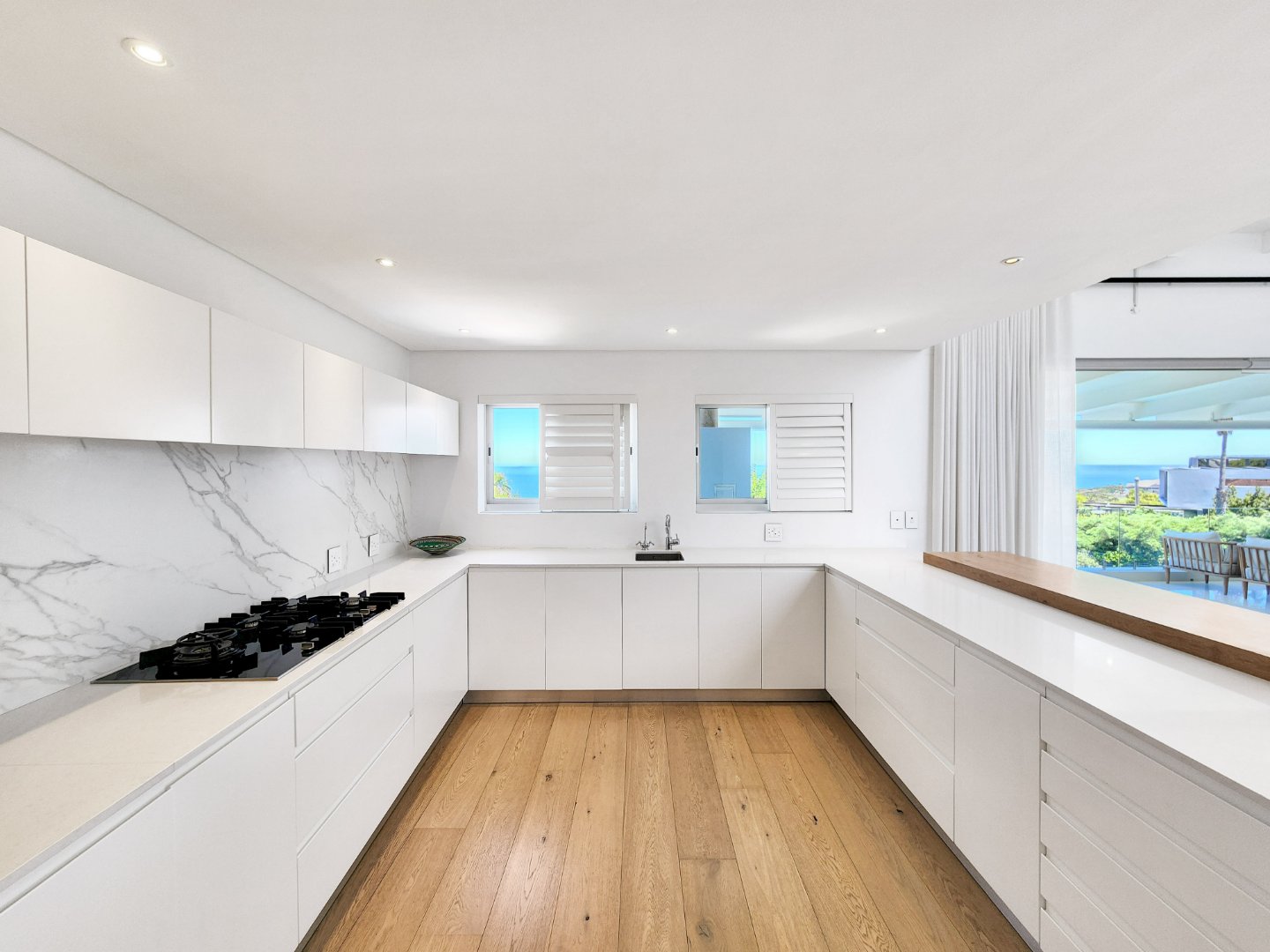 Step outside into an expansive landscaped garden, a tranquil haven of lush greenery that’s perfect for children to play or for hosting outdoor gatherings. The large, sparkling pool invites you to cool off while enjoying the spectacular views of the ocean, creating a serene and relaxing ambiance. These uninterrupted vistas can be admired from nearly every corner of the home, making this property a true sanctuary.