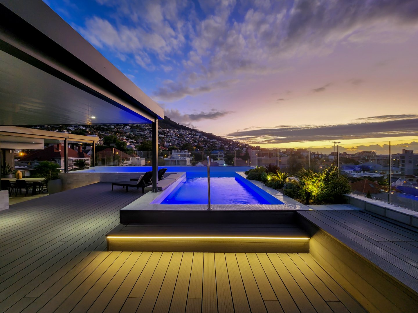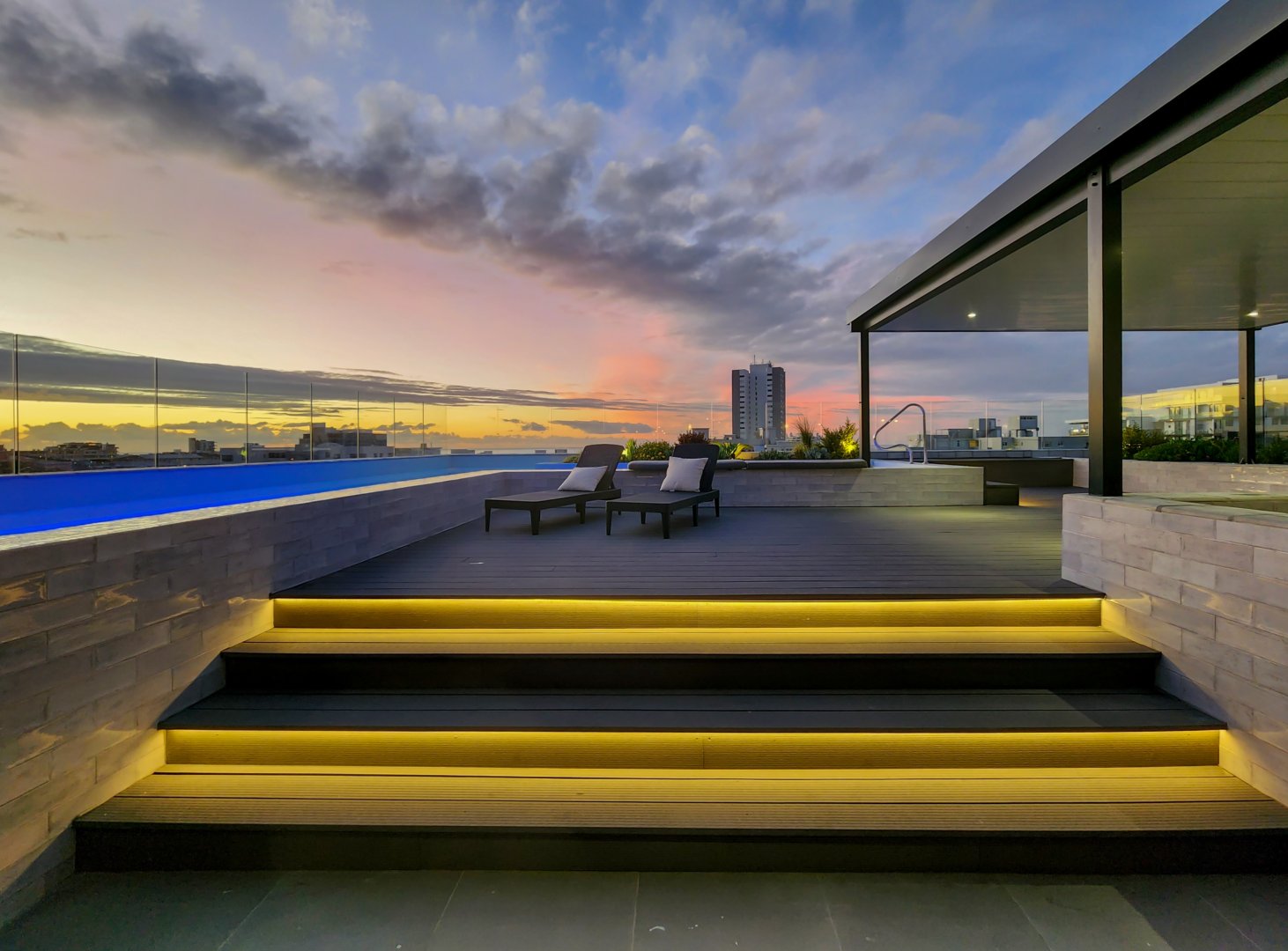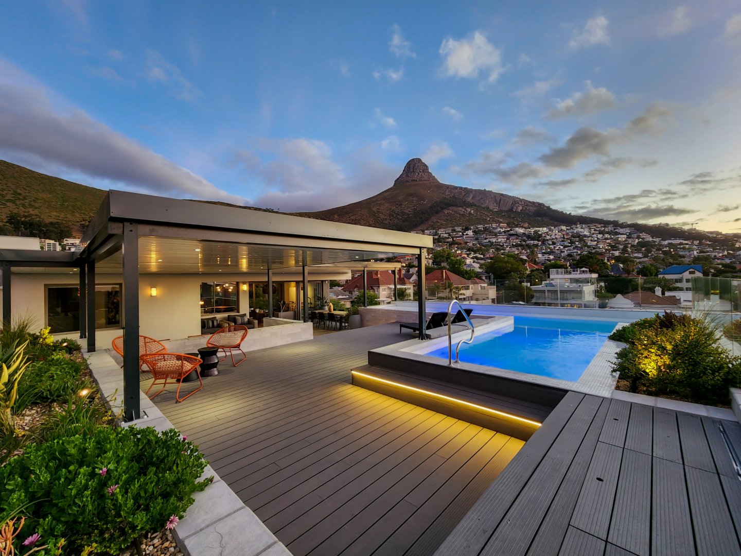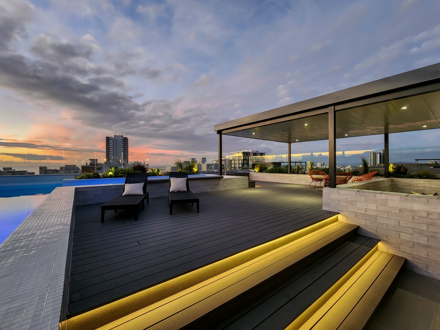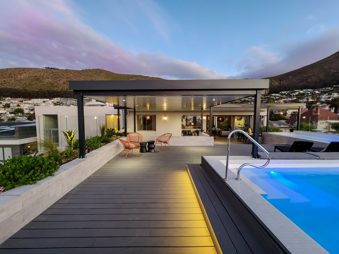 The enormous terrace boasts multiple entertainment areas, including covered outdoor dining and a built-in bar with a wine fridge. The upper deck has a covered chill-out zone, irrigated garden and sun lounging area. All this leads to the amazing pool. At night the deck is just as beautiful illuminated by the lights of the pool, LEDs on the stairs, or dimmable pergola and garden lights.