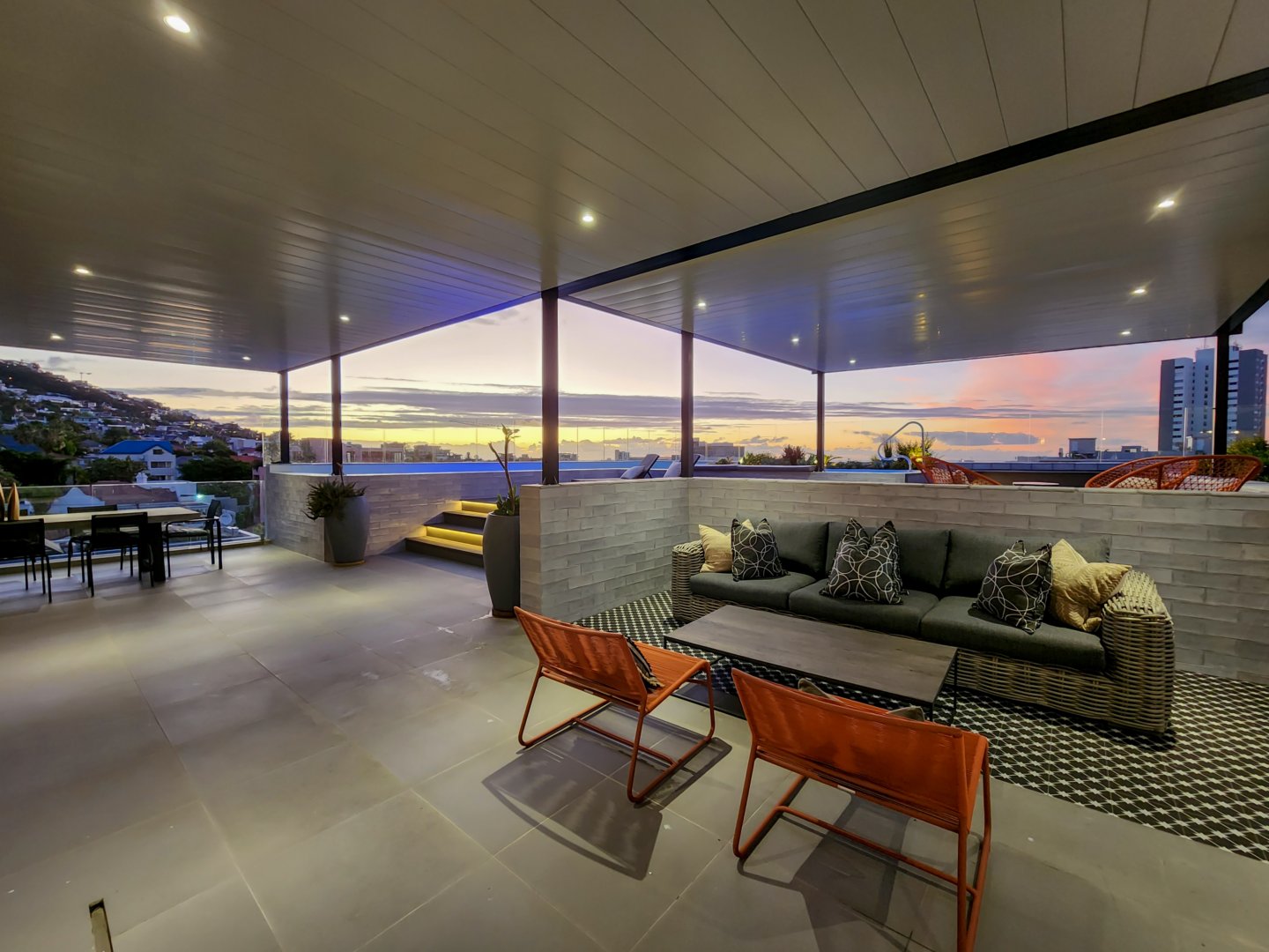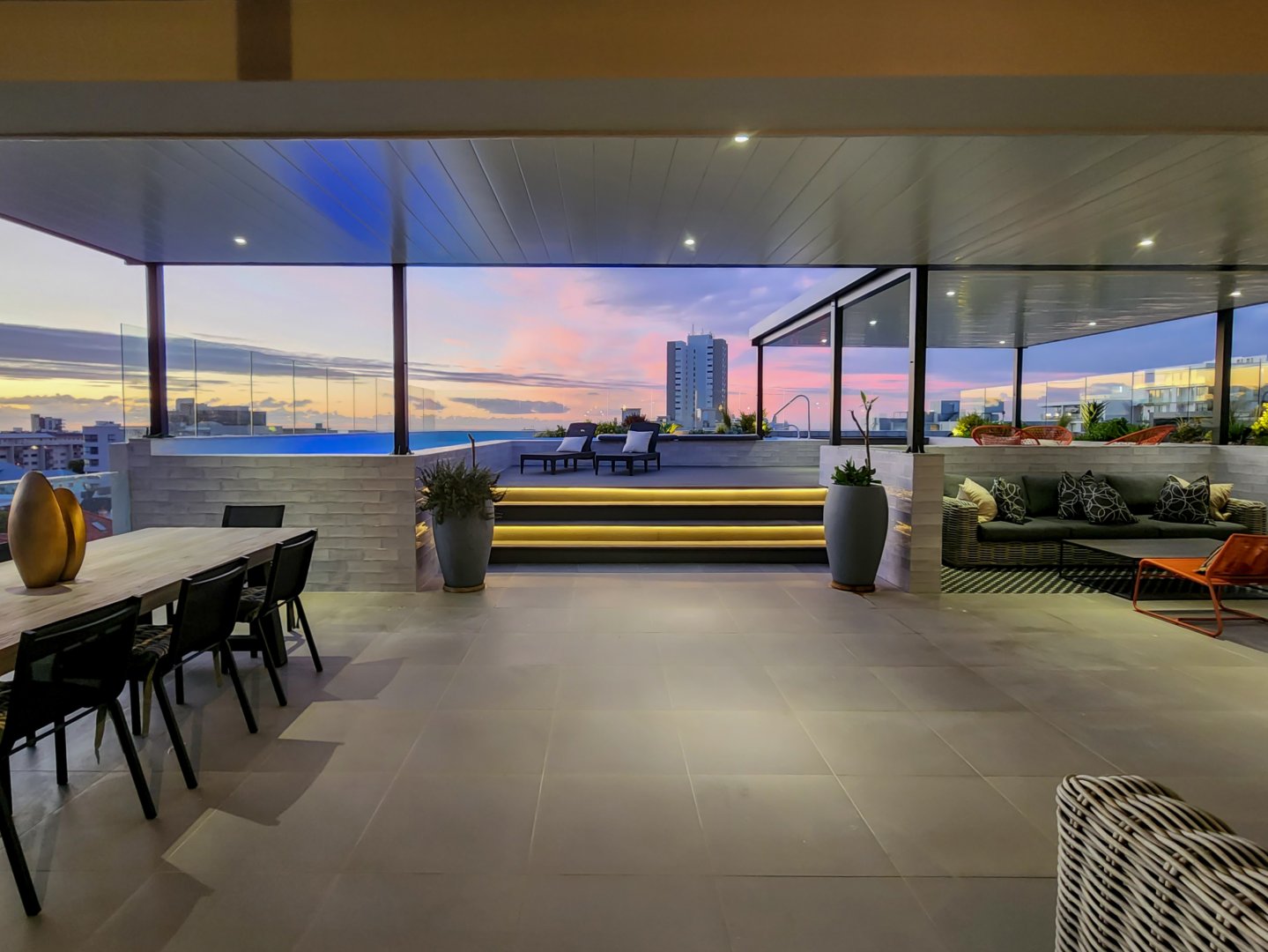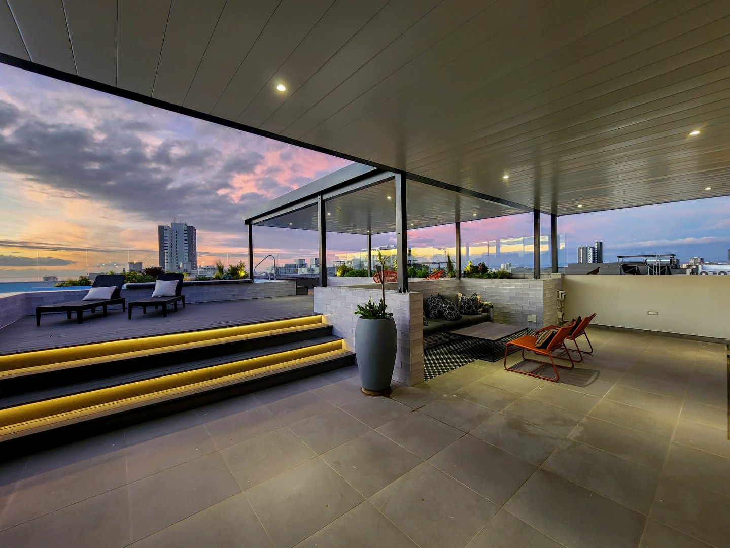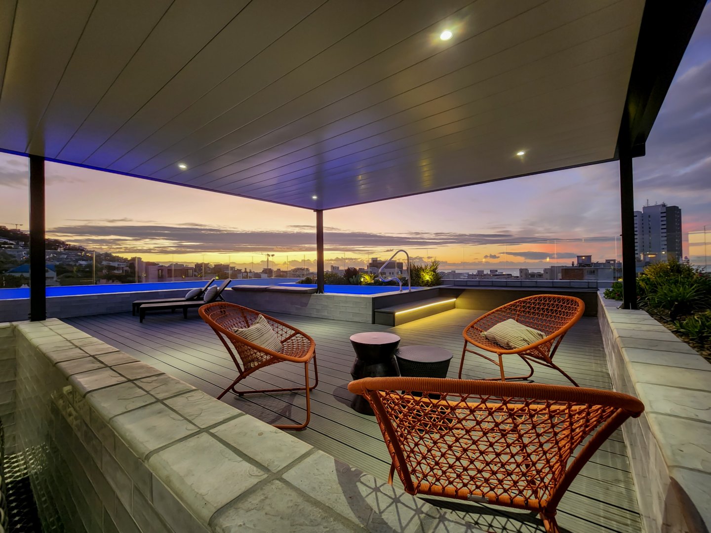 The enormous terrace boasts multiple entertainment areas, including covered outdoor dining and a built-in bar with a wine fridge. The upper deck has a covered chill-out zone, irrigated garden and sun lounging area. All this leads to the amazing pool. At night the deck is just as beautiful illuminated by the lights of the pool, LEDs on the stairs, or dimmable pergola and garden lights.
