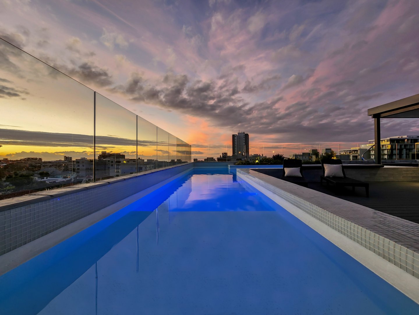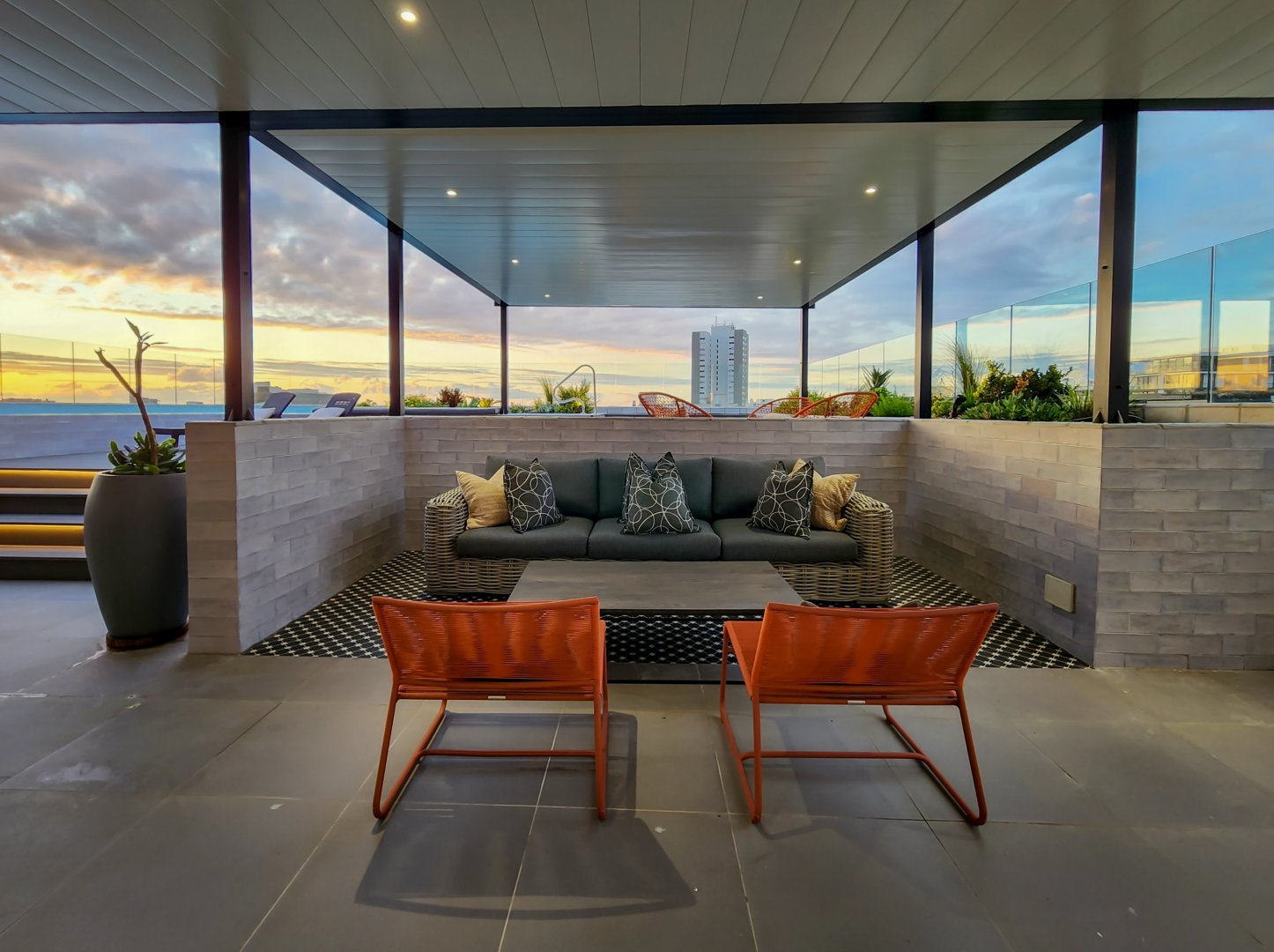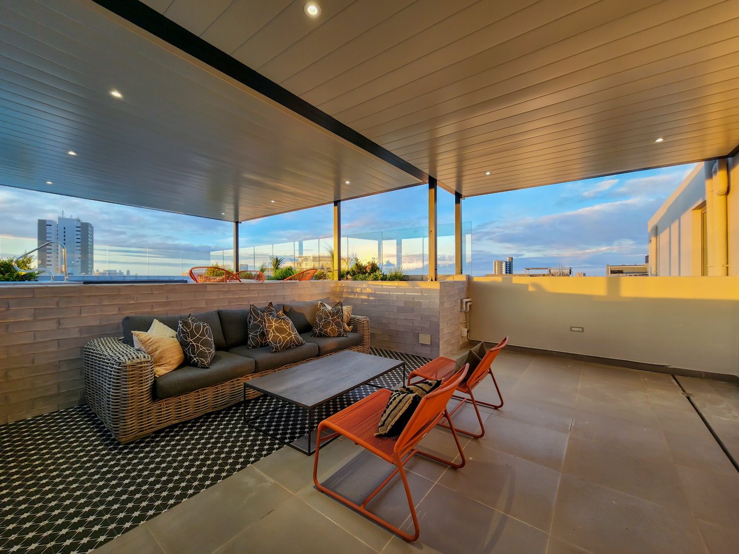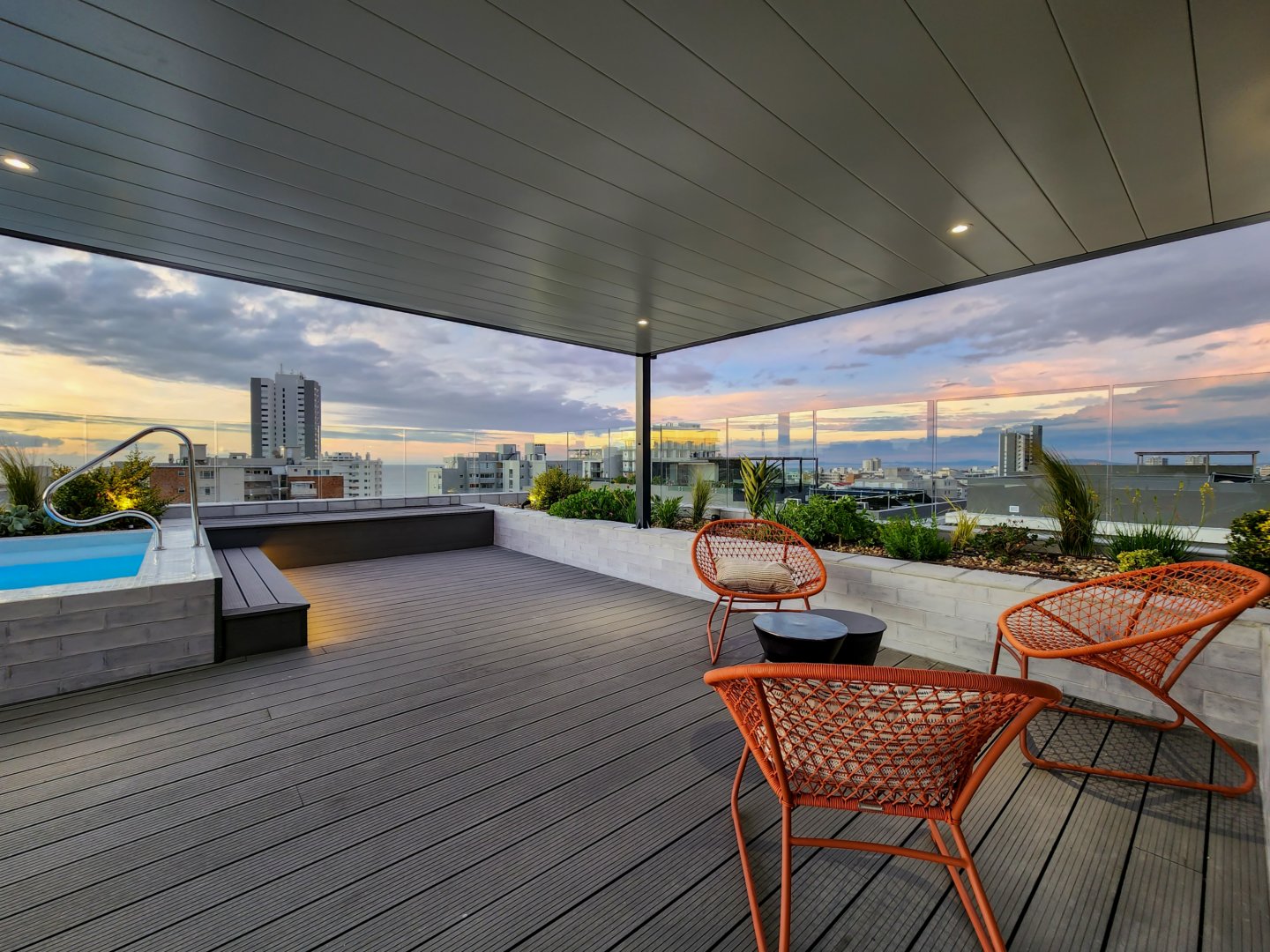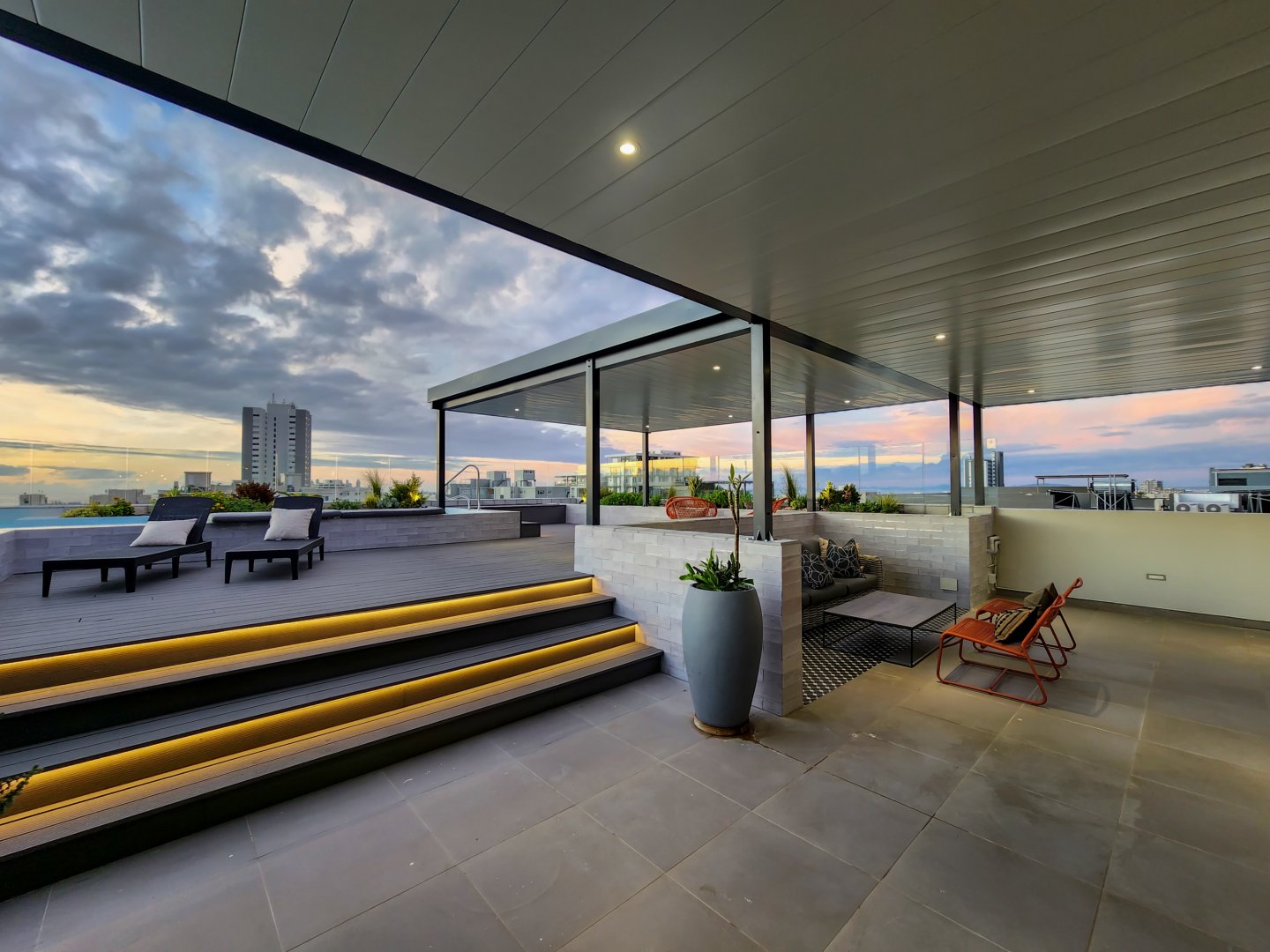 The enormous terrace boasts multiple entertainment areas, including covered outdoor dining and a built-in bar with a wine fridge. The upper deck has a covered chill-out zone, irrigated garden and sun lounging area. All this leads to the amazing pool. At night the deck is just as beautiful illuminated by the lights of the pool, LEDs on the stairs, or dimmable pergola and garden lights.