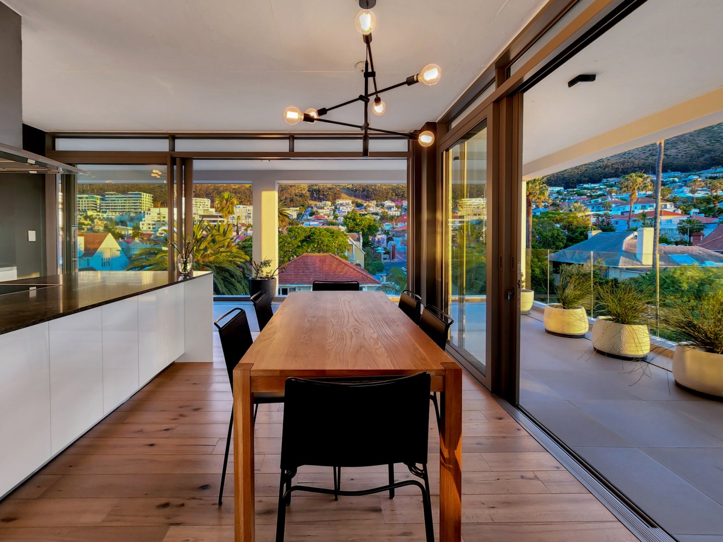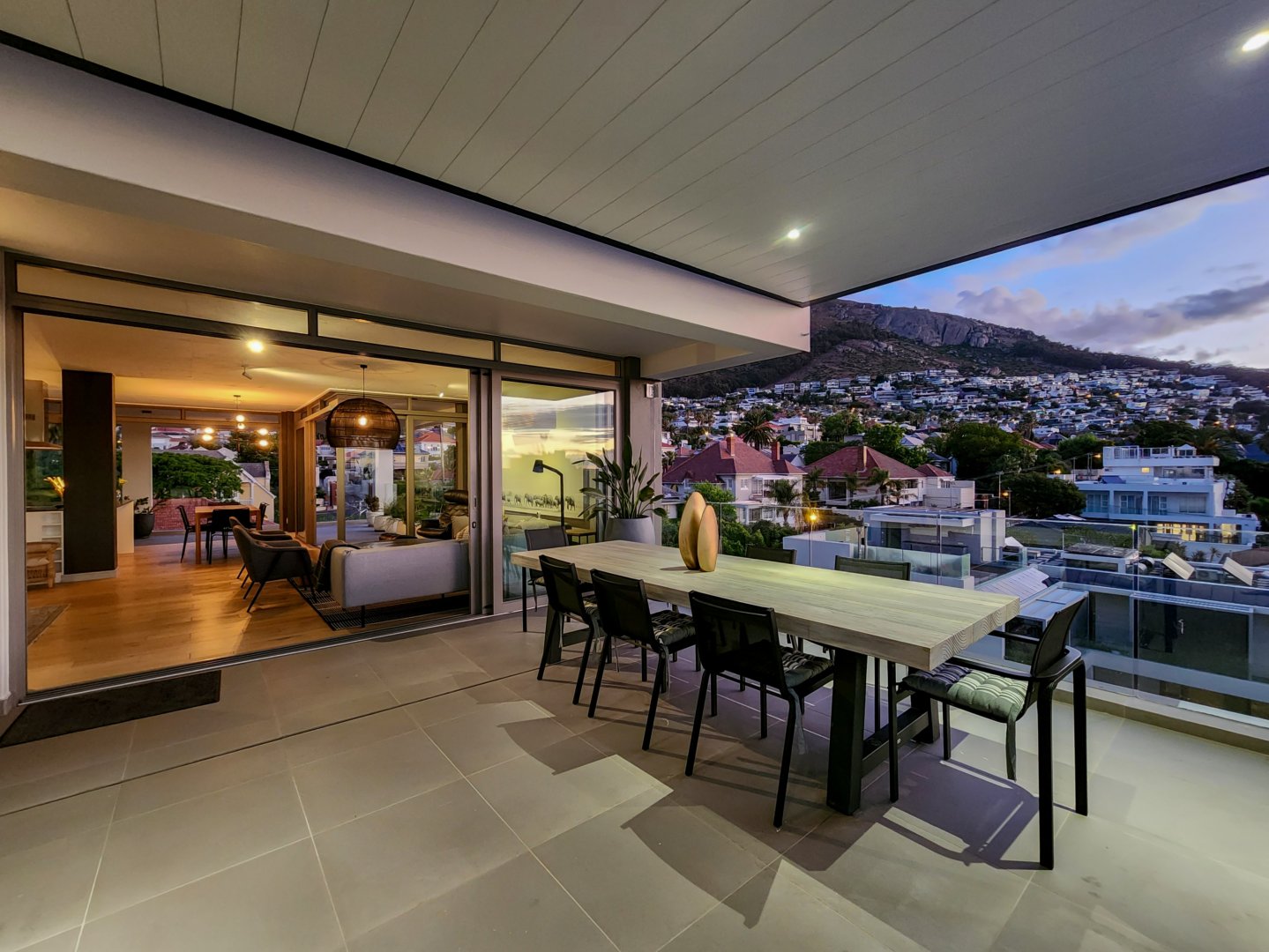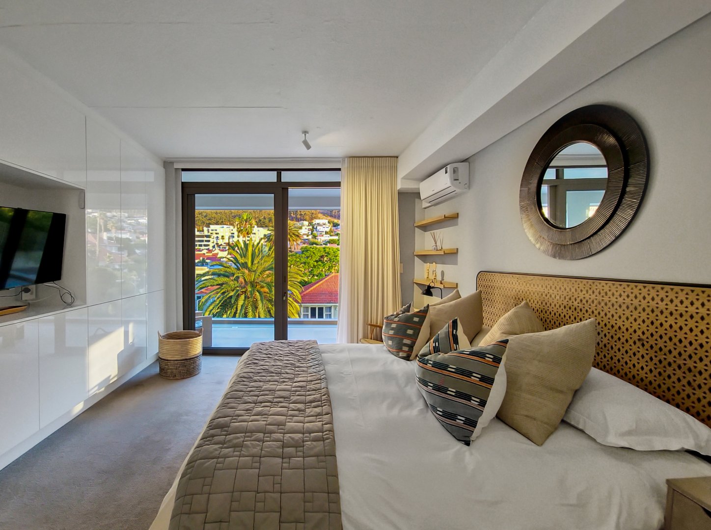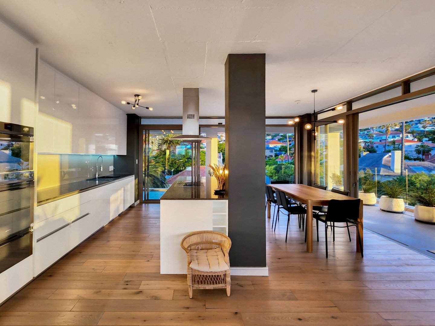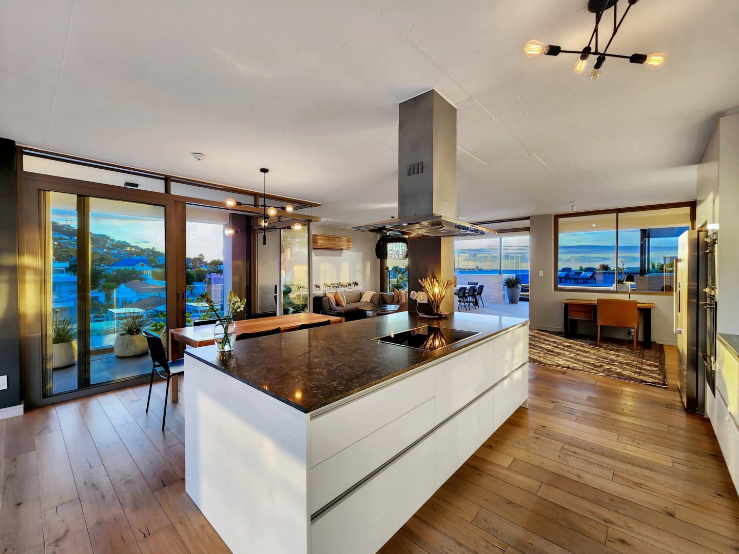 The three bedrooms contain built-in wardrobes, electric blackout blinds with linen curtains, entertainment units and air conditioning throughout. There are 2 beautiful en suite bathrooms each with underfloor heating. Besides the bedrooms is a versatile utility room for all cleaning needs. All 3 bedrooms connect to a wraparound balcony with views of Lion’s Head.