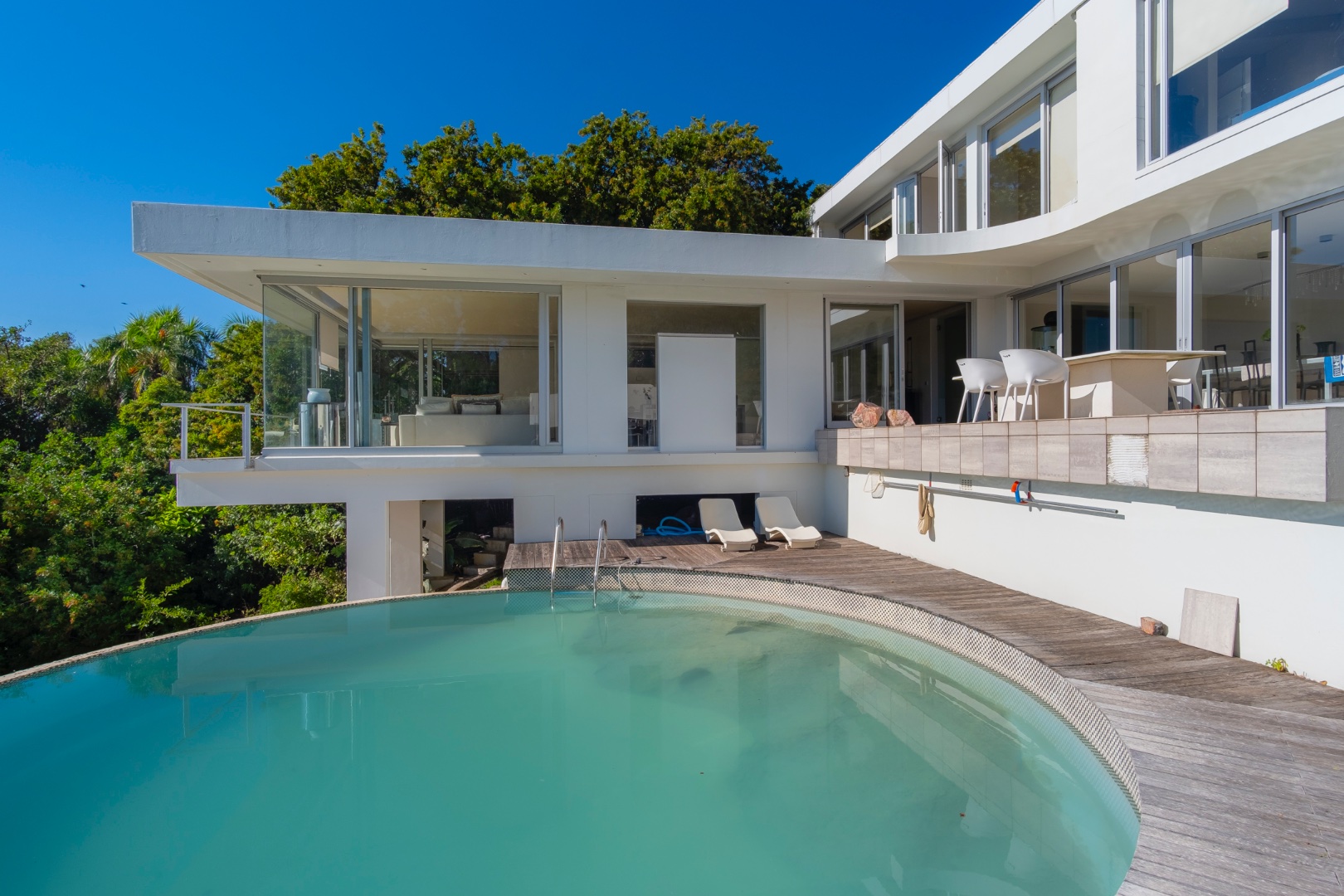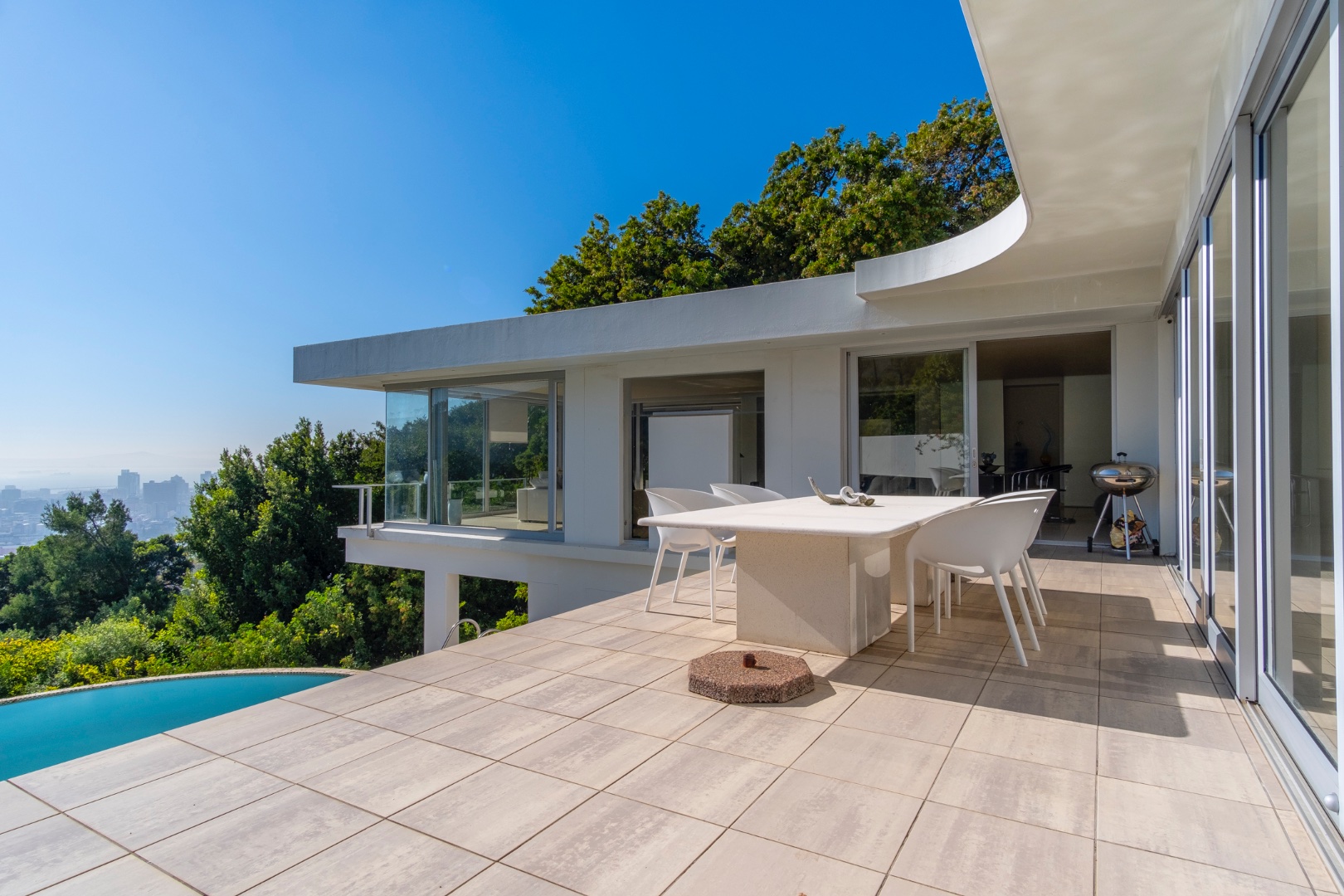 Leading outside from the dining area is a shaded courtyard, patio, large swimming pool and a pool house.
