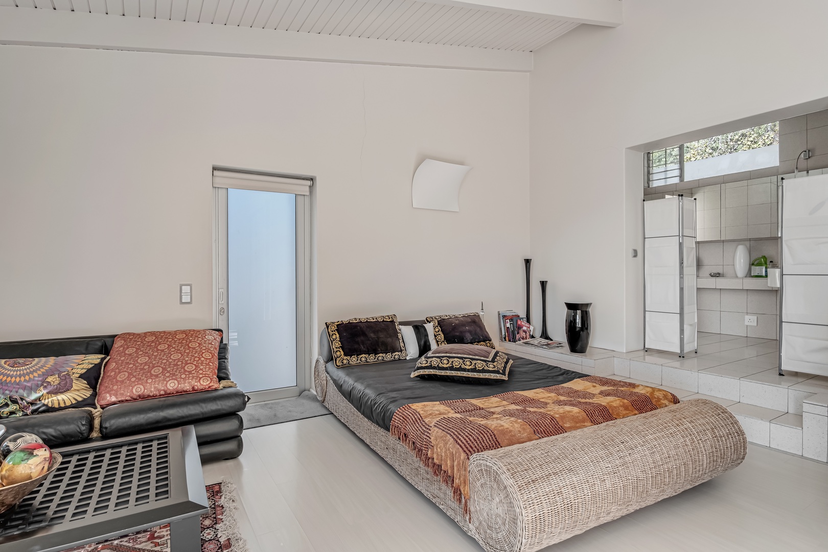 Another level down is a living room and entertainment area with a kitchen, a full bathroom and office space.