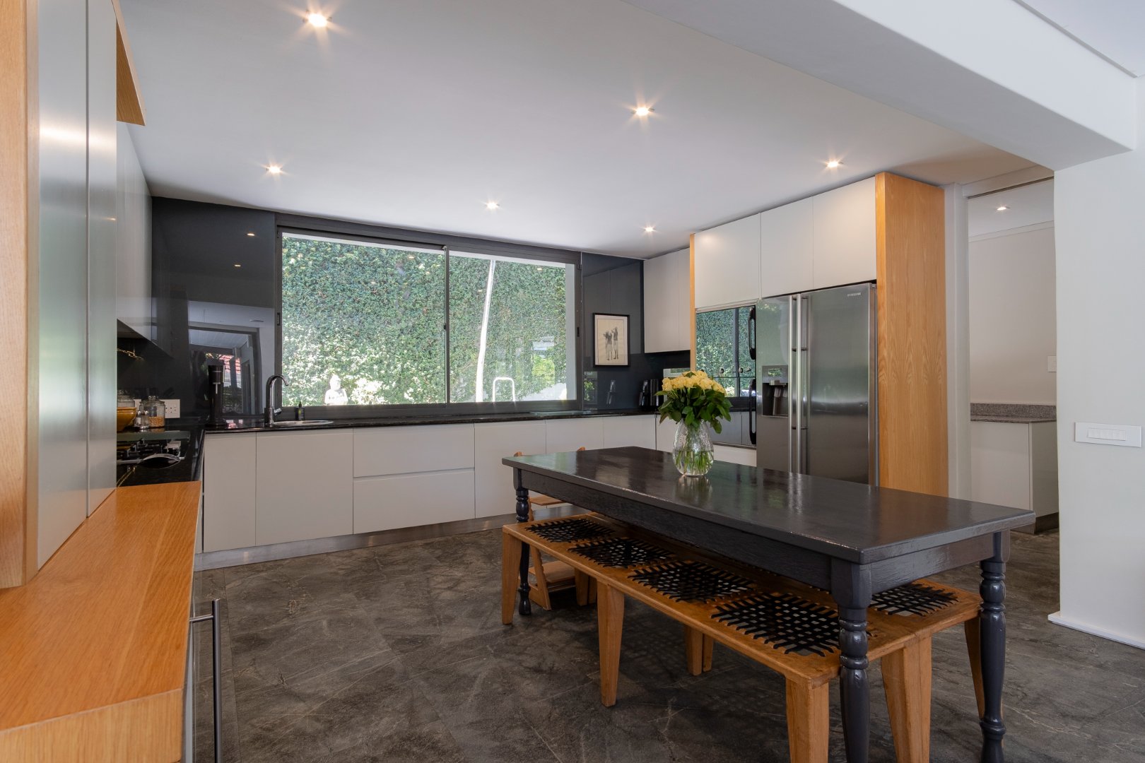 Downstairs, the home is designed for effortless entertaining. A formal lounge and dining room, complete with a wood-burning fireplace and a 14-seater table, open fully onto the patio through sliding and stacking doors. The fully fitted kitchen, with its adjoining scullery and pantry, is equipped with top-of-the-line appliances, while an informal lounge and TV room provide a relaxed space for family time. The fifth en-suite bedroom on this level opens directly onto the garden and patio, making it ideal for guests or extended family.