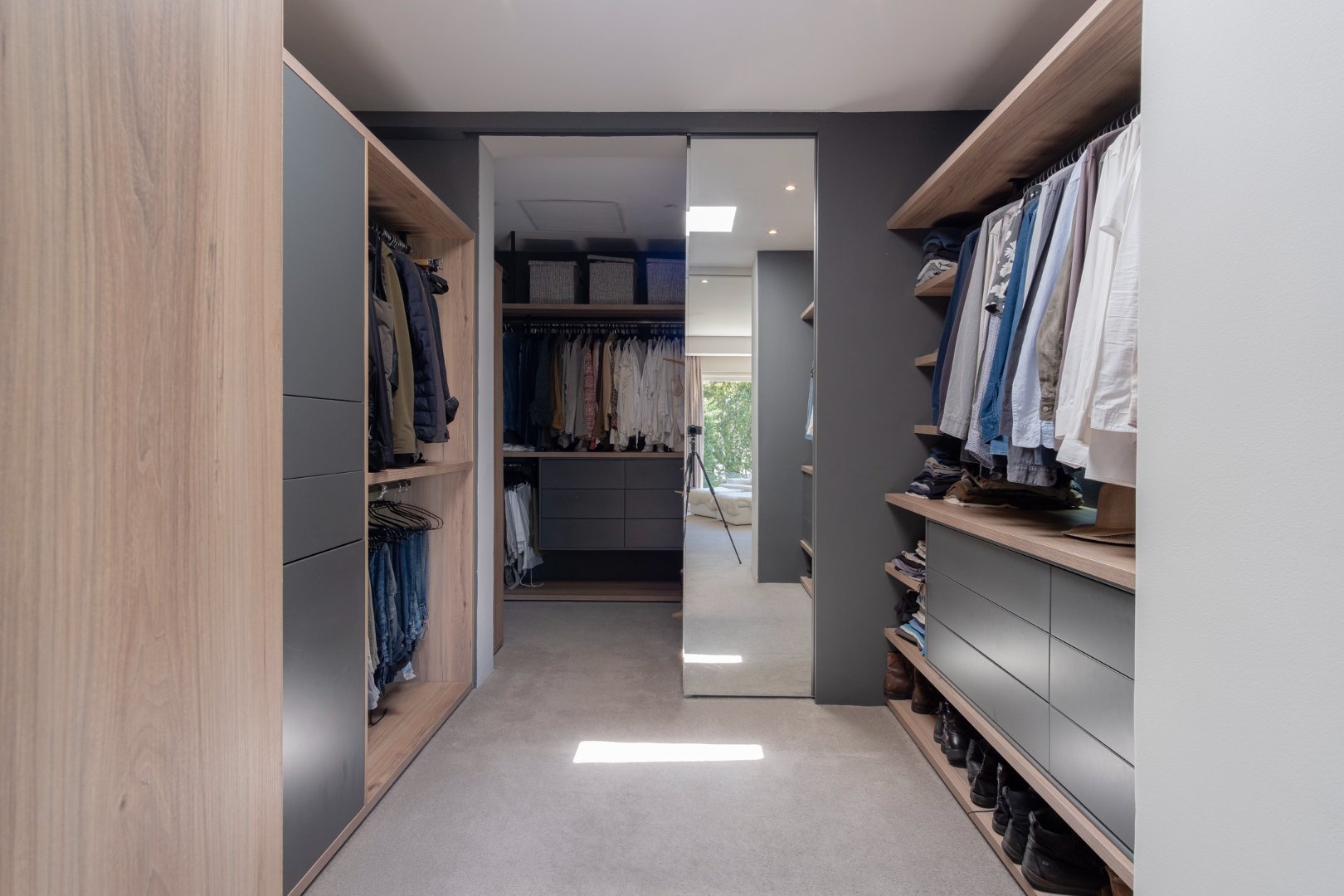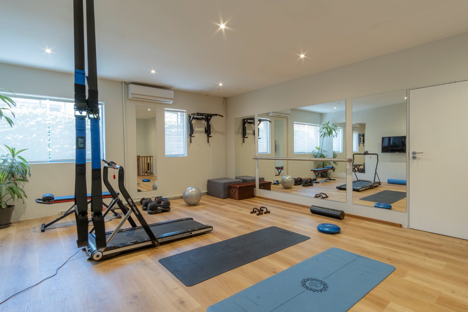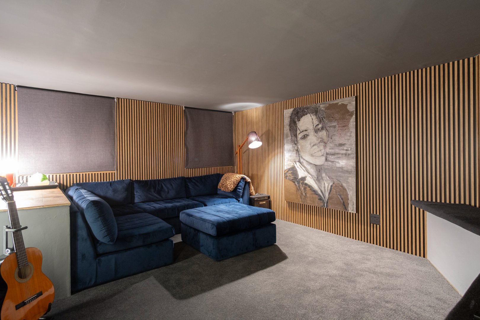 The upstairs level boasts a serene main bedroom with an en-suite bathroom and a private balcony. Three additional en-suite bedrooms offer comfort and privacy, with two opening onto their own balconies. A cozy pajama lounge lies at the heart of the upper level, leading out to a chill-out balcony with hanging chairs under a pergola and the dappled shade of the oak tree. Every upstairs room is equipped with air conditioning and underfloor heating for year-round comfort.