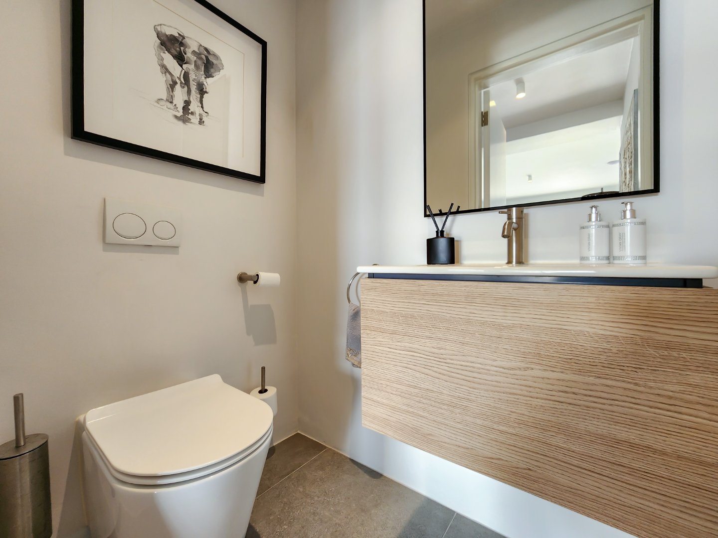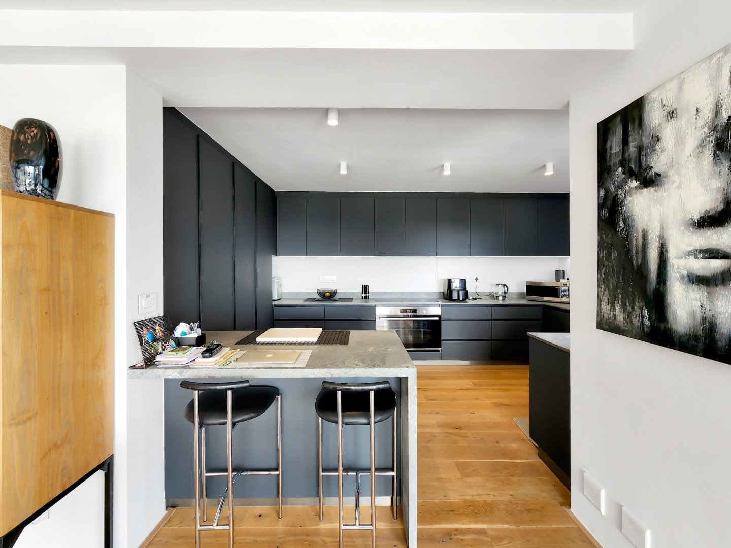 Upstairs, the master suite is a private retreat, complete with a freestanding bath, walk-in shower, and its own balcony. A second bedroom offers flexibility as a guest room or a tranquil home office. A second full bathroom and cleverly integrated storage solutions add to the apartment’s thoughtful design.