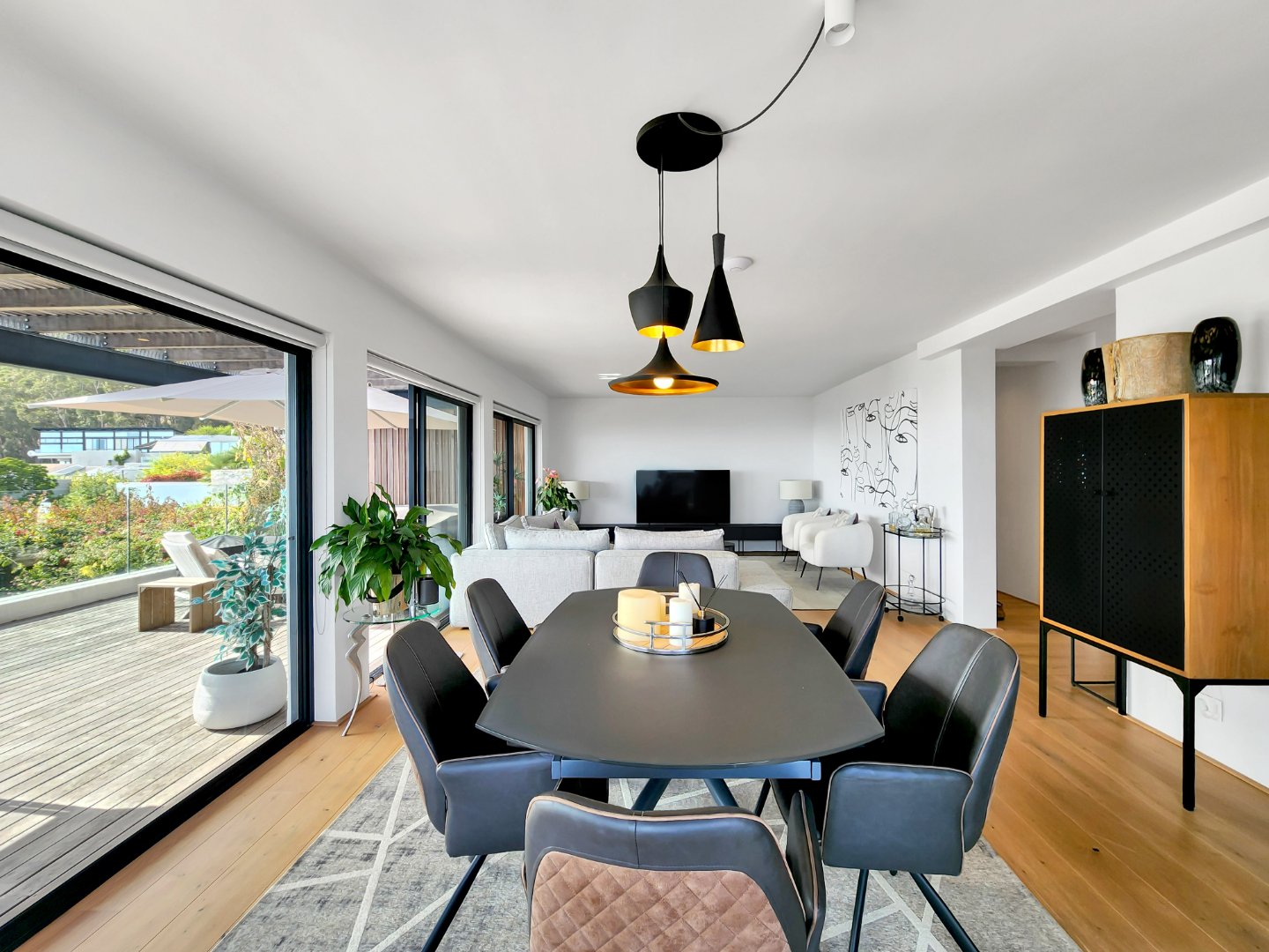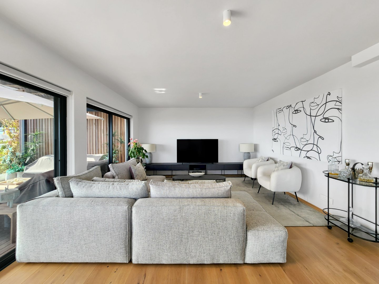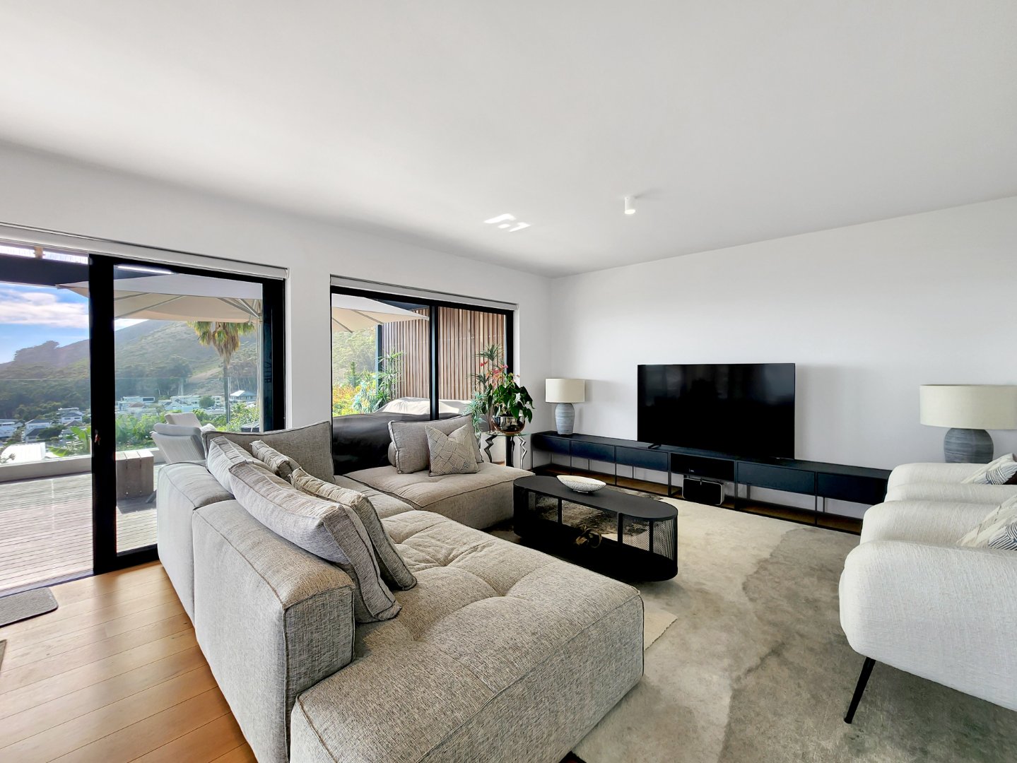 Natural light floods the interiors through floor-to-ceiling windows, accentuating the warm tones of engineered wooden flooring and highlighting the ever-changing views from every room. The lower level features a seamless open-plan layout with a stylish lounge, dining area, and modern kitchen complete with integrated appliances—all opening onto a spacious deck, perfect for sunset entertaining.