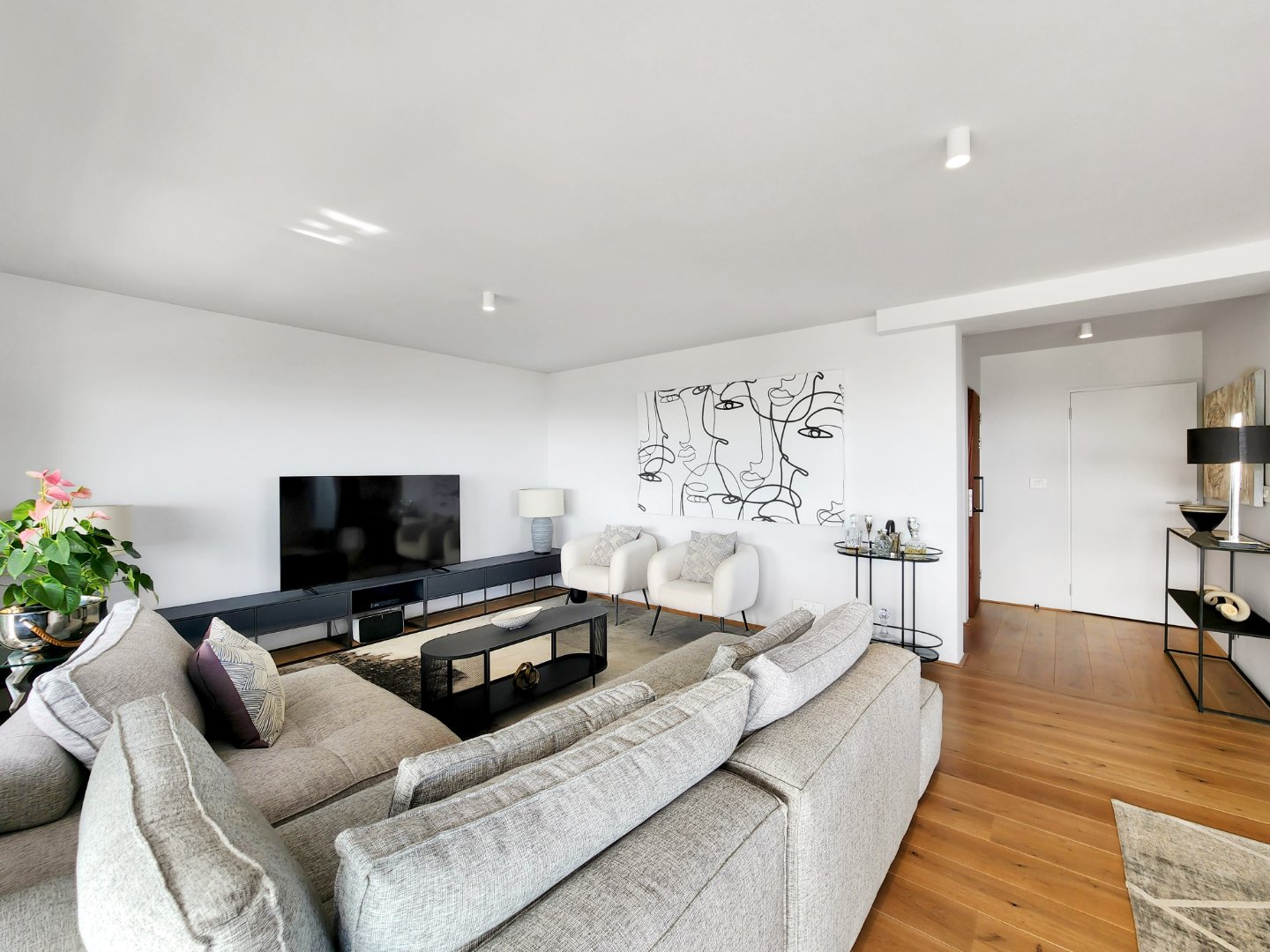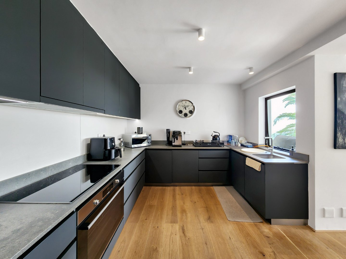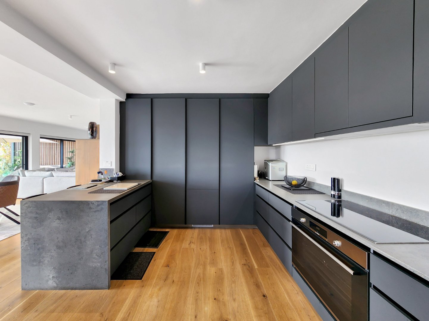 Natural light floods the interiors through floor-to-ceiling windows, accentuating the warm tones of engineered wooden flooring and highlighting the ever-changing views from every room. The lower level features a seamless open-plan layout with a stylish lounge, dining area, and modern kitchen complete with integrated appliances—all opening onto a spacious deck, perfect for sunset entertaining.