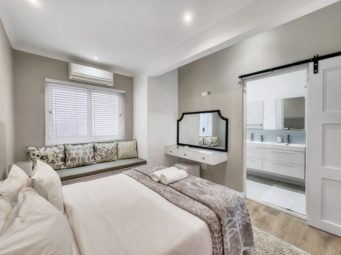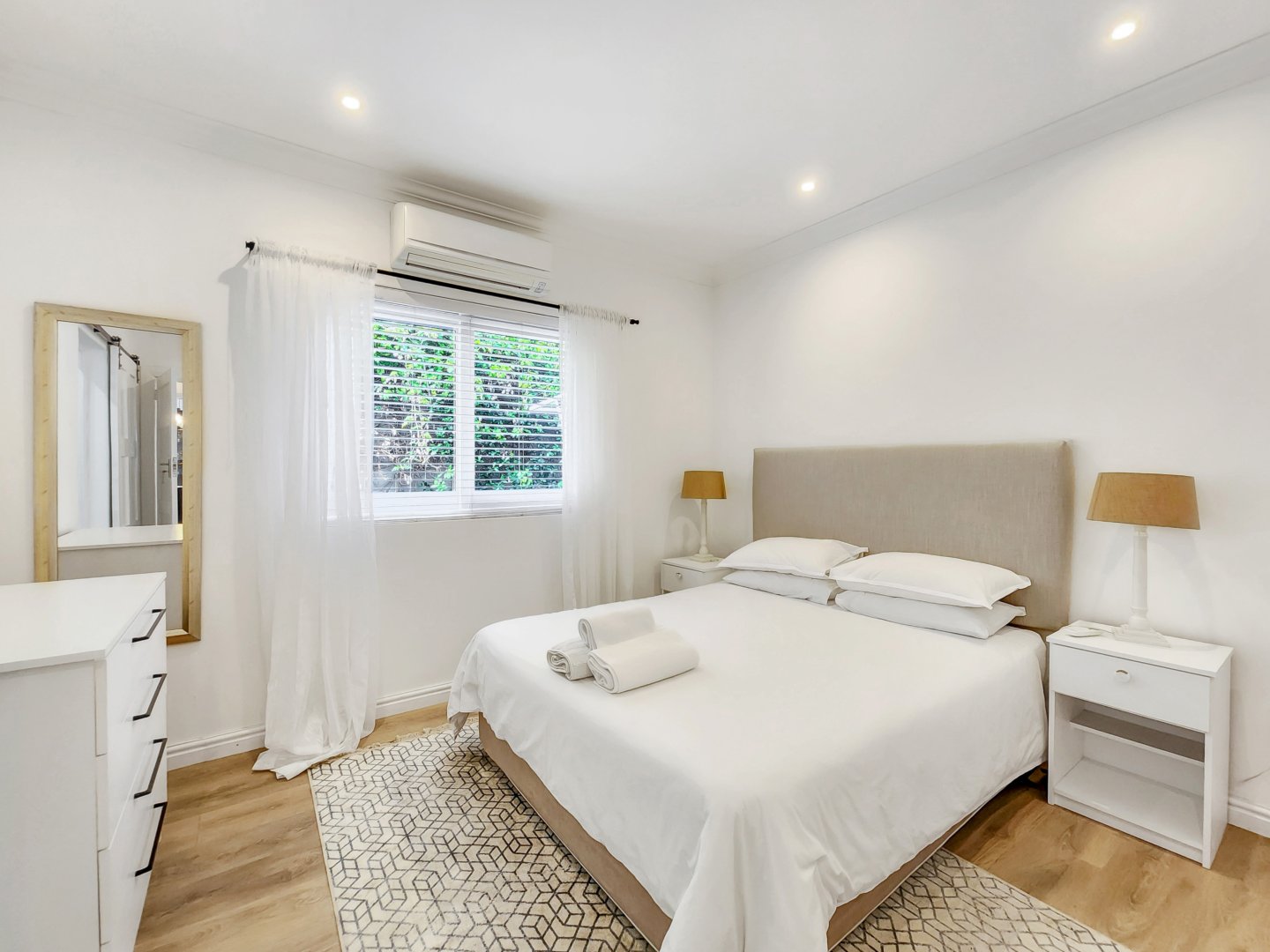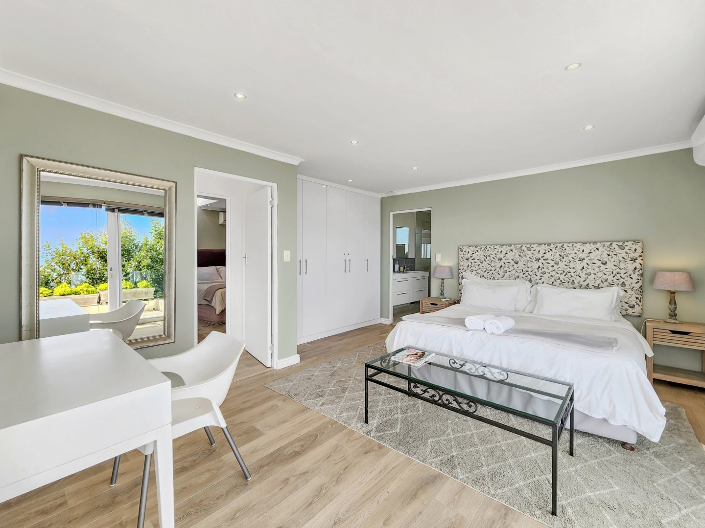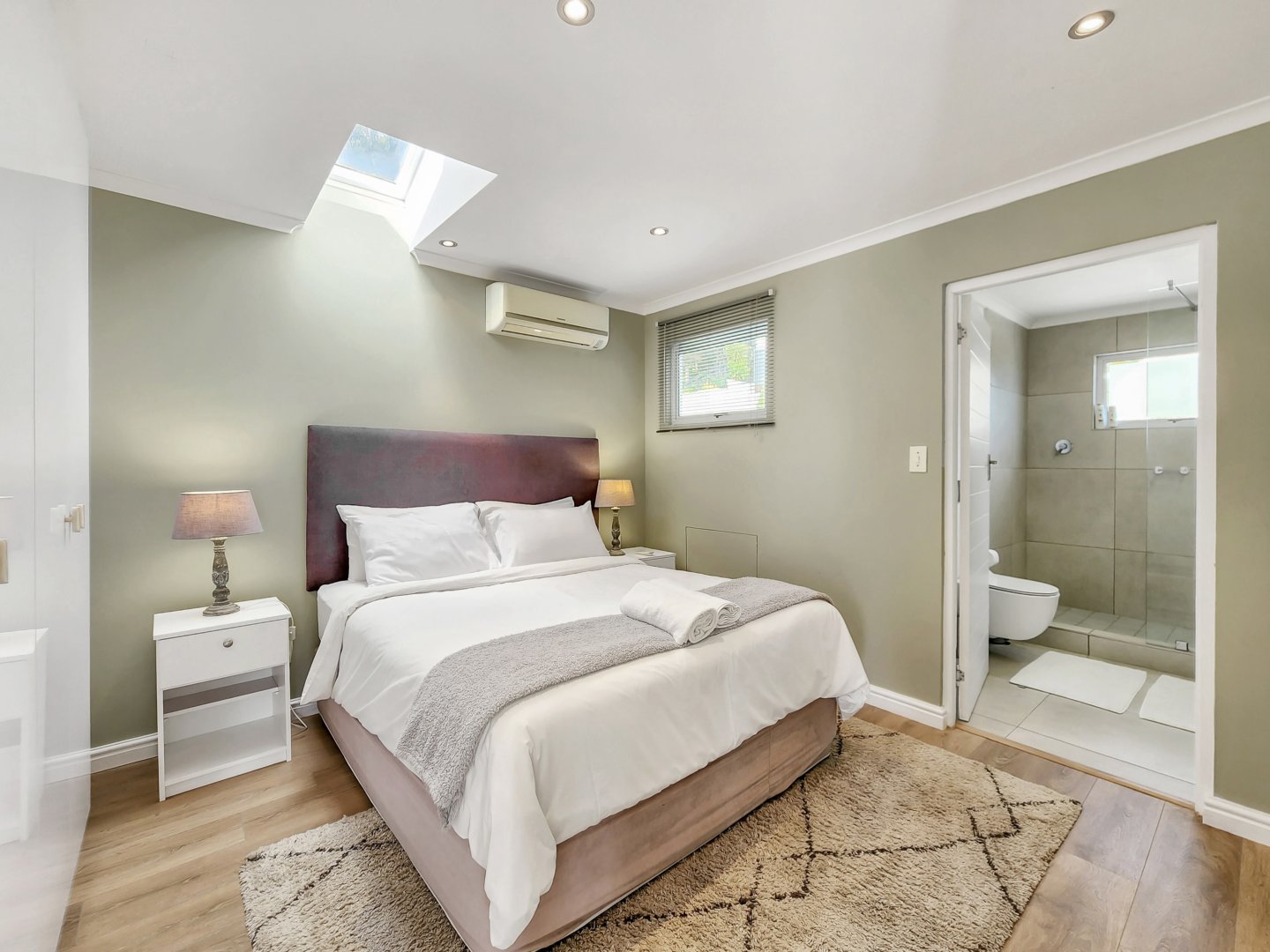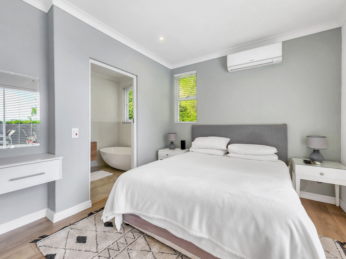 Three bedrooms are situated on the same level as the living spaces and the generously sized open-plan kitchen and dining area. Each of these bedrooms features air conditioning and an en-suite bathroom – two with showers only, and the primary one boasting a complete bathroom with a freestanding bathtub and sliding doors that lead onto the garden.