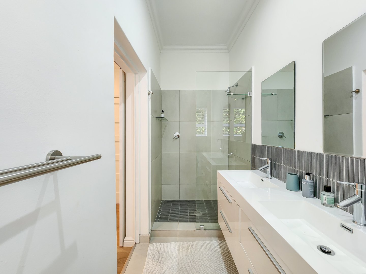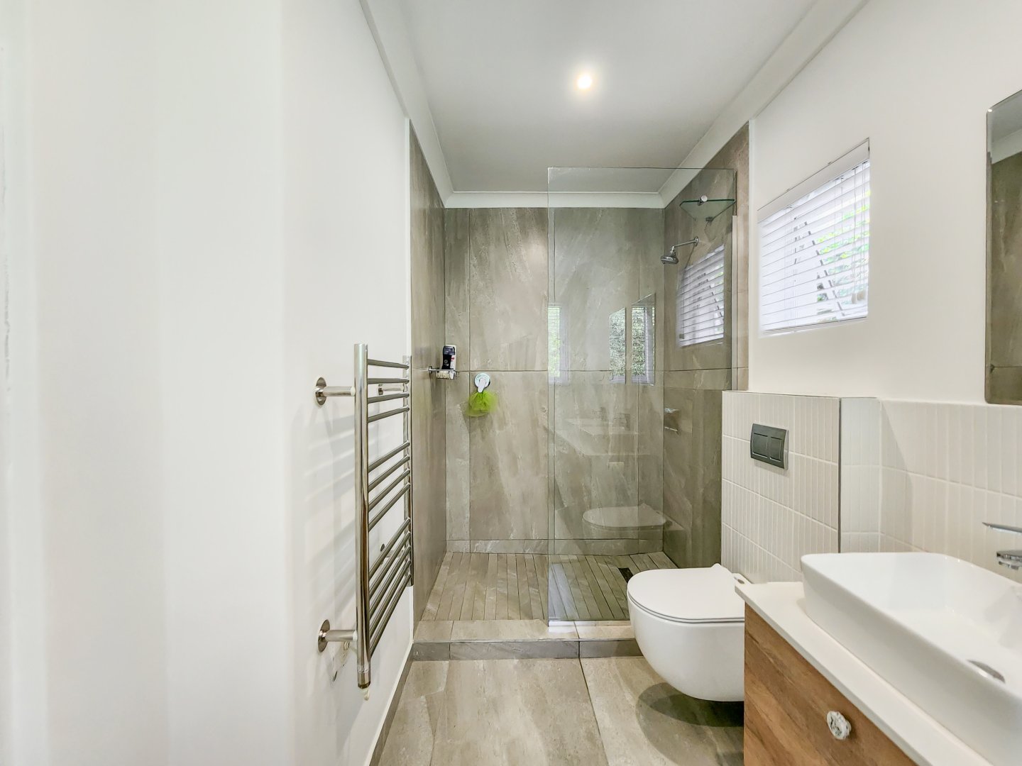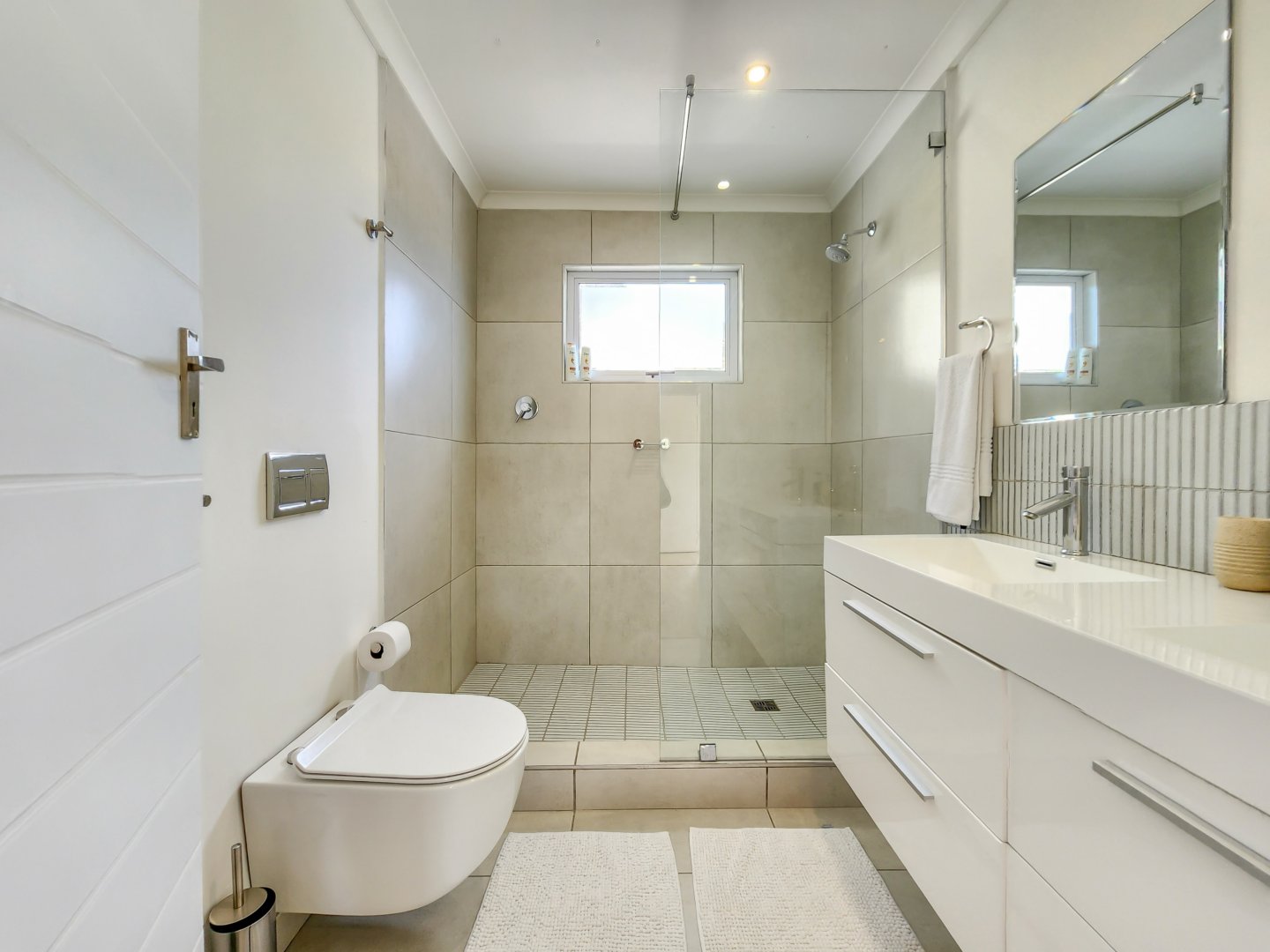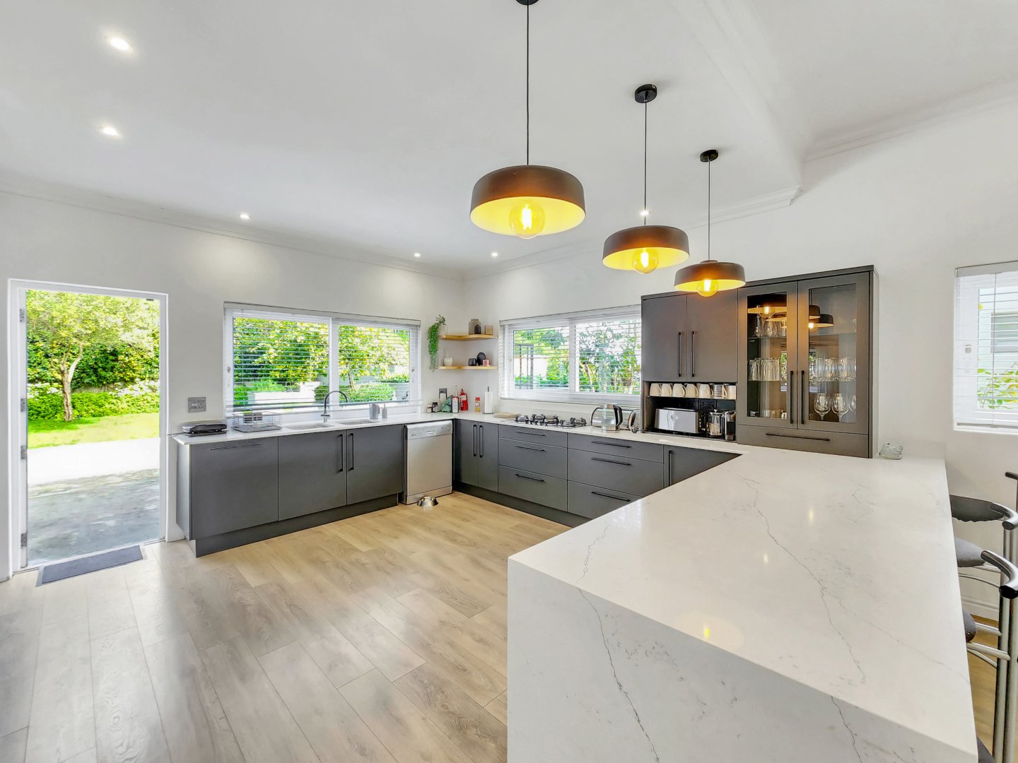 Three bedrooms are situated on the same level as the living spaces and the generously sized open-plan kitchen and dining area. Each of these bedrooms features air conditioning and an en-suite bathroom – two with showers only, and the primary one boasting a complete bathroom with a freestanding bathtub and sliding doors that lead onto the garden.