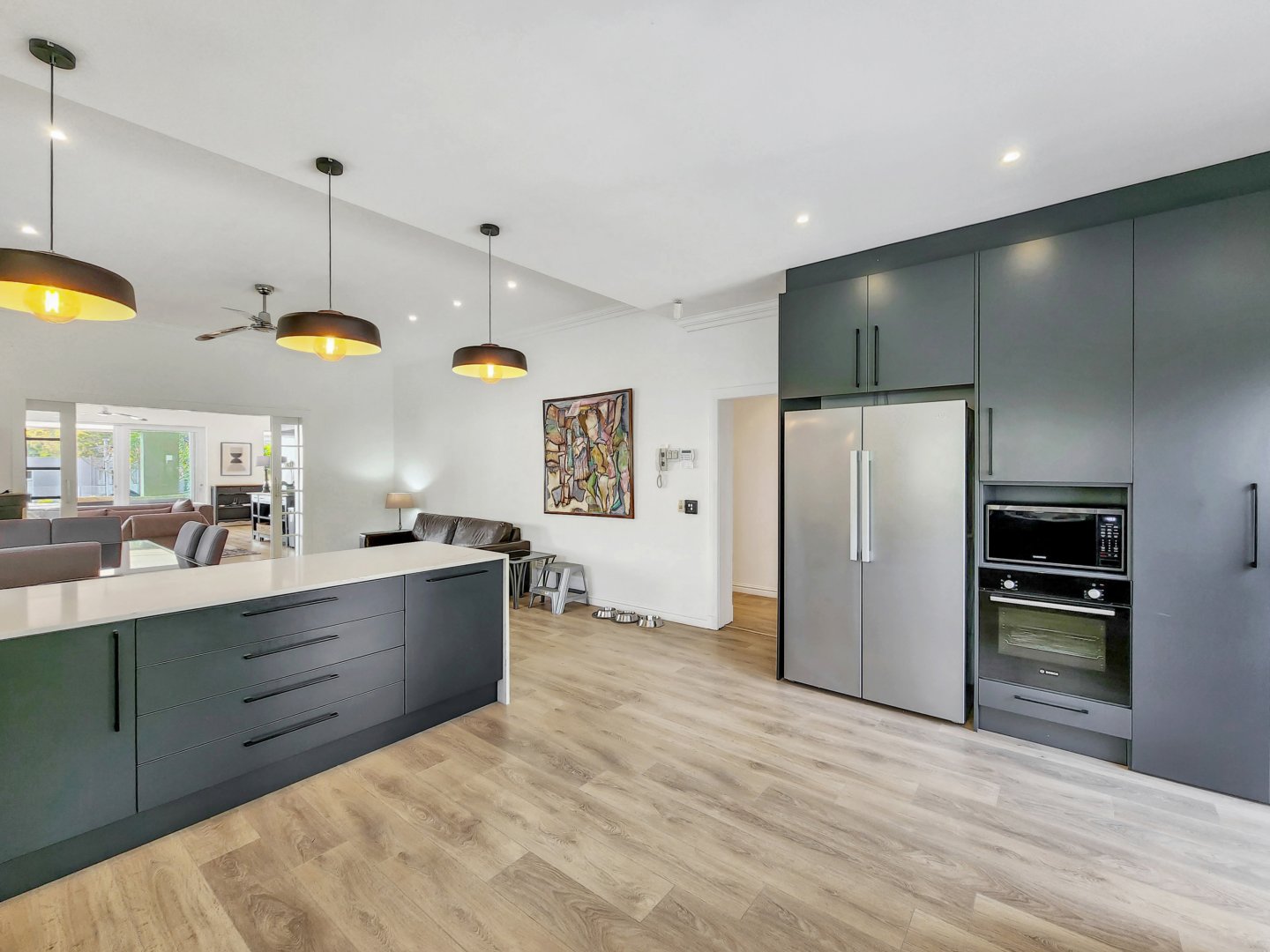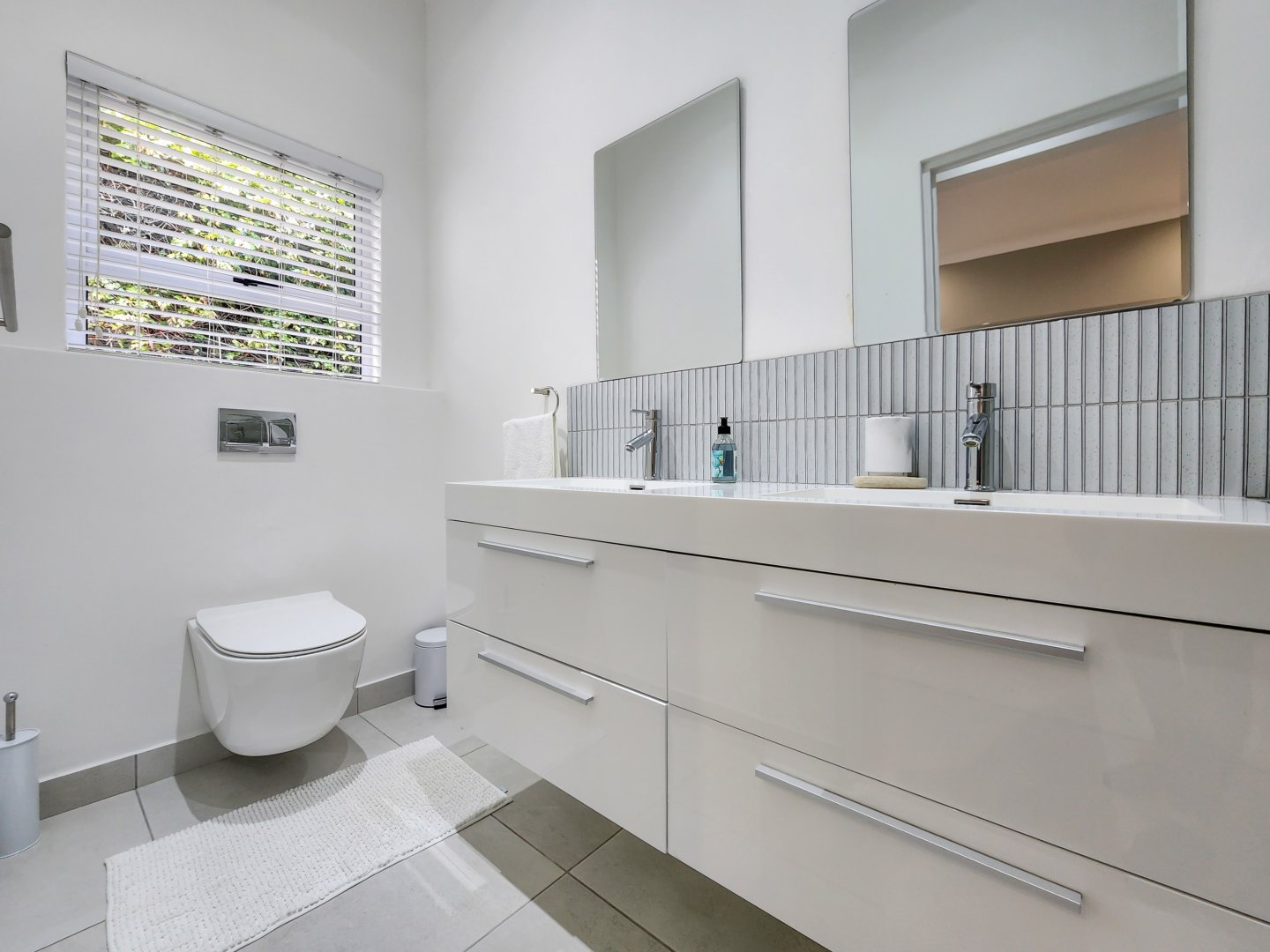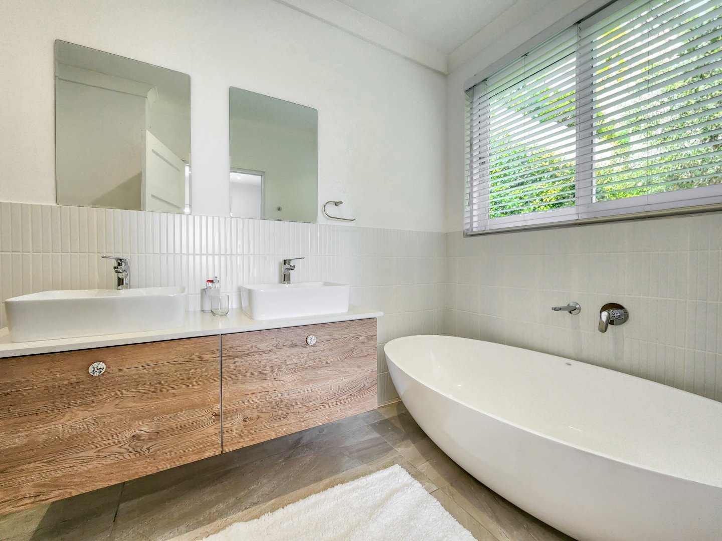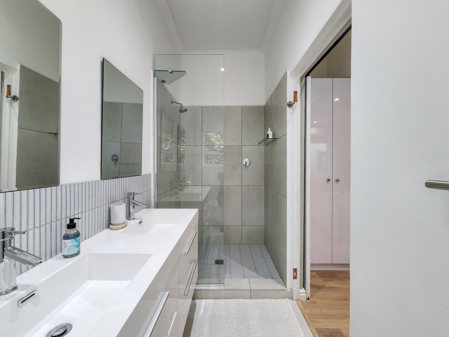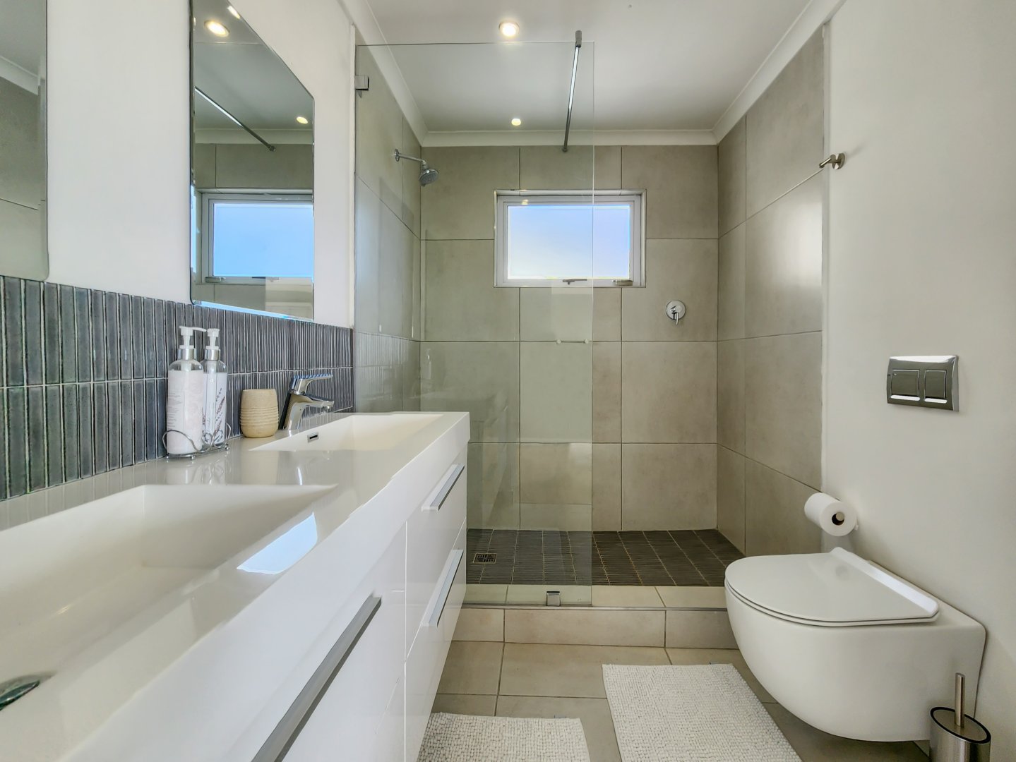 Three bedrooms are situated on the same level as the living spaces and the generously sized open-plan kitchen and dining area. Each of these bedrooms features air conditioning and an en-suite bathroom – two with showers only, and the primary one boasting a complete bathroom with a freestanding bathtub and sliding doors that lead onto the garden.